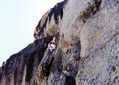 At the first rap (we used a 7-mm 50-meter rope to make our double-rope rappels) we neglected to test by having the first person down pull to see if the rope pulls easily. So, after I rapelled down to David, we discovered that we could not pull the rope. Aaaargh! The solution, as some of you will know, is to prusik up 150 feet and rearrange the ropes. David volunteered, but I was feeling better and had both recent and past prusiking experience, so I went up. This is surely the worst way to ascend something as beautiful as the Kraus-McCarthy route. It was a physical effort to gain 150 feet five inches at a time, but I got there and reset the rappel five feet lower, leaving some gear, and flew down the rappel. The next four raps went fine. At all these we arranged the knot so we pulled on the thin 7-mm line; I think this is a mistake; pulling on the large rope gives more weight to the pull and less weight to be pulled. One is not allowed many mistakes in this sport.