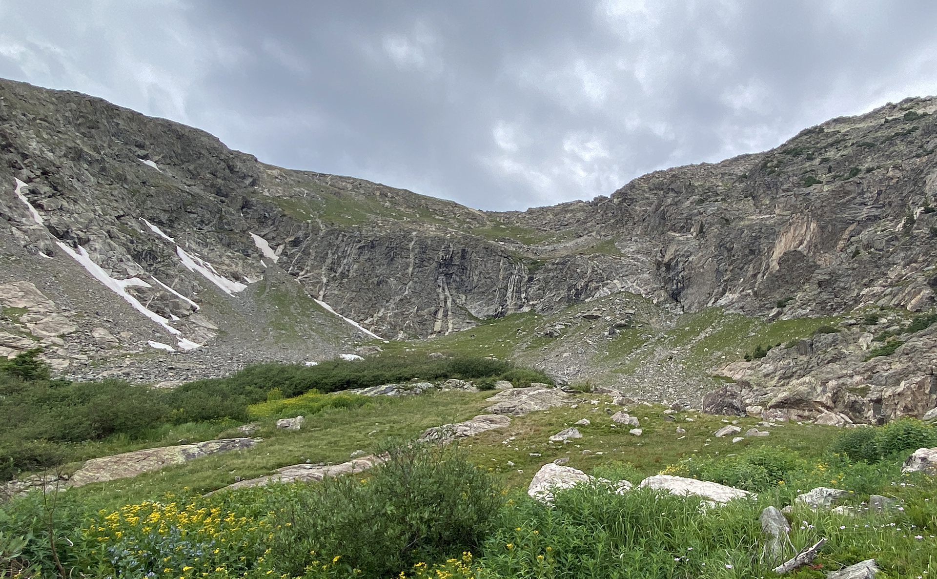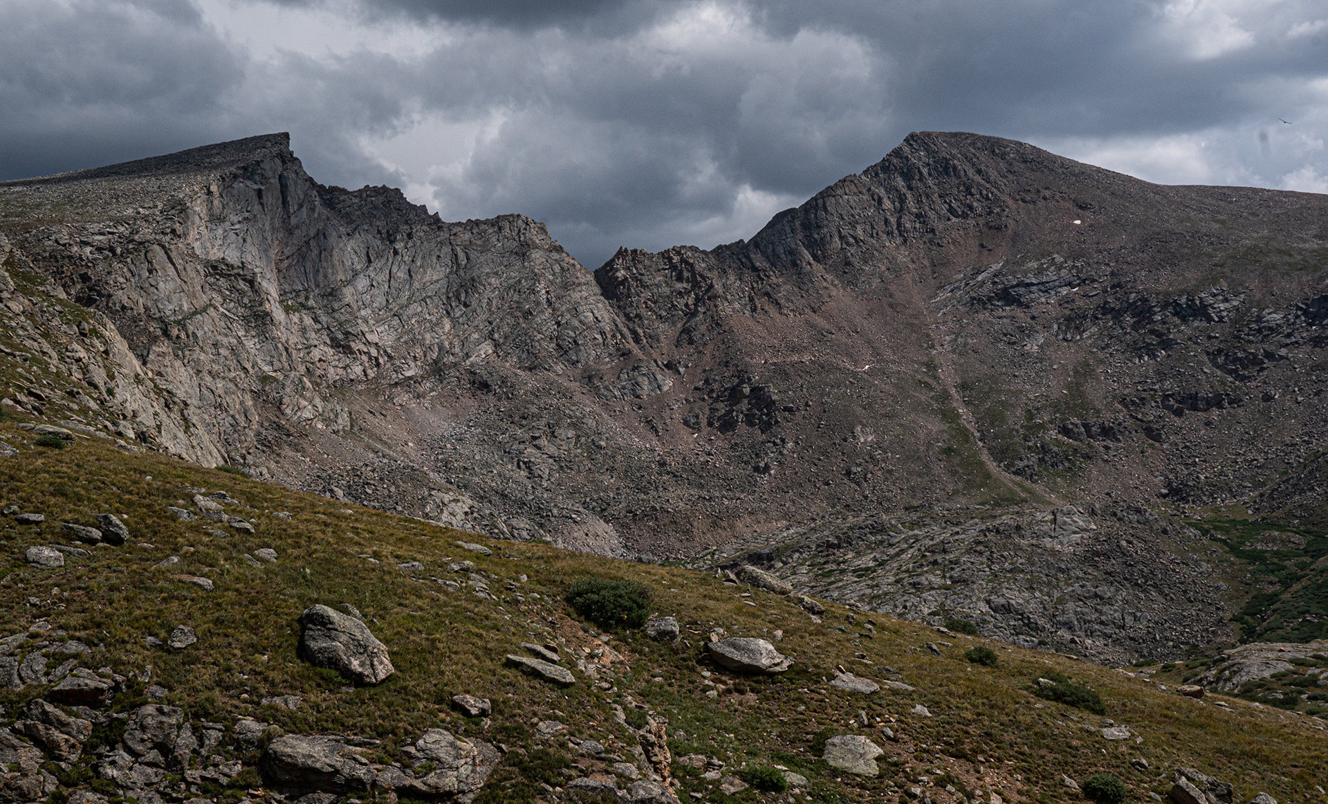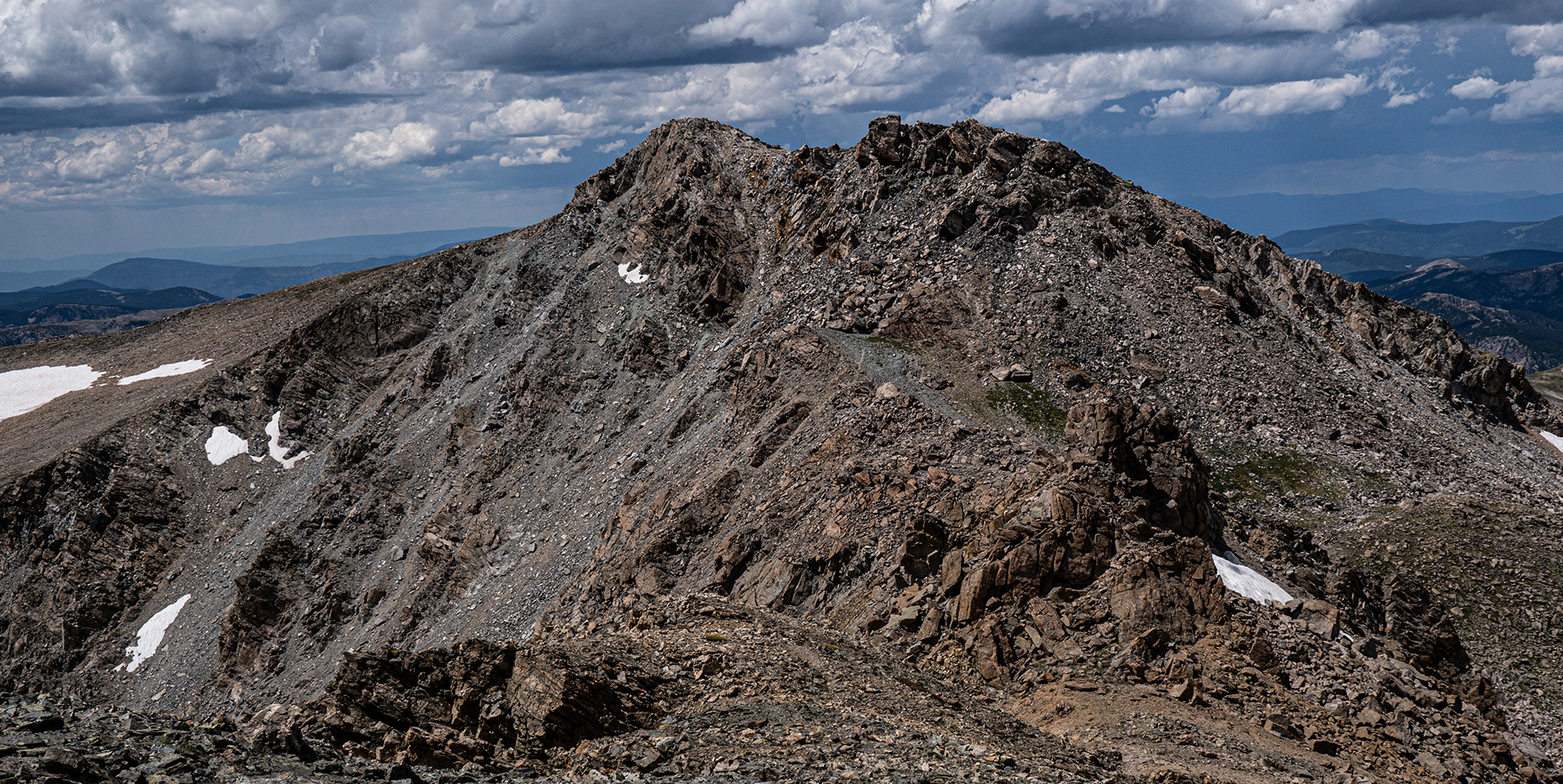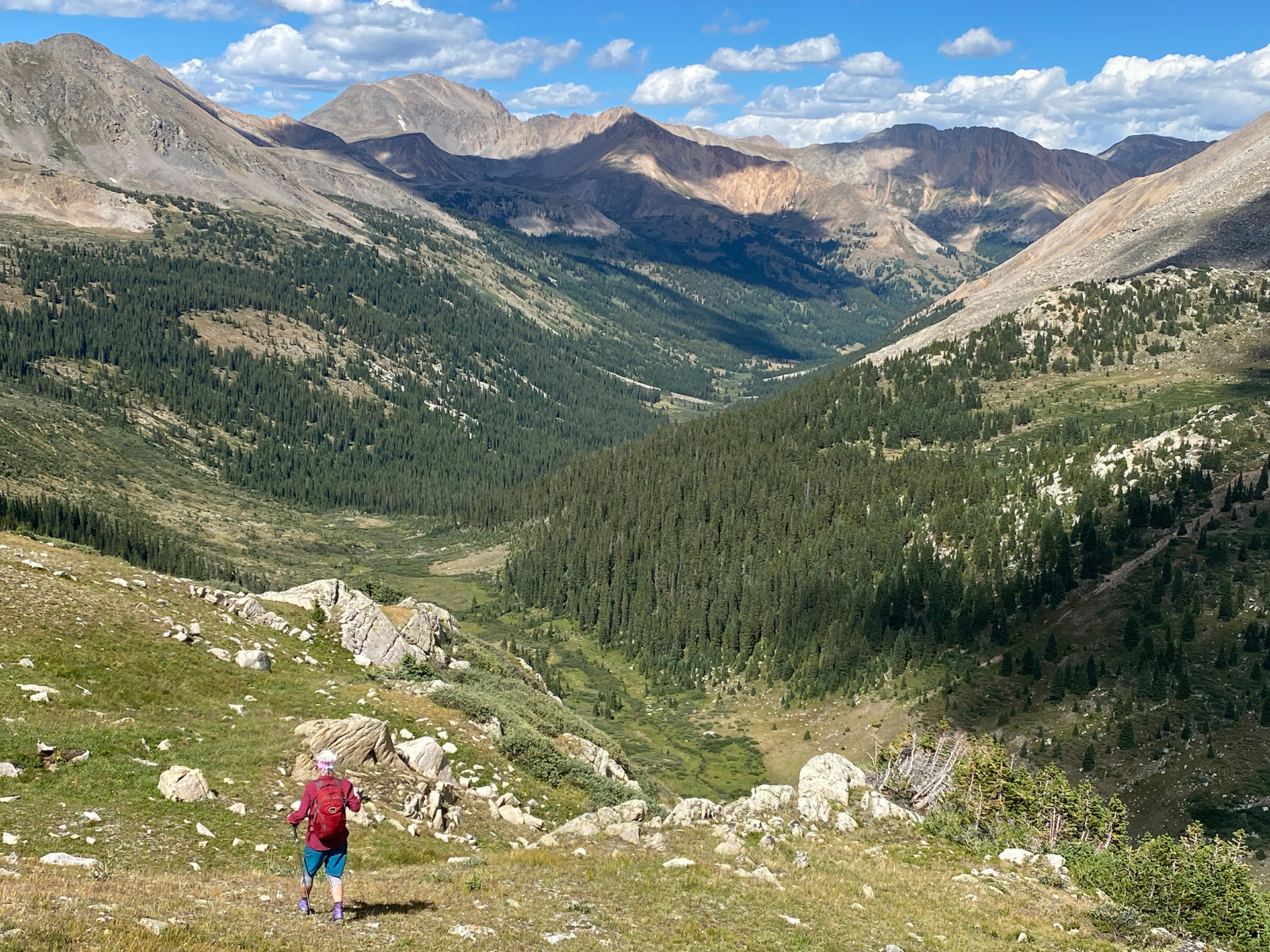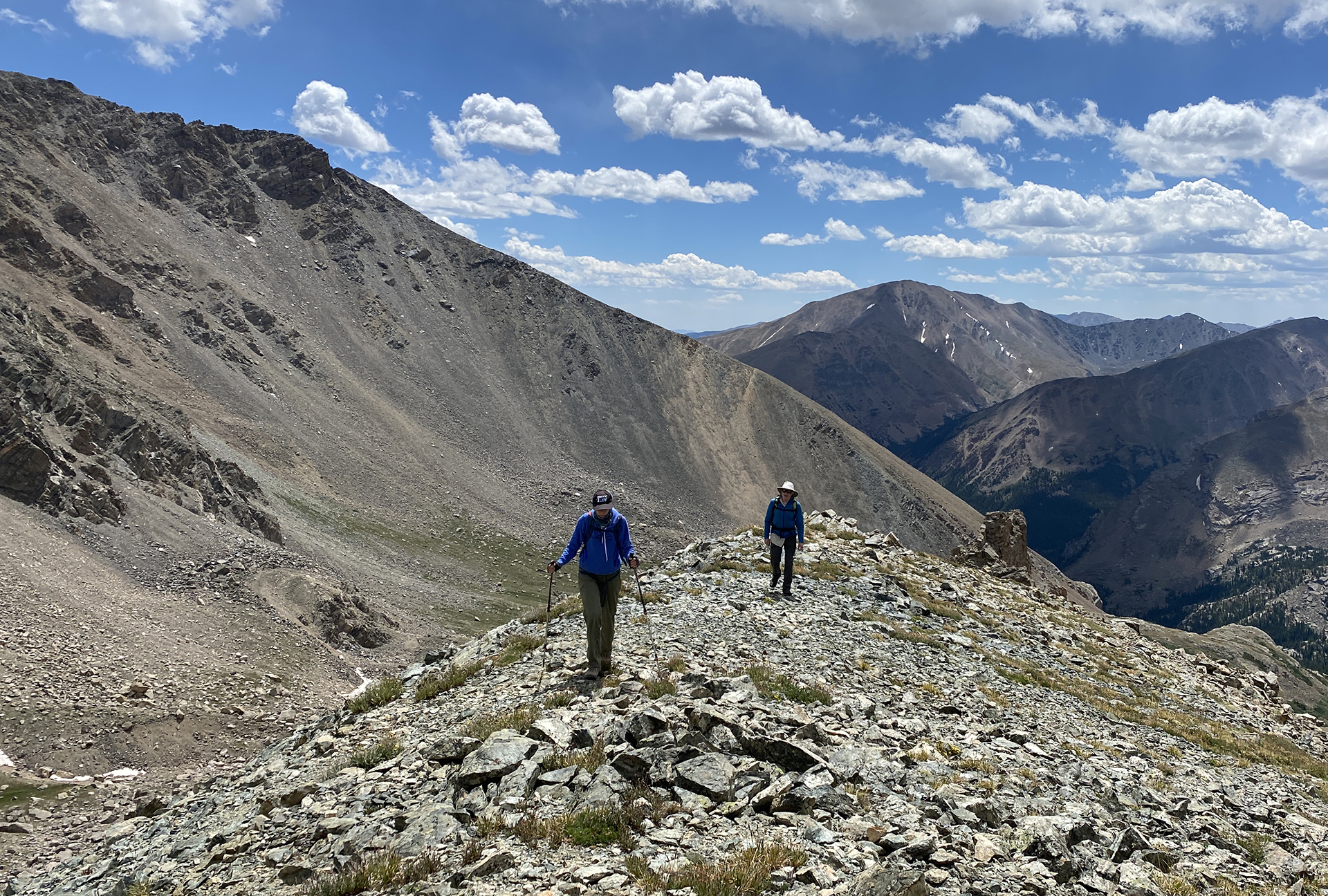The highlight was a climb, with Katie Larson, of Grizzly E, the lowest of the five peaks in Colorado named Grizzly. This required a long approach in the Lake Creek valley behind Winfield. Matt Cary and I climbed the Buffalo Caldera; the deadfall in the first part of the climb was really awful. I had wanted to see the newish west trail on Mt. Massive, and David Blakeslee, Janet Jacks, and I climbed North Mt. Massive via the North Halfmoon Lakes and then went to Massive along the beautiful ridge. And then we descended that west side trail; no problem but it was a tedious descent of 4000 feet. And Katie and I did a massive loop from Guanella Pass, climbing a beautiful long ridge to gain the high ground north of Mt. Rosalie (Note: Rosalie was the initial name of Mt. Evans, now Mt. Blue Sky.) Then we hitchhiked to the top of Mt. Blue Sky and took the trail to the usual descent route of the Sawtooth to reach Guanella Pass. 14.7 miles on foot.