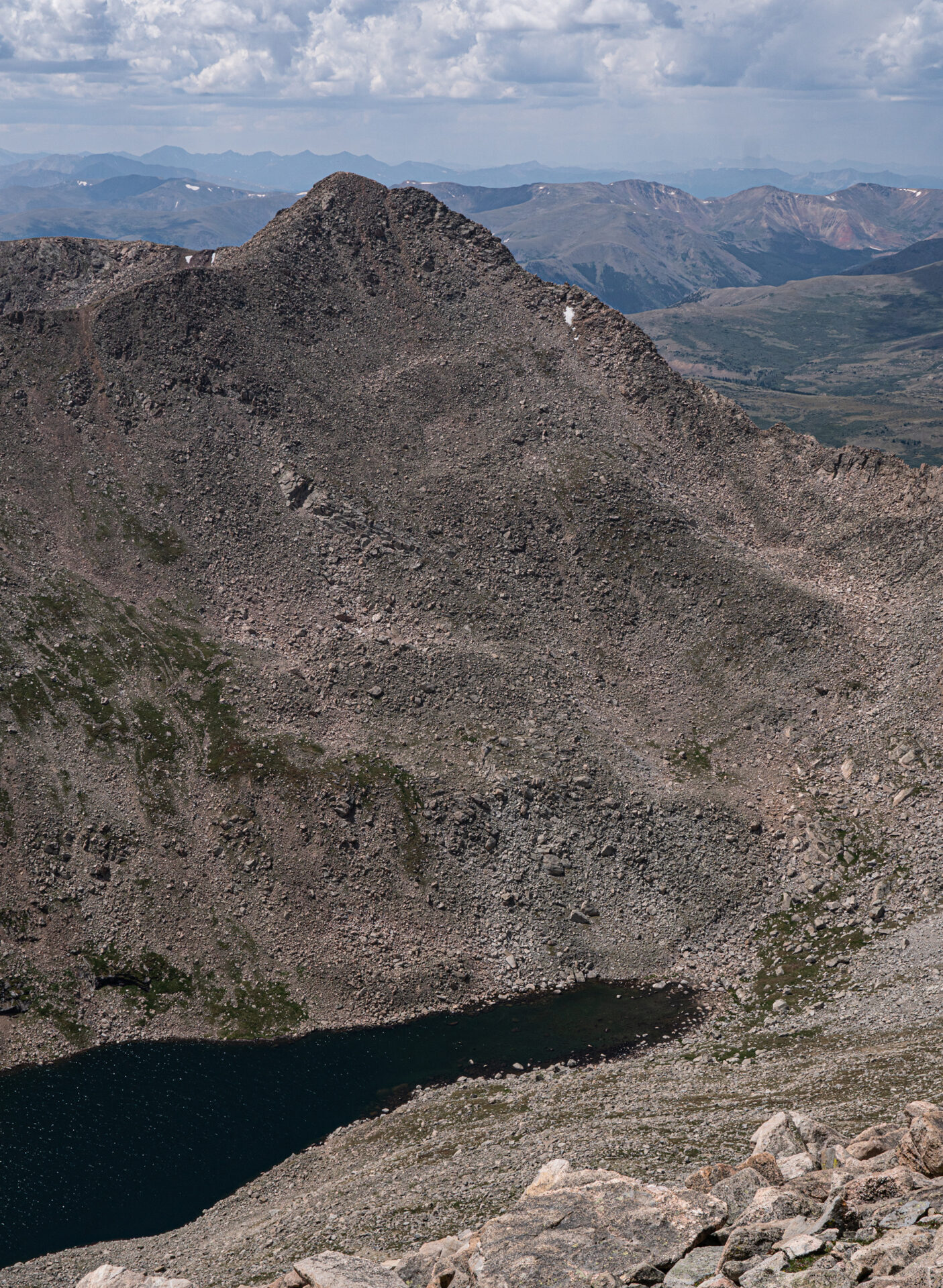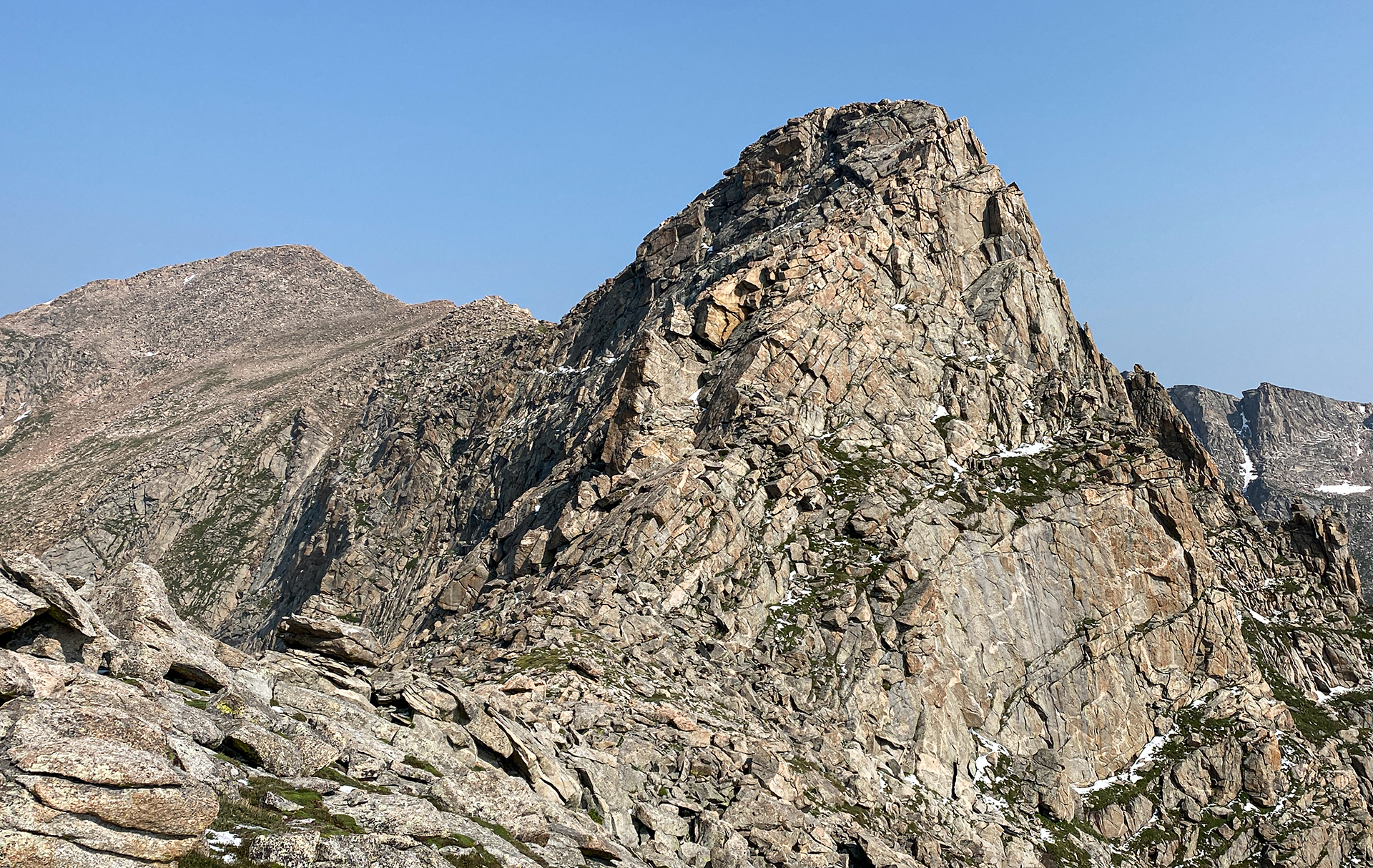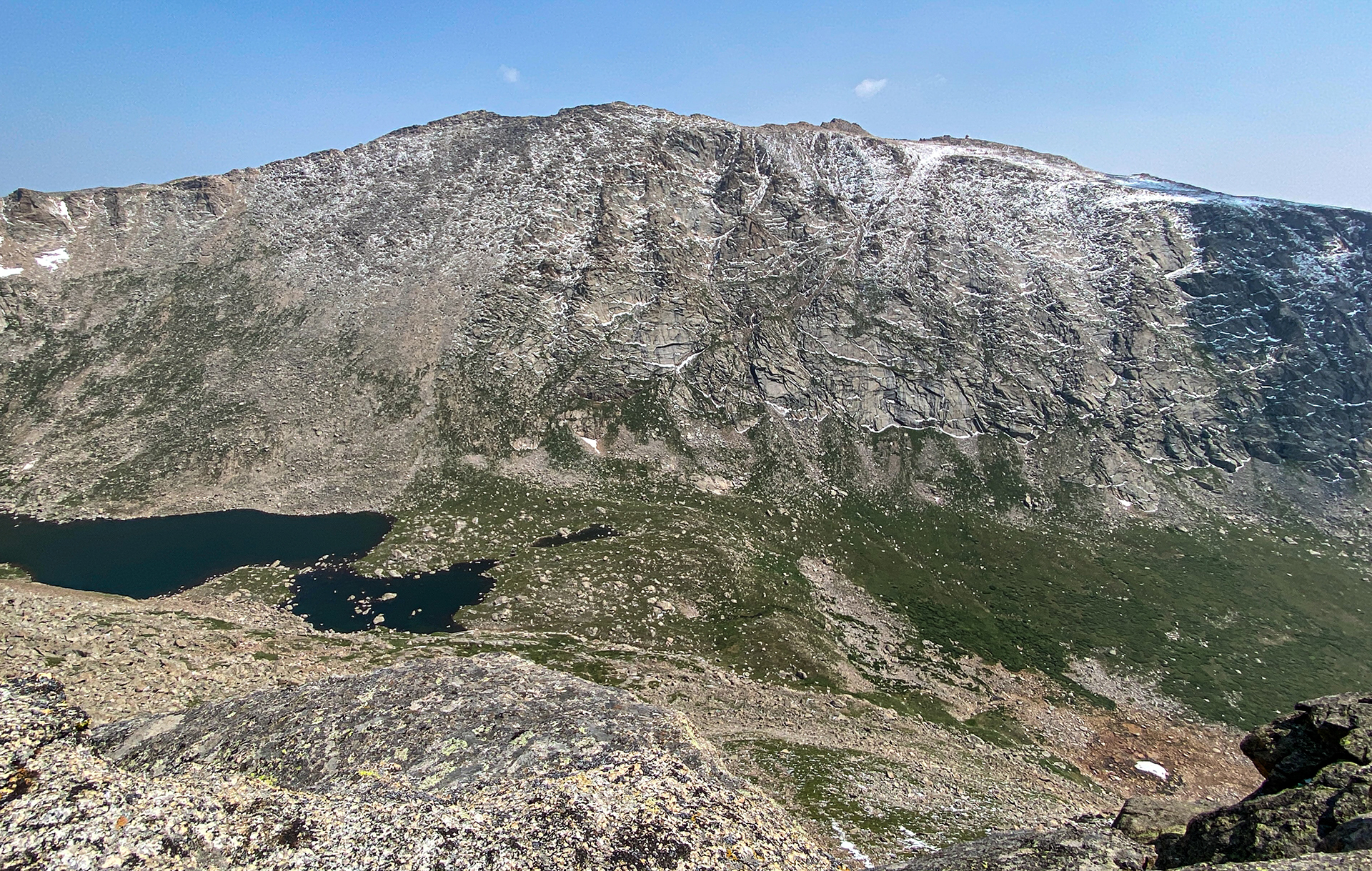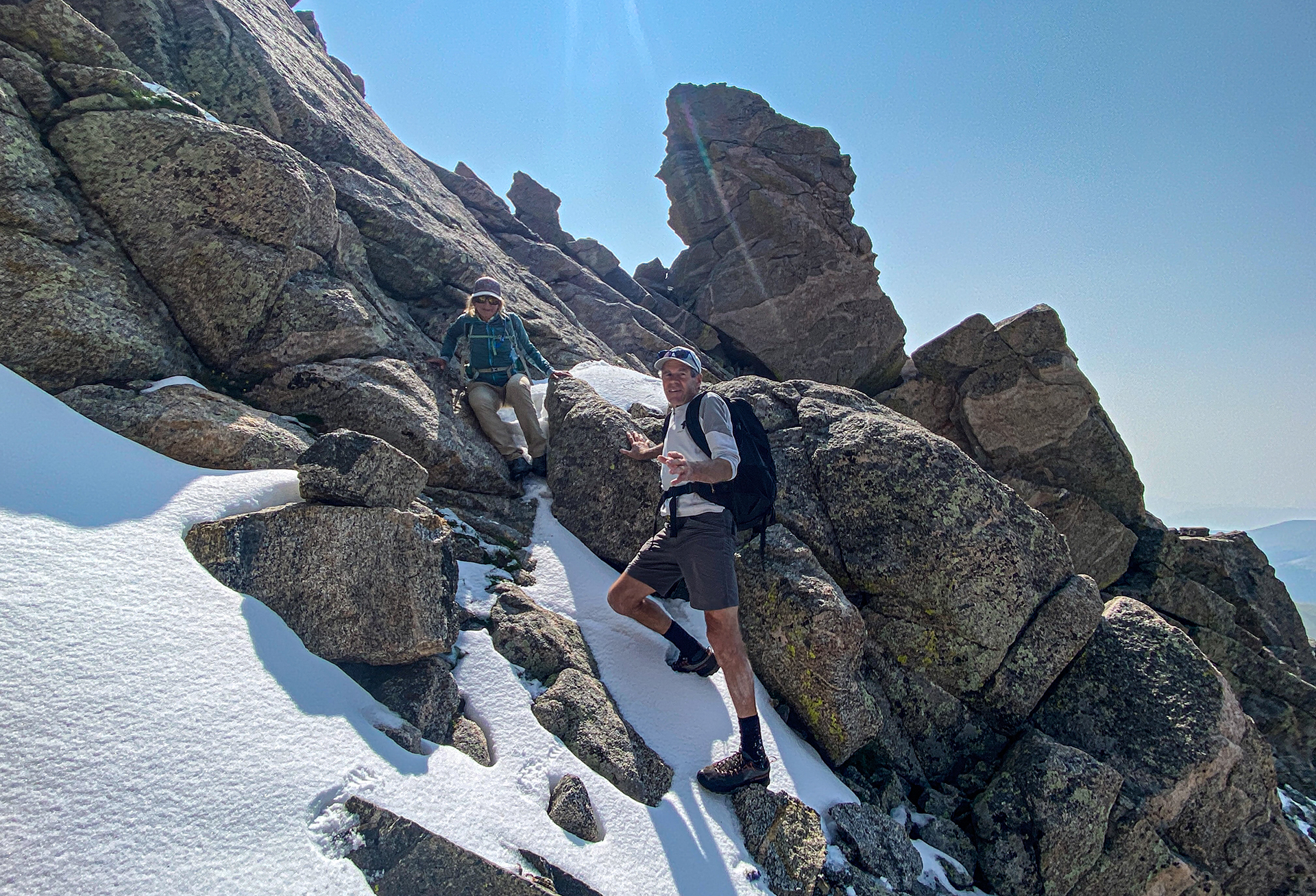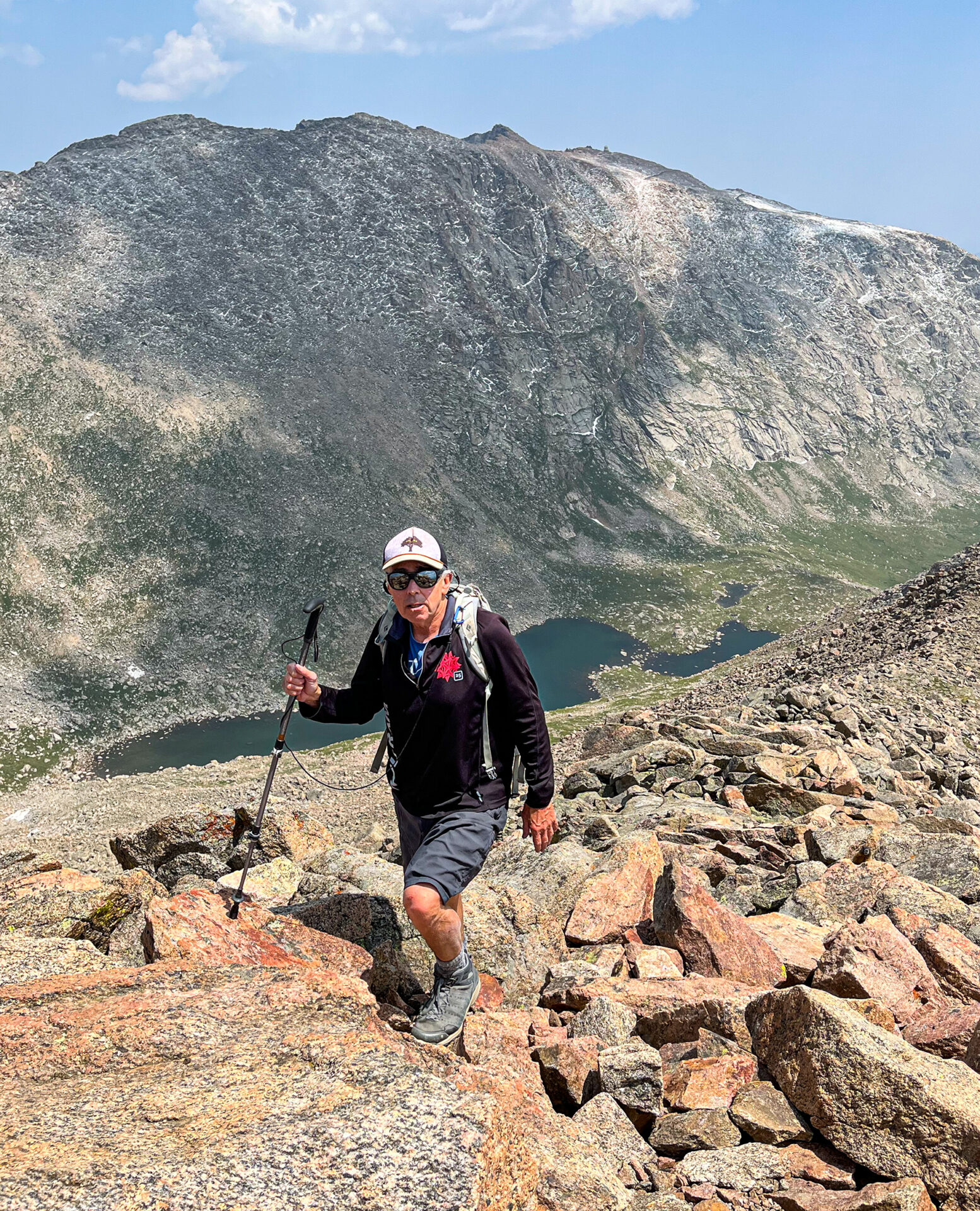 The best hike of 2024 was a climb of the southeast ridge of Bierstadt on July 23, 2024, with Elke Dratch and Bill Briggs. It should have been routine, but recent snow created some difficulties. We parked at 13300 feet on the Blue Sky Road. Descended 800 feet. Climbed to the ridge which goes nicely to the summit of Bierstadt. Climbed to summit. Descended to Abyss Lake and then back to car. But the new snow, and some ice, forced us into class 5 terrain, as we had to avoid slippery rock. This was exciting in spots as we had no rope.