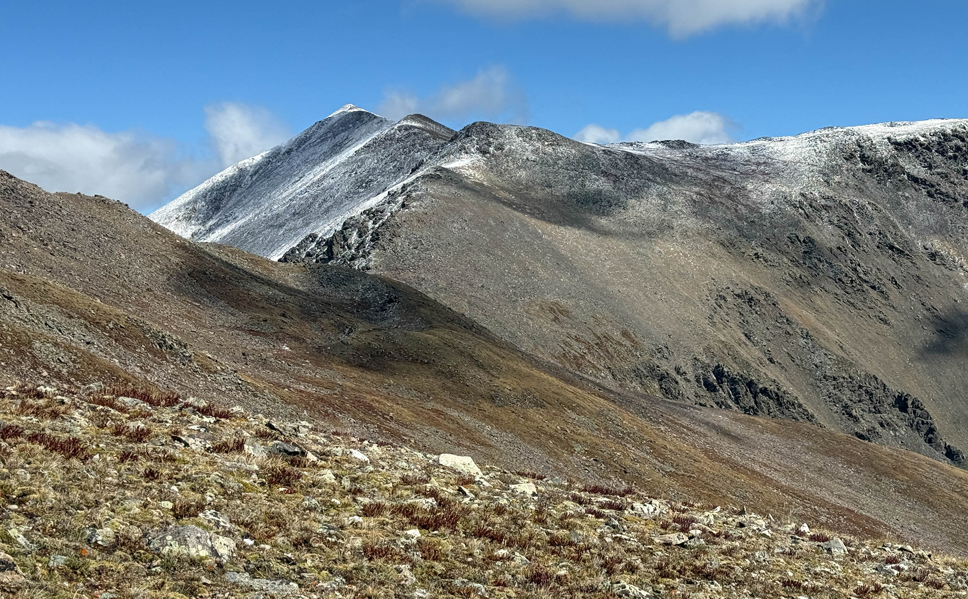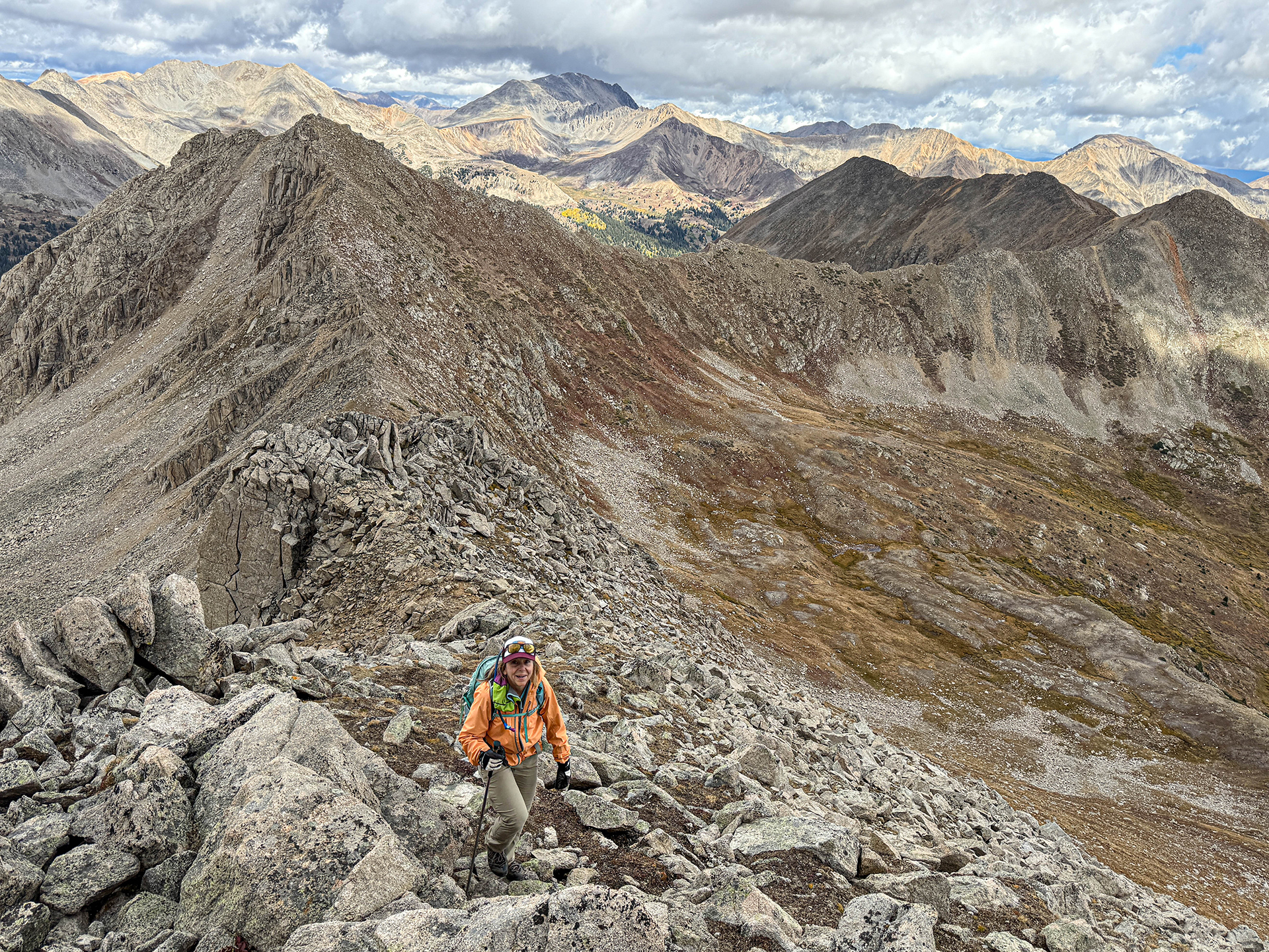 Oct. 2, 2025, near Red Cliff.Elke Dratch climbing Sheep Rock Mountain. Sept. 1, 2025The Three Apostles above South Lake Creek.NoName Ridge in center, viewed from north of Twining Peak. Elke Dratch, Kim Clark, and I did that ridge on June 24, 2012 (13 miles, 12 hours)Mt. Elbert from Bull Hill. The ridge traverse to the Black Cloud Trail is easy.Matt Cary on the traverse from Peak 13738 to Deer Mountain.Katie Larson on Seven Sisters Ridge, high above the Seven Sisters Lakes.High on Seven Sisters Ridge. This photo was a runner-up in the John Fielder ESWA Photo Contest, Sept. 2025.