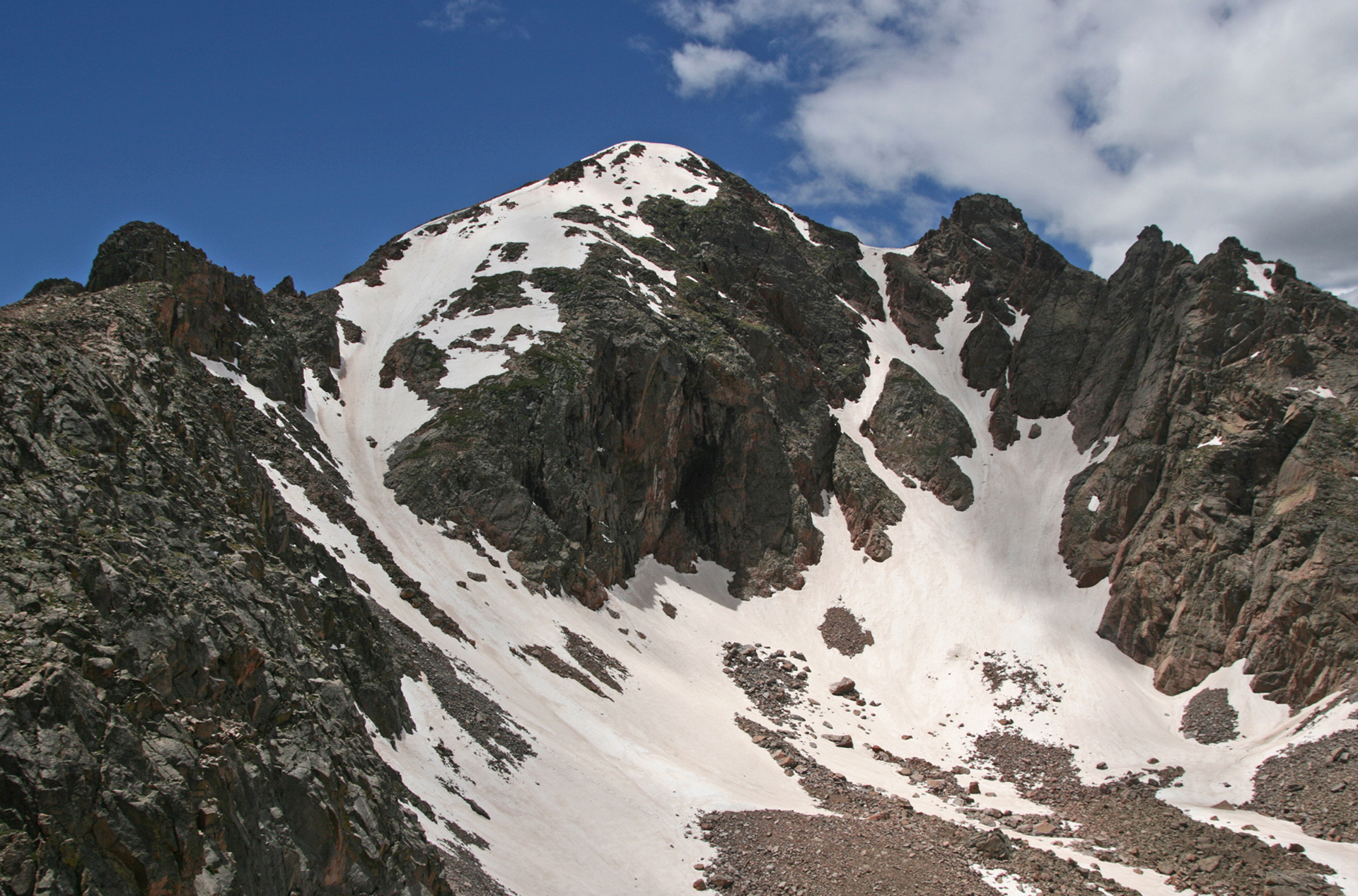 On June 25, 2013, Elke Dratch, Katie Larson, and I headed to Thor Tower, on the southern of the two very long east ridges of Valhalla. We gained the col west of Thor from its south side (some steep snow; we roped up as I did not have an ax) after passing through the Freya–Thor saddle and descending a bit. Then a bit of searching got us to a reasonable route: we traversed horizontally out onto the north face, where there was broken rock that seemed like it would work to get to the summit. Elke and I had gotten stopped at this tower after descending from Valhalla (descending Loki Spire unroped, class 4) in 2010. At that time I thought there would be a 5.2 or so route on this area of Thor’s north face.