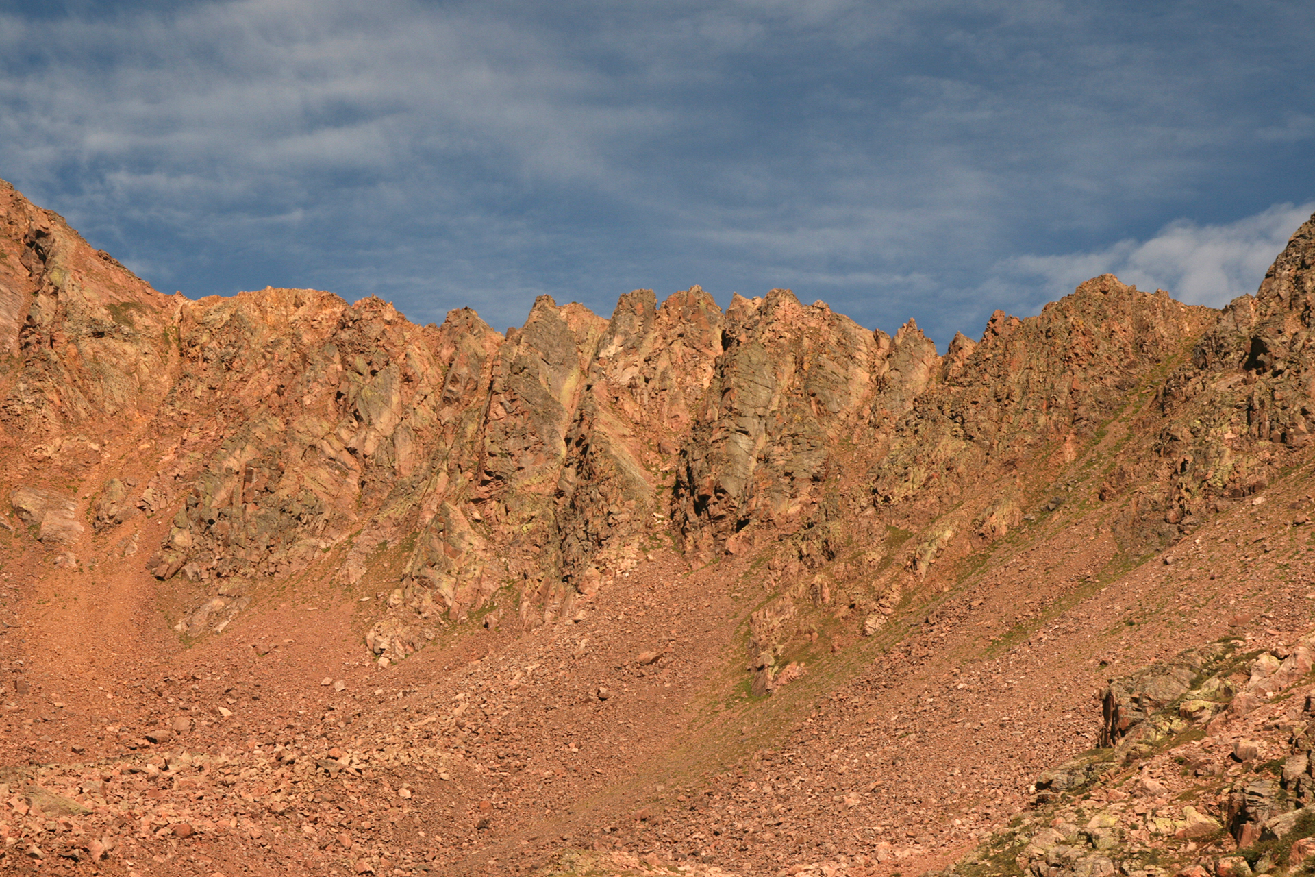I first did this ridge in 2011 with Joe Kramarsic, David Nebel, and a rope. In August 2012 I went back with Elke Dratch and no rope. No problem at the crux, which is the only tricky move, everything else being standard Gore Range class 3 and 4. This move too is probably 4th class, maybe 5.1 since the hardest move (just below where Elke is on the photo) has fewer holds than the rest of the climb. We did the full E ridge from the grassy slopes just westof the saddle with Deming to the summit.