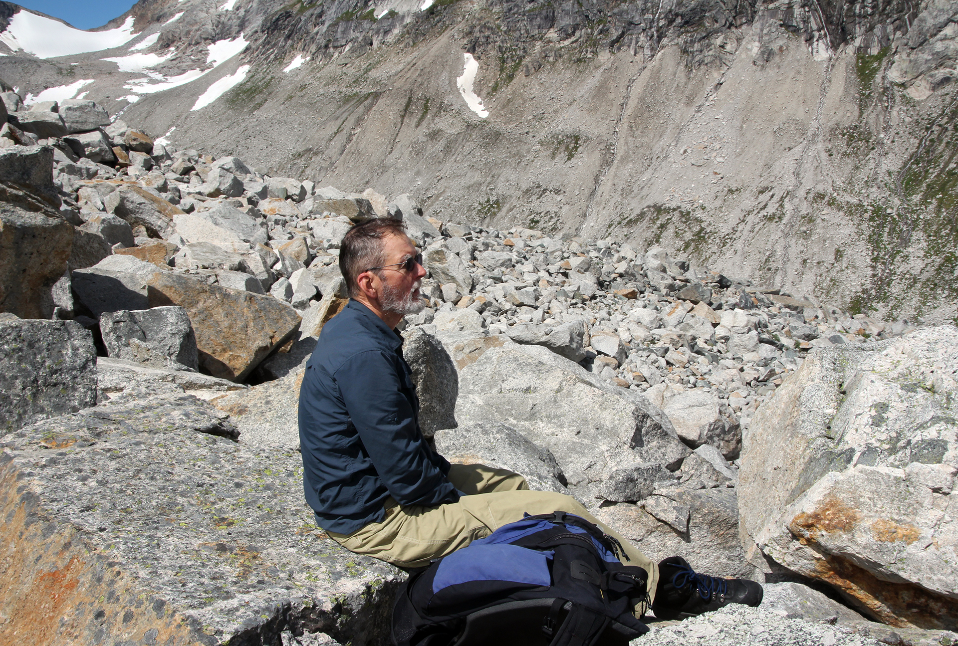 Tuesday July 22. We started at 6 am, aiming for the direct south ridge of Harpoon from Houston Pass, a classic route in the area. This forms the west end of the Harpoon Glacier. The rock was excellent; some loose, but also solid granite for climbing. David decided to stop about a third of the way up, and waited on a ledge as Pierre and I continued. It was a very long ridge, with many towers and lots of 5.4. At the top we stepped onto the upper glacier easily. A hidden part of a crevasse swallowed my lower half, but it was not a problem. After getting past that we decided that an attempt at Proteus (10660 ft) was more logical than the smaller Harpoon, so we climbed the glacier to that peak and scrambled to the summit. Just before the summit we could look down a couloir straight to our camp: fully 4000 feet. Awesome. The summit yielded great views in all directions, and it was pleasing to bag the highest peak in the area. Descent was slow as my knee tired (knee replacement in July 2014), but steady. Classically the descent is by the glacier, but that would not have been easy, so we descended the same way. David waited 5.5 hours and we all continued down easily and back to camp at 6:30 for a 12.5-hour day.