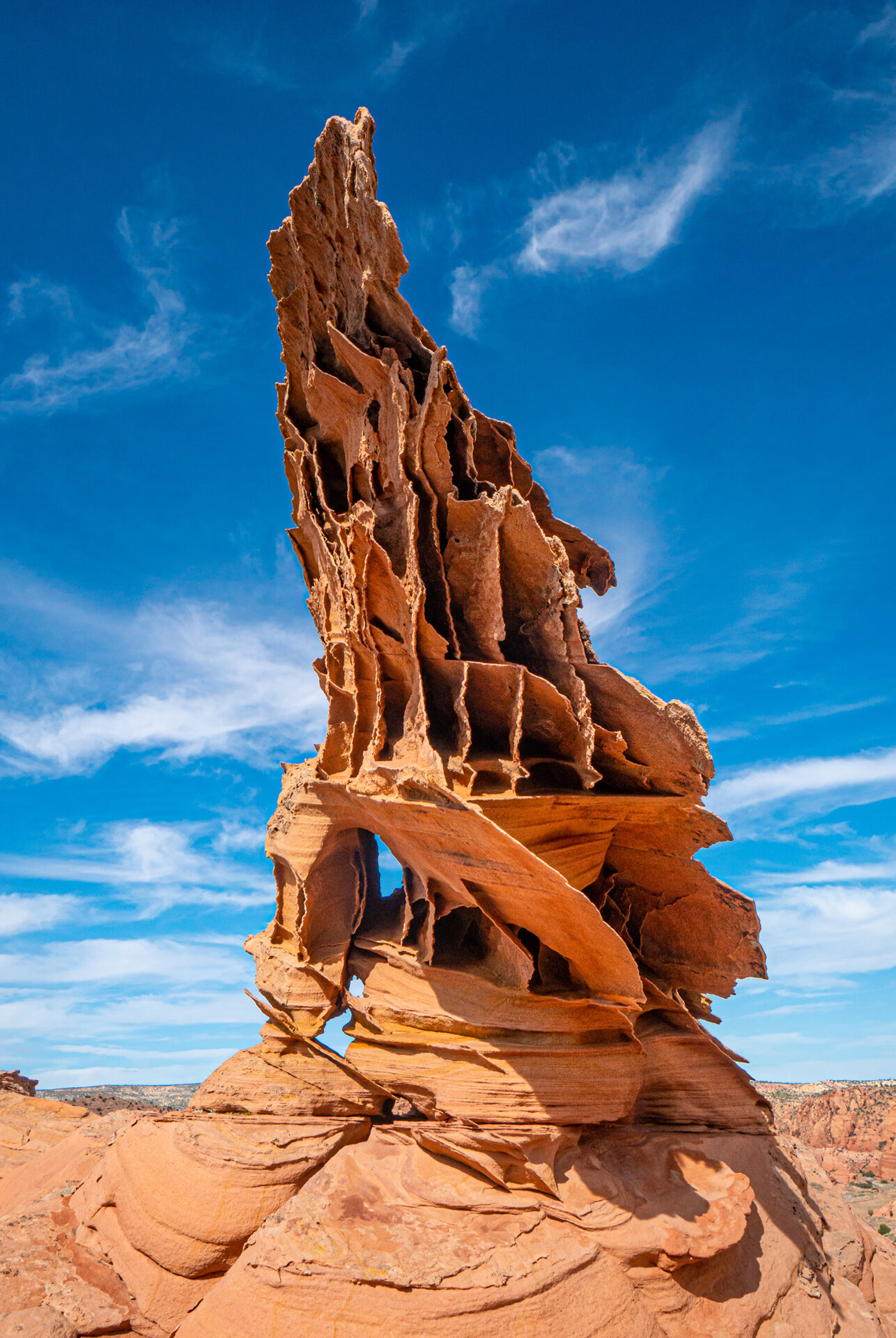 The Bird Goddess. This is an image of a totally natural feature. Can you figure out what the subject is? You can ask me for the answer (wagon [at] macalester [dot] edu). This photo, used with permission, was taken by Ricki Brown of Escalante, Utah, in the Golden Cathedral and is a remarkable combination of light, water, rock, and humanity. An amazing formation in Edmaier’s Secret, near Buckskin Gulch.The Alien Throne, in the Ah-Shi-Sle-Pah Wilderness south of Farmington, New Mexico.Fallen Roof Ruin, west of Blanding, Utah (17-frame panorama).Gingham Skirt Butte, near the Paria townsite.The most amazing thin lace rock.Hope Arch, near Chinle, Arizona; Moenave sandstone.The Hourglass, with Navajo Mountain behind.The inaccessible Faraway Arch viewed from Redbud Spine, southeast of Rainbow Bridge.Windstone Arch, in Nevada’s Valley of Fire State Park. It was destroyed, likely by vandals, in 2021.Tower of Silence, near Big Water, Utah..The Wave (7-frame panorama).Cobblestone Bridge in Arches National Park.Twisted Hoodoo.Mystery Arch, San Rafael Swell.White Pocket.White Pocket: The Swan.Halfway up the Bobway, near the Escalante River.The Gran Meeander: a giant alcove in Mee Canyon, west of Grand Junction,. Colorado.Red Bar Bridge (near the bottom of the Moki Dugway).Hoodoos near Kanab, Utah. I believe the spectacular one on the right has collapsed.Crown Arch, southwest of Grand Junction.Honeycomb Roof Ruin, east of Blanding, Utah.The many forks of Fold Canyon, the most complex of the Lower East Side canyons of the Escalante River.Collet Top Arch and Granary, east of Escalante.The view north from the summit of Red Top. The valley between this summit and Yellow Rock (rear center) is fantastic.Bull Valley Gorge.