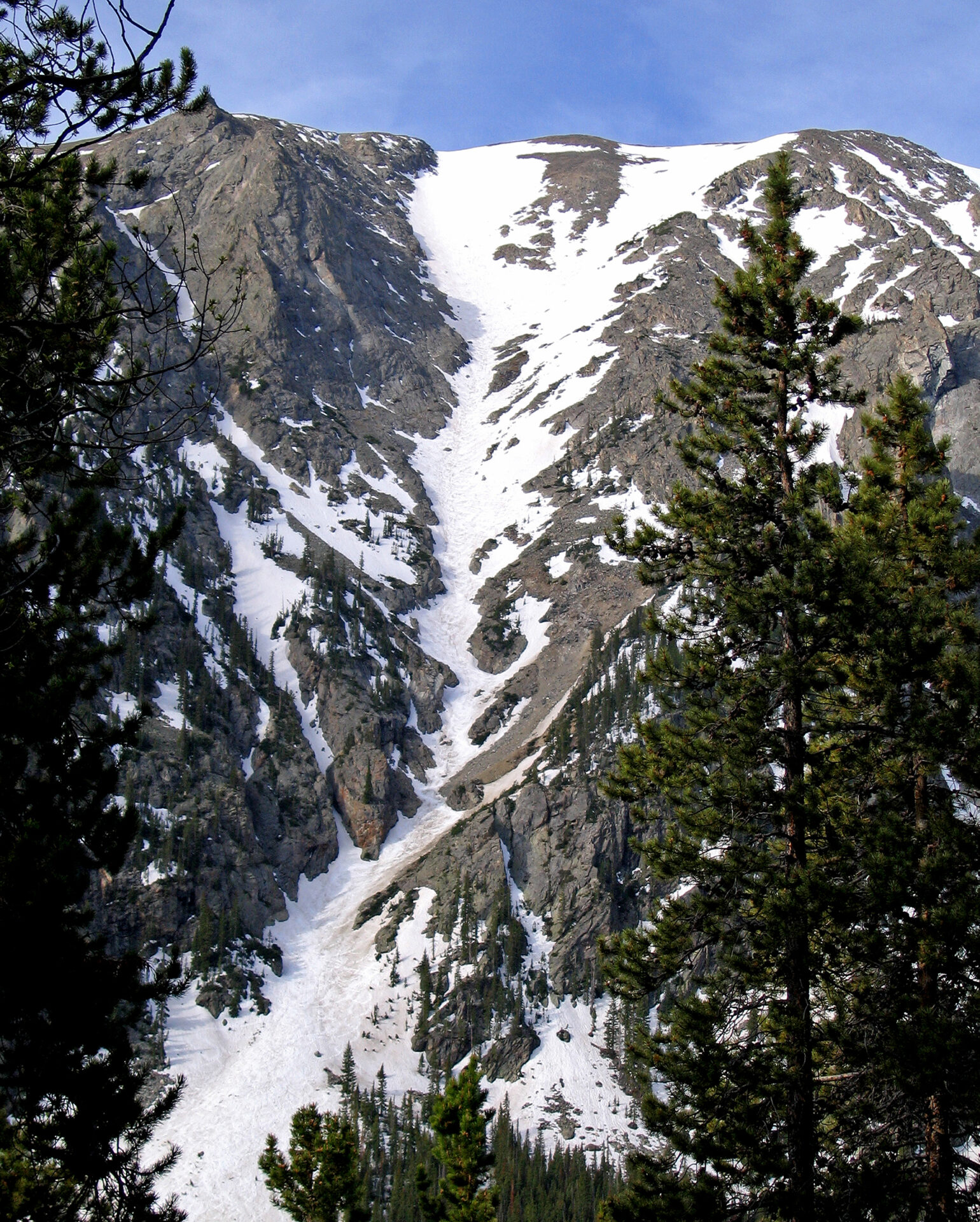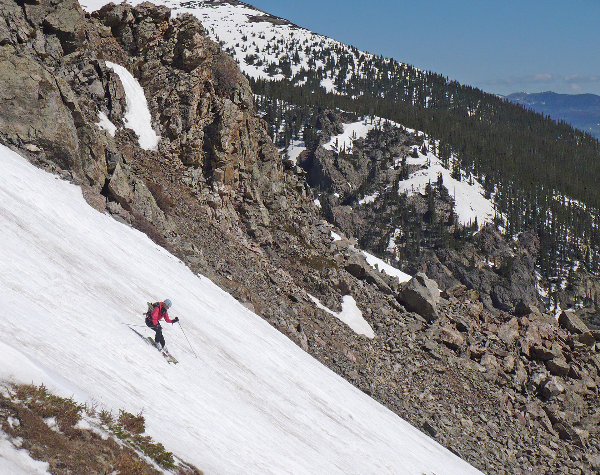 The north couloir on Buffalo (12777 feet), also called the Silver Couloir, also called Elvis, is justifiably famous, as it offers a steep 3000-foot ski descent. The bottom gets mushy early, so don’t wait too late for this classic line. Just climb Buffalo and ski northeast from the summit. This route is a stone’s throw from my house. On my first trip into it (with Katie Larson and Bob Salazar) my bindings broke 500 feet down and I had to walk down. Lesson learned. Then I skied it properly with Janet Jacks two years later.
