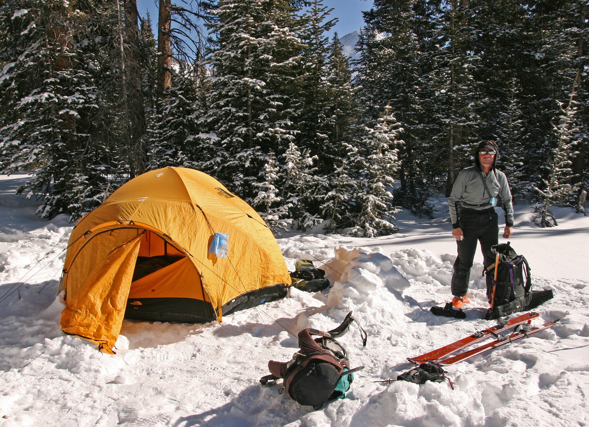 On Friday, March 19, 2010, Jonathan Kriegel and I left Summit County amid a heavy snowstorm, drove to Moab for breakfast, and then headed up the Geyser Pass trail with large packs (55 pounds) to set up camp for three nights at the pass. Conditions were stormy (and the drive up difficult in 6 inches of new snow), but the storm was ending and so it seemed perfect, with a forecast of sunny days and lots of fresh snow. We got to the pass in just over two hours and set up camp. We headed north for a short ski tour in the late afternoon but got a little lost on return, having to climb 200 feet to return to camp.
