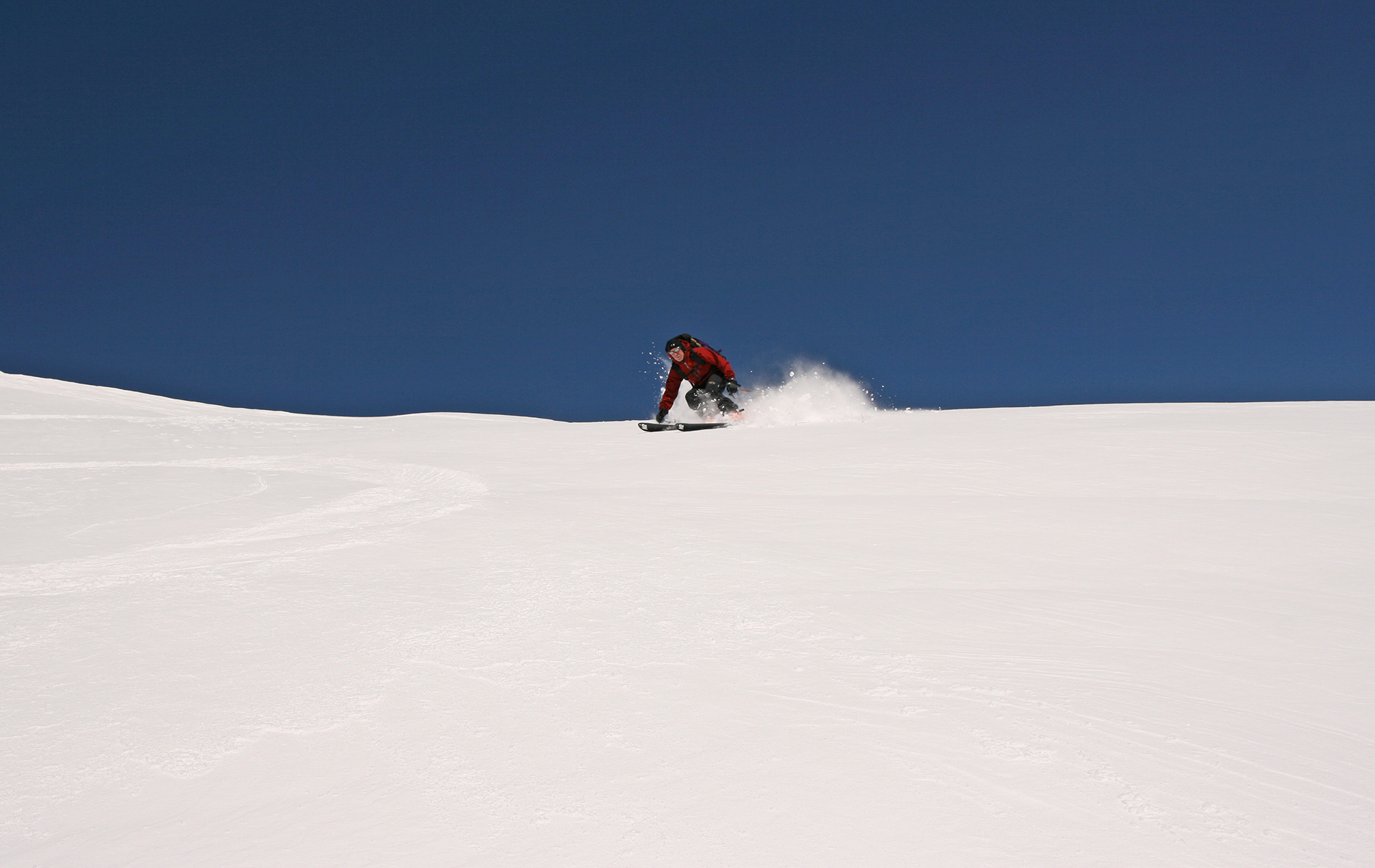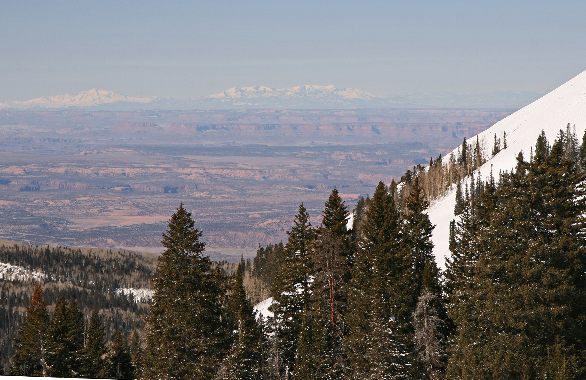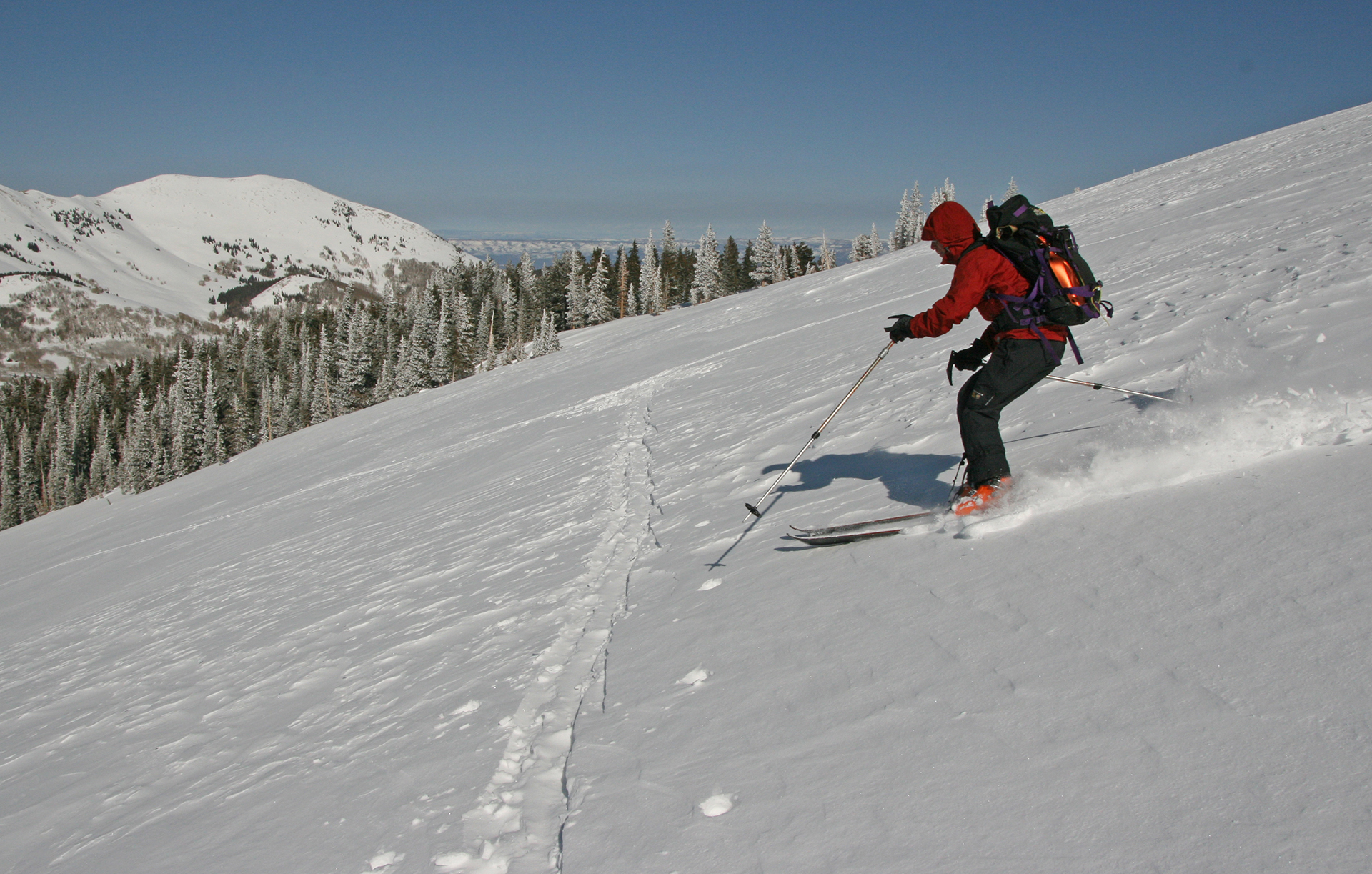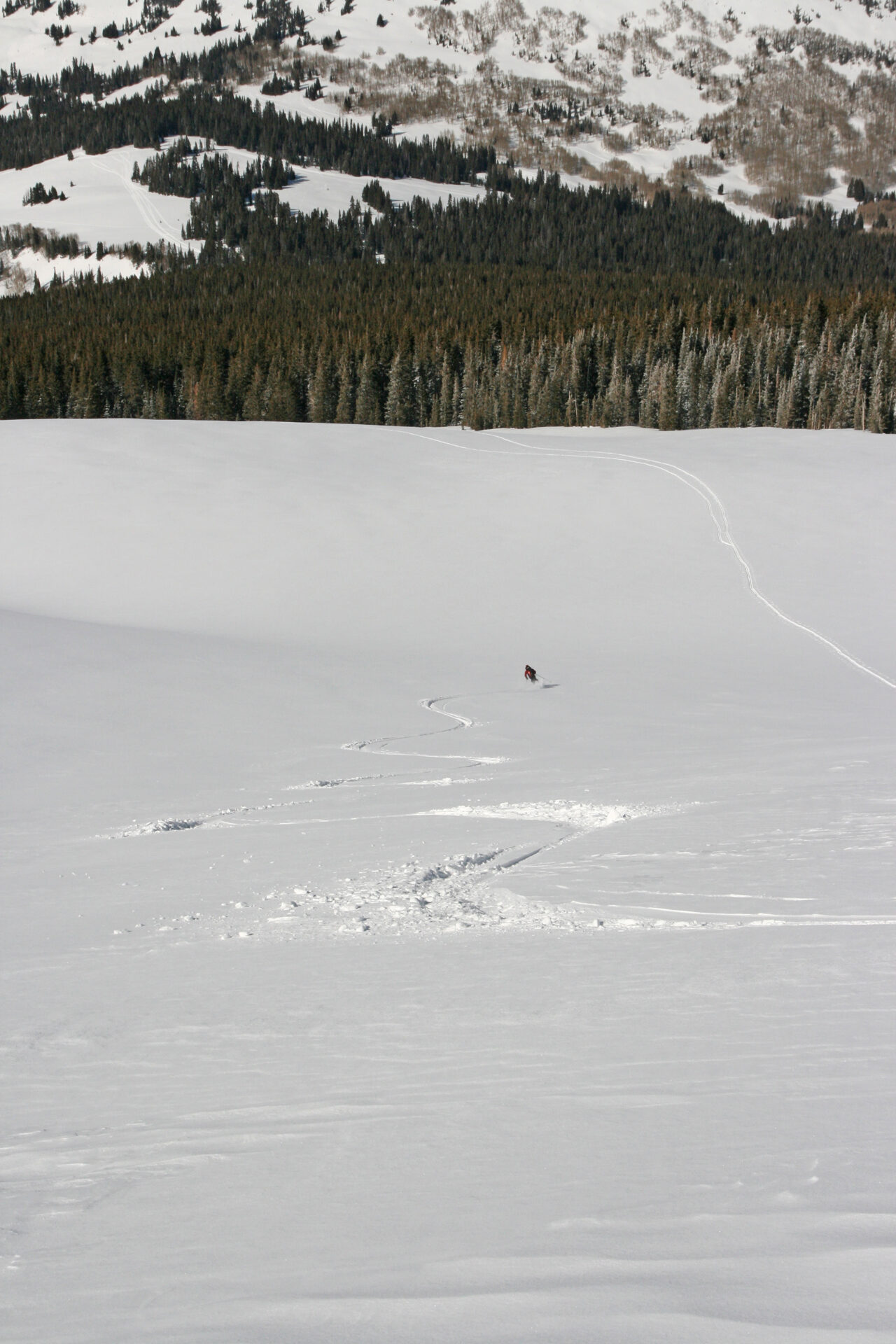On Sunday we headed to Mel, our track making the approach fast. It was another full-sun day. though the winds were brutal at the higher elevations. We skinned as high as we could, then turned left to the ascent ridge and donned crampons, which again were quite necessary, for the ridge climb. The climb went well but the winds forced us off the summit quickly. What a great place though, with 8000 feet of relief down to the town of Moab. A quick transition and we dropped into the spot we had scoped out. It was a little rockier than expected, but the snow was firm and not icy and we easily side-slipped down to where whiteness ruled. A couple hundred more feet of firm snow brought us to powder which we enjoyed immensely. Back at camp we rallied for an afternoon tour up the west side of Tomasaki. I was tired, and I was getting extreme skin gloppage despite skin wax, so Jonathan went further. I was tired, and I was getting extreme skin gloppage despite skin wax, so Jonathan went further. His descent was about a third of the longer route of the impressive west gully that descends from Tomasaki’s summit.