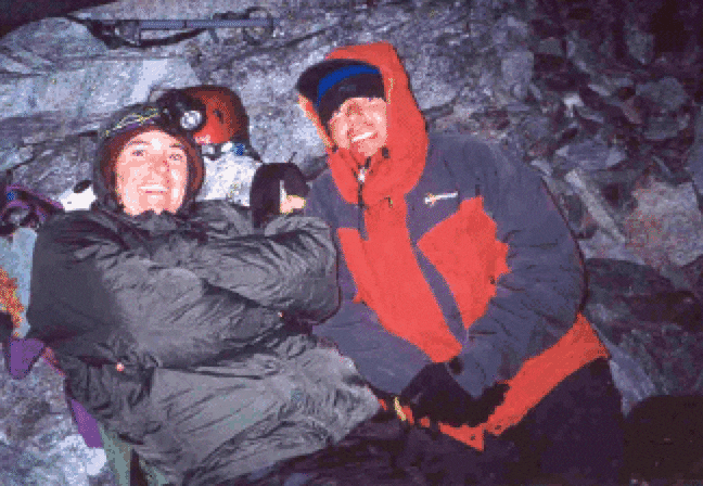 Our site was cool: A flat spot between the ridge and the start of the gigantic Avalanche Glacier. My only other unplanned bivouac was on Sir Donald 20 years earlier (also with David), and we spent that night on ice. Rock is much warmer! We had food and water, used the ropes for insulation, and settled in to watch the moon cross the sky. I did get a little sleep (maybe 30 minutes at most). We all had long underwear, fleece, and rain jackets, so though there was some shivering, it wasn’t too bad. Air temperature was probably 38 degrees.