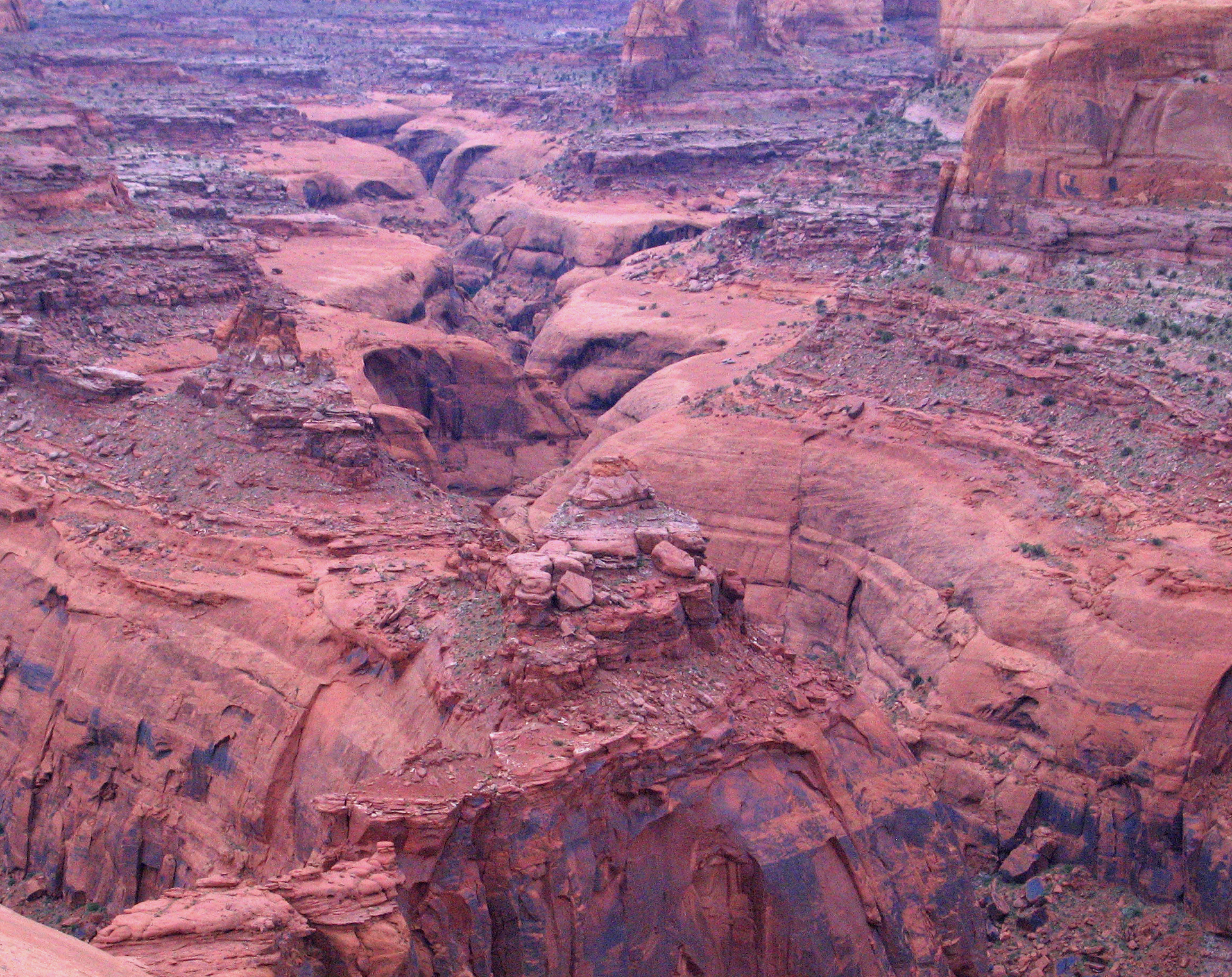 Wednesday: I again walked to the rim in the morning, but clouds made photography not so great. Then we walked past “Rock” back to the King Mesa pass, and camped not far below it on the right side (looking down canyon) of the Long Branch. High points of this section were: a small lake on the southeast side of Rock (GR 985 442), the nice near-slots in the canyon with a spring marked on the map (lots of water), and the generally beautiful Navajo sandstone. Camping and walking on the Navajo when there is abundant water is a real treat. In the afternoon John and I walked to the upper reaches of Sleepy Hollow to see if there might be a way in. No chance. This was a huge and spectacular slot canyon, with no way in without rappel and very difficult travel if one did get in somewhere at the head. In the evening John urinated near a bush and was surprised to hear a rattling sound. Yup: a small rattlesnake was very well camouflaged in this area—not too far, but not too close, to our campsite. It was chilly and he or she was not moving much.