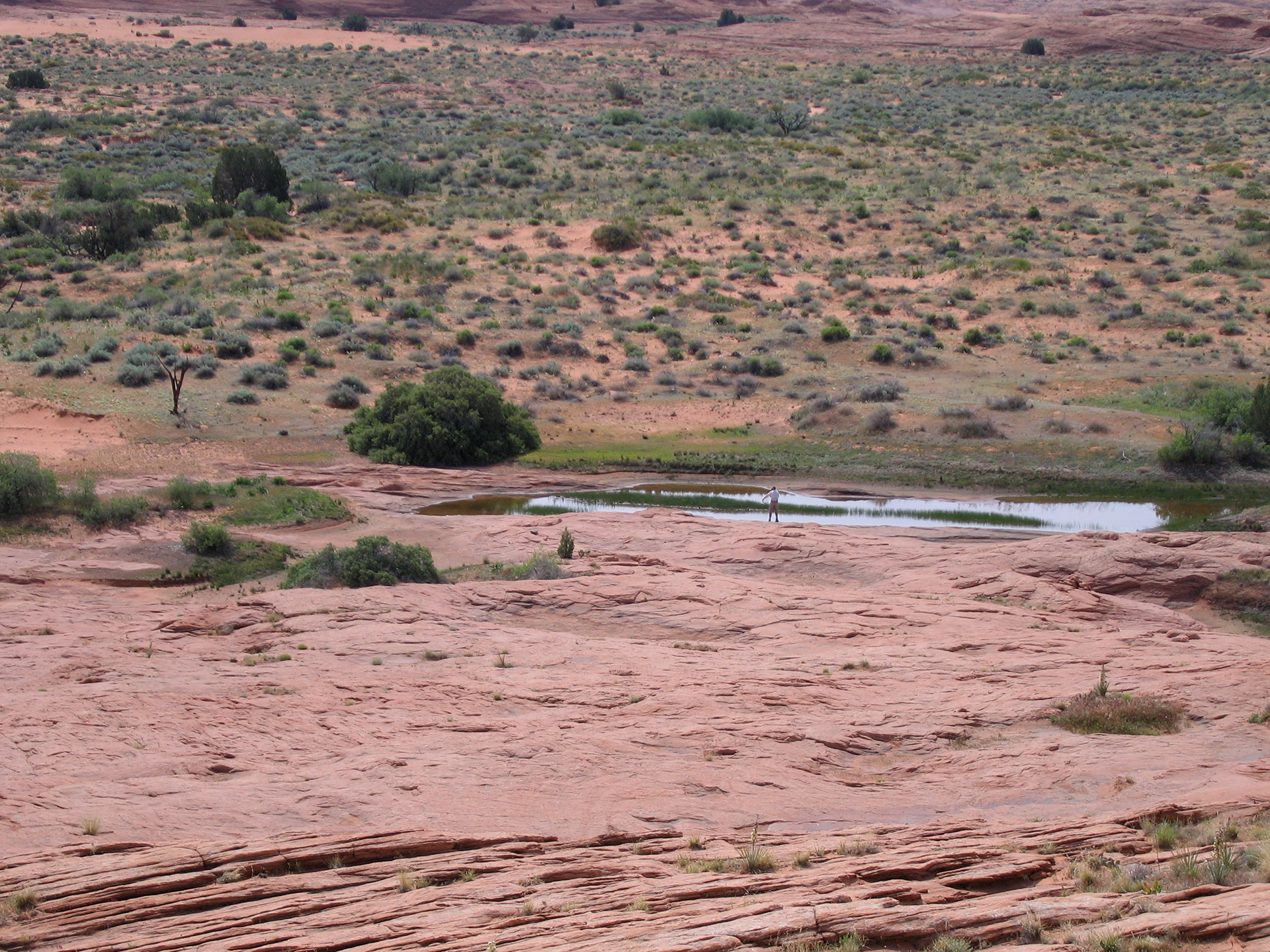 Tuesday: We hiked down the Escalante past the mouth of Ichabod, which brought back memories of two prior trips, and stopped at the Bobway, our exit canyon. Of course, we bathed in the Escalante before starting up. The Bobway was spectacular: cool, wet, beautiful. At the spring we rested a bit and then attacked the brutal final climb up the sand dune. Since we did not know there would be water on top, I carried a full dromedary (9.5 quarts, 19 pounds; fun). But then John and I wandered the rim and found some tremendous pools just northeast of the high point at 4880 feet (GR for the potholes is 997 456). Rim walking in this area was great for the views of the canyons across the Escalante. A few drops of rain came in overnight so two of us retreated to the MegaMid; but in fact there were only a few drops all night.