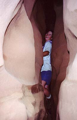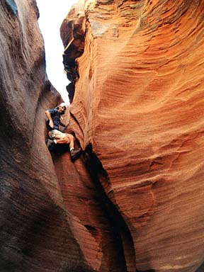 Day 10: Not finished though, as I cajoled Katie and Byron into joining me for a day of exploring Brimstone Canyon. This is one of the most amazing geologic features I have ever seen. In 1996 I explored the lower end of it with Tom Whitesides for about 30 minutes. It is a VERY narrow slot, barely body width. Several years ago a man dropped into the middle of it and could not proceed up-canyon or down. He was stuck there for 8 days before being rescued. So, naturally, I wanted to return. We started down toward Peek-A-Boo, went up Peek-A-Boo, and then cross-countried over to Brimstone. We rim-walked a bit and then dropped into it. Wanting to make sure we were not missing any parts above us, we went up-canyon a short distance, to a pour off that could be climbed at 5.7. Byron and I did so, decided that was the high end of the canyon, and descended with the help of some sling tied around a horn, that we could pull down. Then we headed down-canyon. We were immediately stopped by a pool, but we could exit and re-enter the canyon easily. Then we went through the narrow slot, but nothing to difficult, until the confluence with a side canyon. At this point one can easily escape to the rim, but of course we headed farther down. We saw two rattlers in these sections! Now the narrowness began getting intense and soon the canyon was too narrow to fit through. Byron got through a very narrow section, but then it got narrower still and he stemmed up to the rim. He could not escape, but he could easily stem at that level, and suggested we follow him there, stem along, and drop back in. But Katie and I, thinking perhaps of the man stuck there for 8 days, and ourselves in a very awkward position above a narrow slot decided we had enough. We had spent over 3 hours in the canyon. So we backtracked to the confluence and escaped and returned to the car via Spooky Canyon (another rattler!). In retrospect I think Byron was right and the high stemming would not have been difficult.