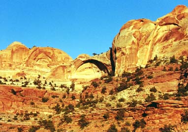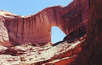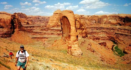 April 23, 2000: Day 1: From the Forty-Mile Ridge trailhead we went straight to and through the Crack-in-the-Wall, lowering packs. Somehow the last pack (Rita’s) was mishandled and it dropped without the benefit of a rope. No damage. Then the easy sandy descent to Coyote Gulch and a quick bathe. Then up and over a saddle to avoid a meander in the Escalante River. There was a great seep (shower) in the Kayenta on the far side of the saddle. Then walk upriver a bit to Stevens Canyon. Met two guys (runners) camped a little ways up. Saw a small arch at The Grotto.