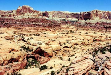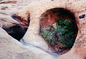 Day 6: Retrace down to Stevens. Rita and Vin have both been having serious blister problems, and at this point they decide to bail down Stevens Canyon. They should get out in two days (they do). We cross Stevens and climb to a nice pass and then down to Fold Canyon just past a confluence of two branches. Then Katie, Byron, Herb, and I head down Fold with a rope in an attempt to get into it, but even though we find a good descent route (with one rappel) we decide not to do it since we do not know if we can find an easy way back out. Prusik slings would have been helpful. So we just walked the Wingate all the way to the Escalante overlook and came back. On the way back we crossed Fold Canyon just below camp and took Moqui steps up the other side and then descended back to vicinity of camp by an inobvious tunnel just upstream from camp.