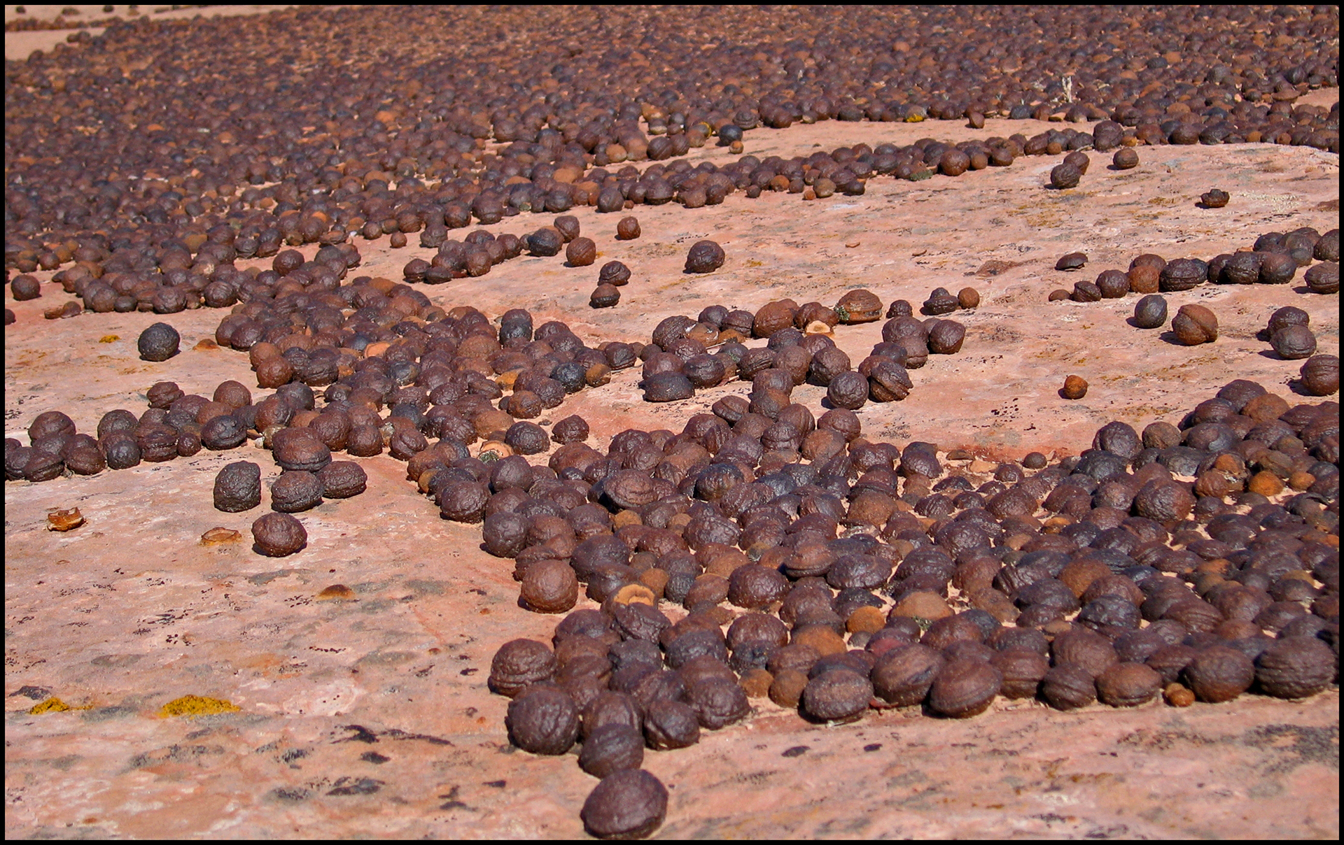 Thursday: We explored the amazing jointed area northeast of the end of the Sheffield Road (between the head of Red Breaks area and the Escalante River). For years I had noticed this unusual feature on the map, but it is not mentioned in any guidebook. Yet it makes a great day hike. One highlight were several huge accumulations of Moqui marbles on the Navajo sandstone (see photo). We wandered through one pass that looked impassable on the map, but in fact could be climbed and descended with no problem.
