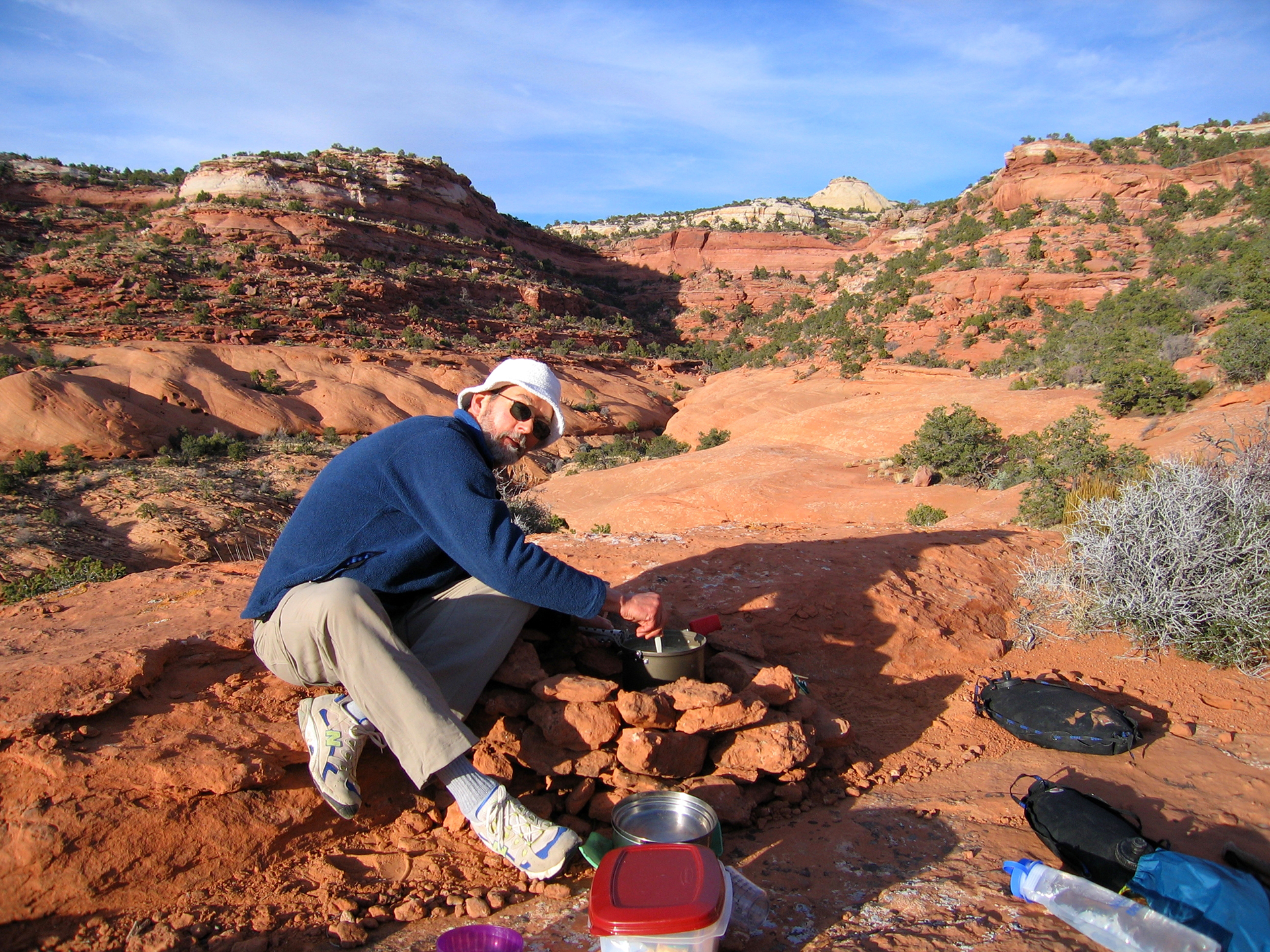 Sunday: Uneventful long hike via a climb out of a canyon to the flat ground of the top of the Waterpocket Fold and then a descent at the end (familiar from 2005) to a great camp on the high Wingate in the very head of East Moody Canyon, above what is known as the Sheephunter’s Route. We camped here last year (“Snow Camp”) and when we investigated the exact spot we could find no trace of our presence there the year before. Good. Plenty of water everywhere.