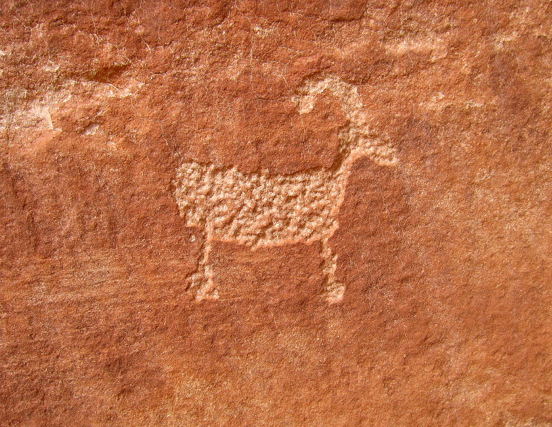 Monday: To “Windy Pass”, high on a thin ridge that divides Georgie’s Camp Canyon from Fold Canyon. Again, the day was uneventful and the travel easy, with some rock scrambling to get by small pouroffs and a larger digression to the right side as we approach the end of the day.. This is basically a route described in Steve Allen’s book. He calls the Navajo domes and cliffs in this area “sublime”. Agreed. From camp we could climb down a very steep gully to get good water. At the bottom of the climb I found a single ancient pictograph of a sheep which was quite striking (see photo). And a kilometer before this (upcanyon) Katie had found a panel of pictographs that we knew about from Herb Taylor. After settling in we wandered the steep ridge above and SW of camp for great views of the surrounding terrain. This pass is an amazing place — one of the most scenic camps I have been at. The best view is of a branch of Georgie’s Camp Canyon. I have never been down into it, but I have heard it described as endless Wingate walking to get around.