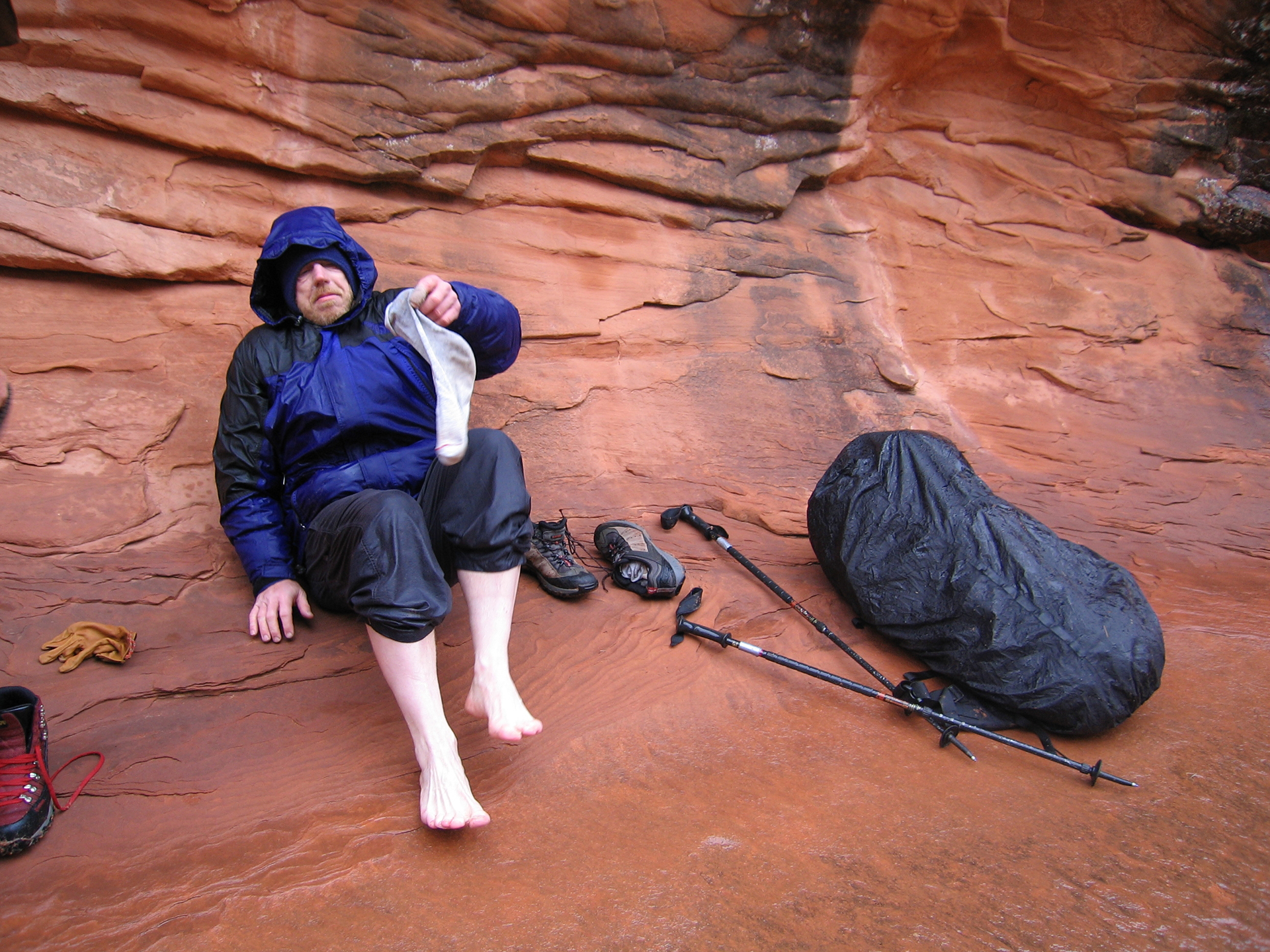 The rain let up a bit in the afternoon and our climb up the very steep 800-foot gully (class 3, some class 4) went all right. We had a great camp on the Navajo at the top: there would usually be no water in such a place, but that was not a problem on this day! The views from the edge down into Fold were stupendous. Indeed, I imagine people rarely stop at this spot so this unexpected camp provided one of the highlights of the trip, because of the views and feeling of being above it all. The camp was exposed to the winds, which stayed high for the rest of the day and through the night, so we set up the MegaMids and passed a noisy night. Floods were not a problem, however.