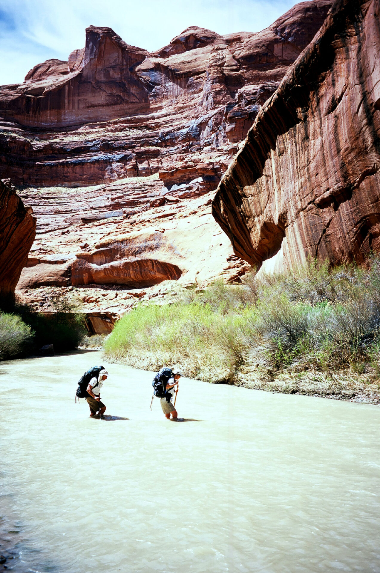 Saturday: Out Ichabod Canyon to the Escalante River, which is easy and gives us our first close-up view of the water that we would have to cross. The river was certainly flowing high, but it seemed not too high, so we chose to go down-river as planned as opposed to following the backup plan of going upriver a little and crossing only once to the Bobway exit. [[Whoops: Big error. The Bobway is downstream a short distance. Upstream is Fools Canyon. Both work as exits but I now (2007) know that the Bobway is much simpler than Fools. There is a small map error in Steve Allen’s book that makes it look like the Bobway is upstream when it is not.]]. Well, I say “chose” but when I got to the confluence the rest of the team had moved on down, their strategy apparently being to not allow me, a nonswimmer, to look at the river and suggest going upstream! We stayed on one side for a long time, but eventually we were forced to cross to avoid dense tamarisk, and then it was crossing after crossing to get to places where travel was acceptable. The depth was not bad, but at thigh-deep this did slow us down, especially when we had to stay in the river for long stretches. We could see, from wet sand, how high the river had been right after the Wednesday storm; it would have perhaps been uncrossable then. But today was our lucky day and although the exit to the car at 40-Mile Ridge was a few hours behind schedule, there were no serious problems. We reached the final crossing past Stevens Canyon at last, and were at the upward trail with all difficulties behind us. Then the short trail into Coyote over a Kayenta saddle, the climb up the sand hill with better and better views, and the flat slickrock walk back to the car, which we reached at 5 pm.