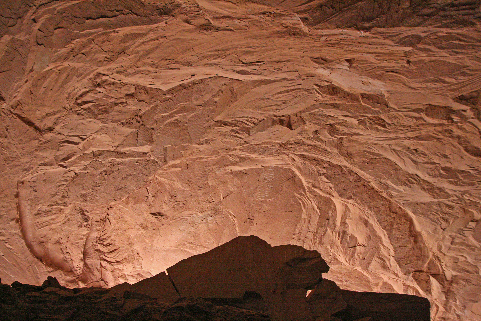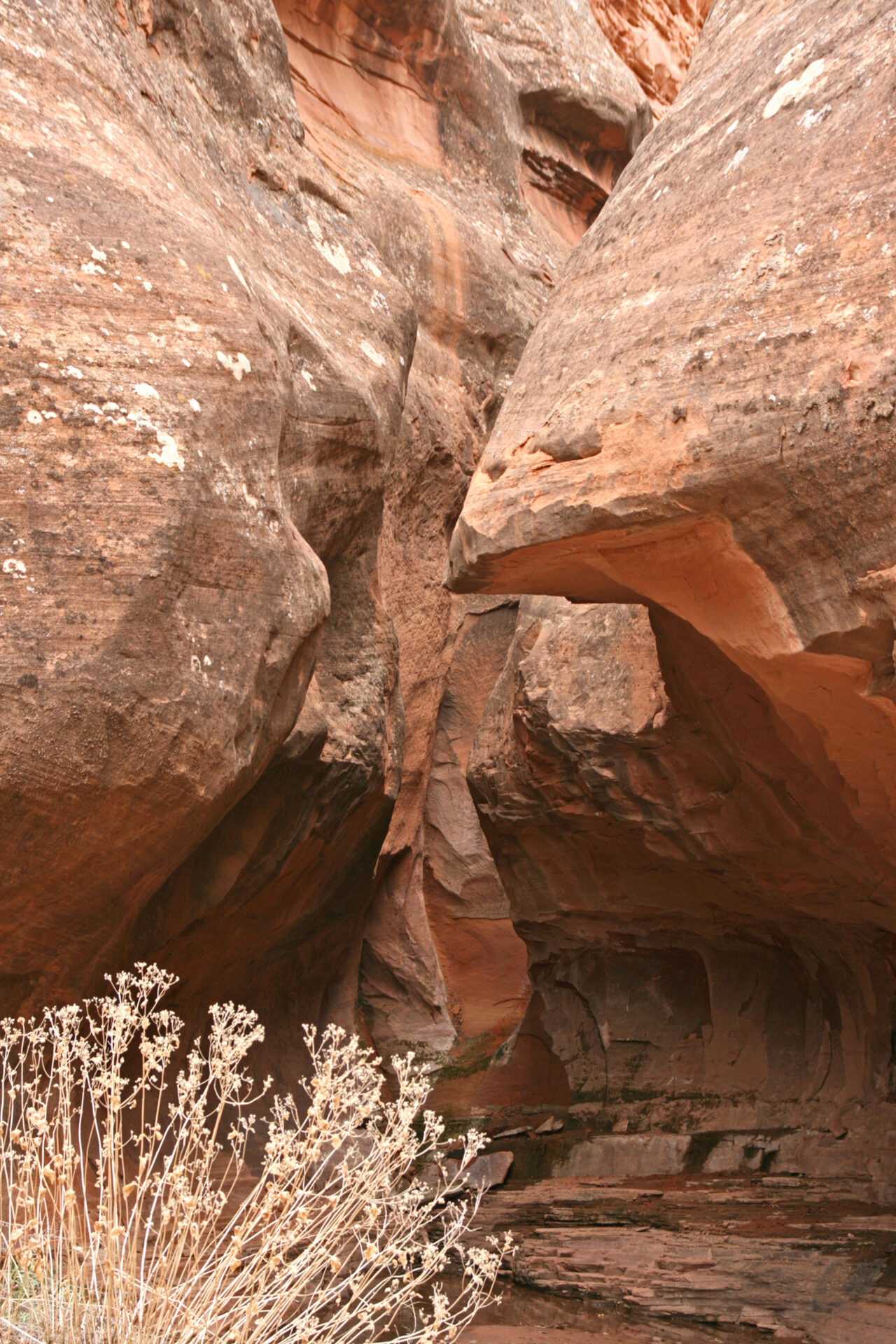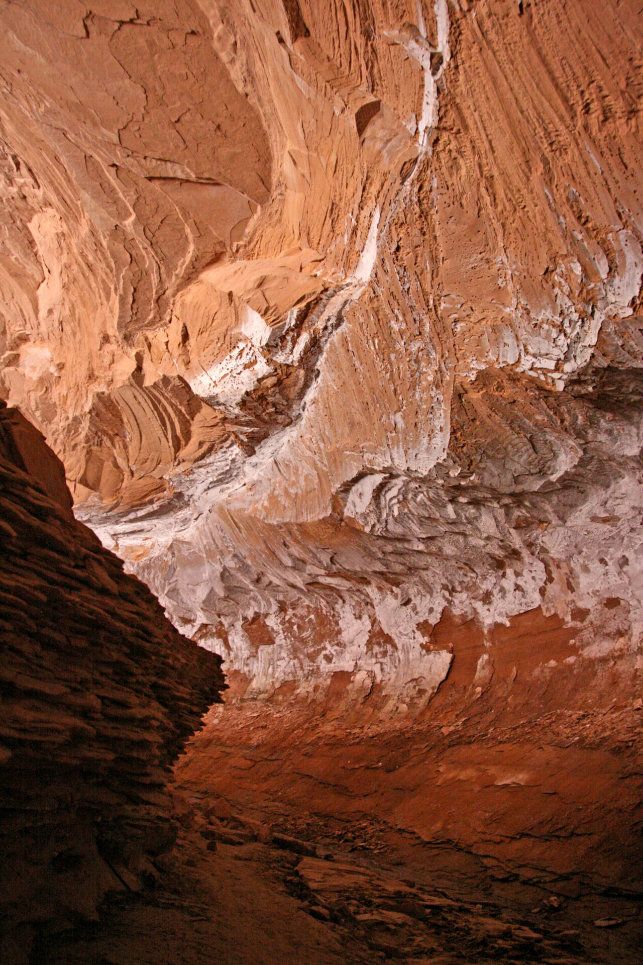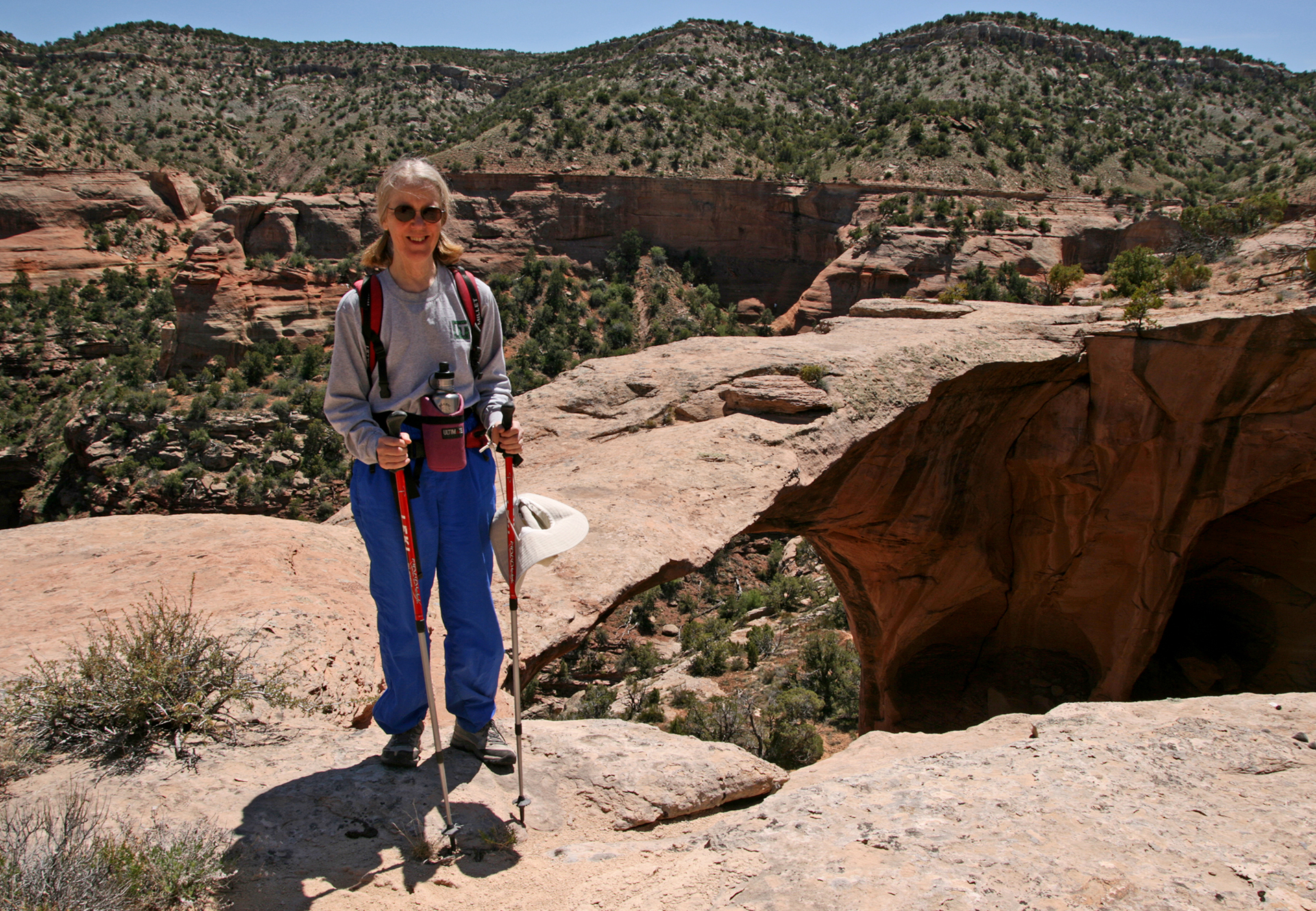 May 3. For our last day Joan and I headed down the trail into Mee Canyon and the giant alcove just upstream of where the trail enters the canyon. The trail is about three miles long and is remarkable for several sections of steep scrambling. The alcove is over 300 feet deep, 75 feet high and 200 feet wide, the largest such alcove on the entire Colorado Plateau. It is also known as Grand Meeander (sic) Cave.