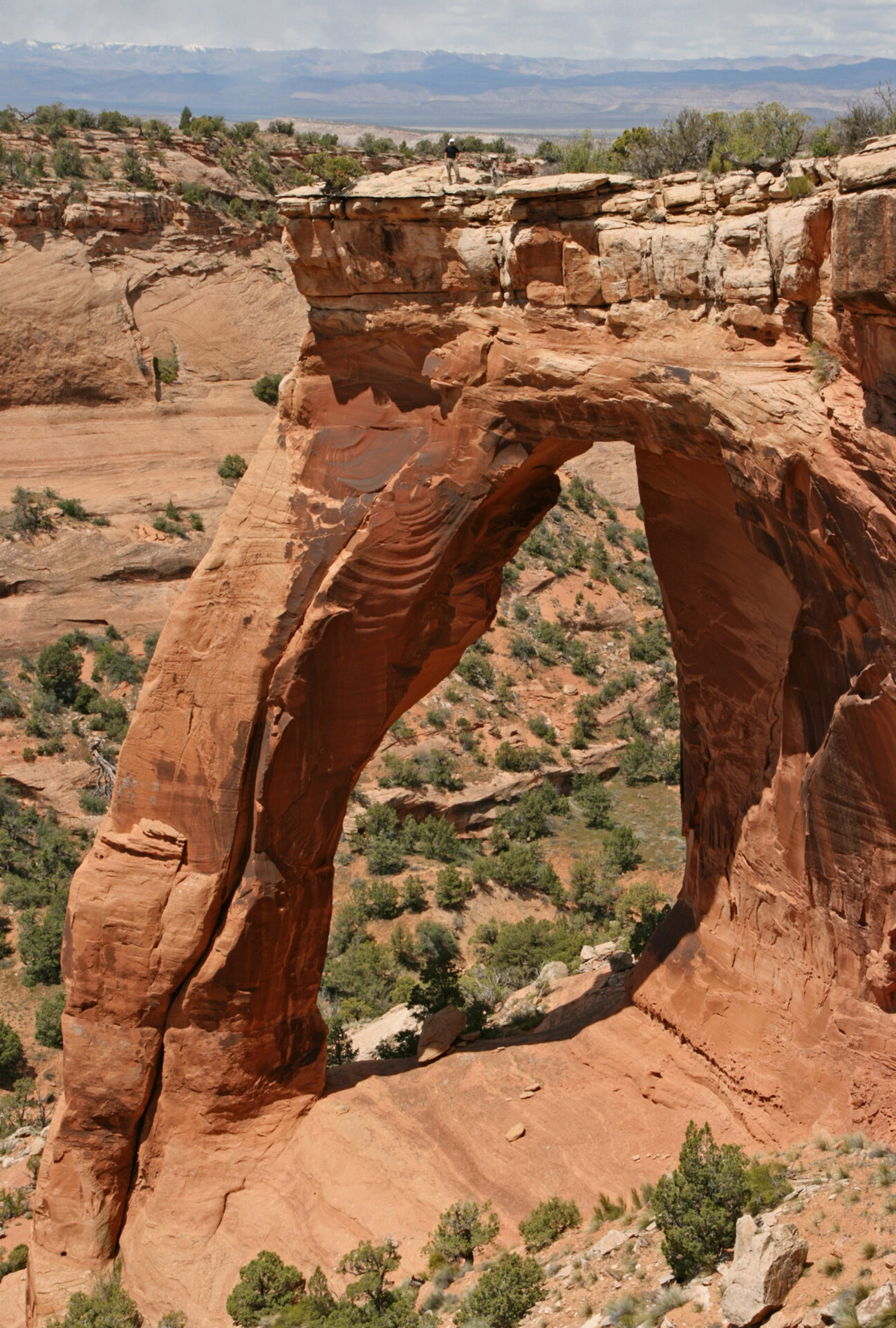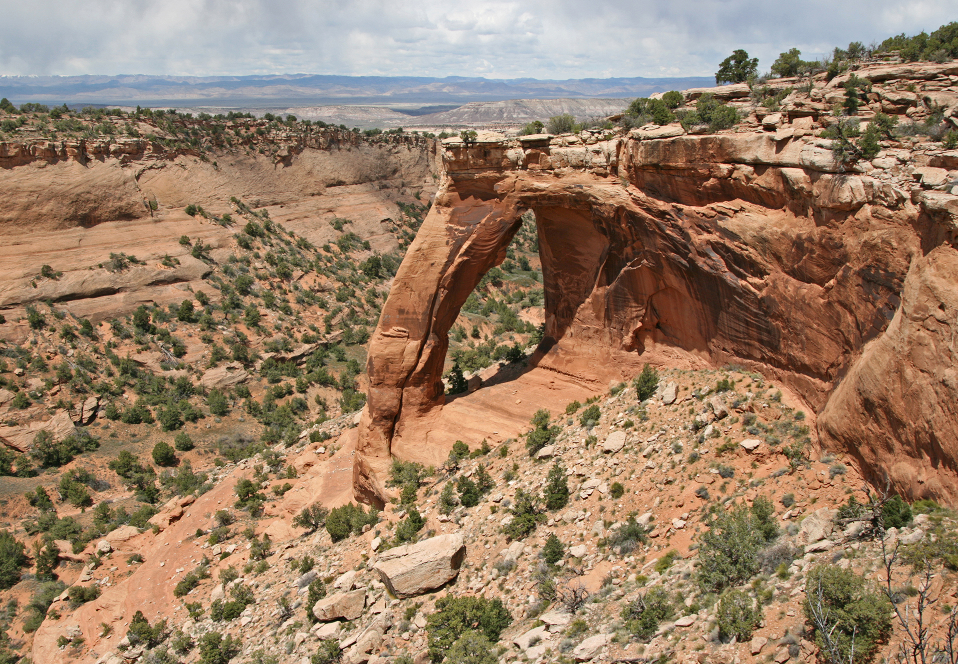 May 1. Perseverance is a spectacular arch that can be reached by a fairly easy 8-mile walk, and so 16-mile round trip. We wandered a bit in the area of the arch, and so took 9 miles to the arch, but 8 miles back. UTM 1927 coordinates are 12S 0667340E 4323200N. From the Jones Canyon trailhead the road goes all the way to a grass landing strip on the state line. From there, head NW to the arch, which is close to the cusp of the V where two canyons come together, but on the left arm as you approach. One can get to the canyon bottom, and therefore into the arch, by using a broken slope across the canyon, but we were content with the view from the rim. The width of the opening has been measured at 55 feet and the height estimated at 100 feet.