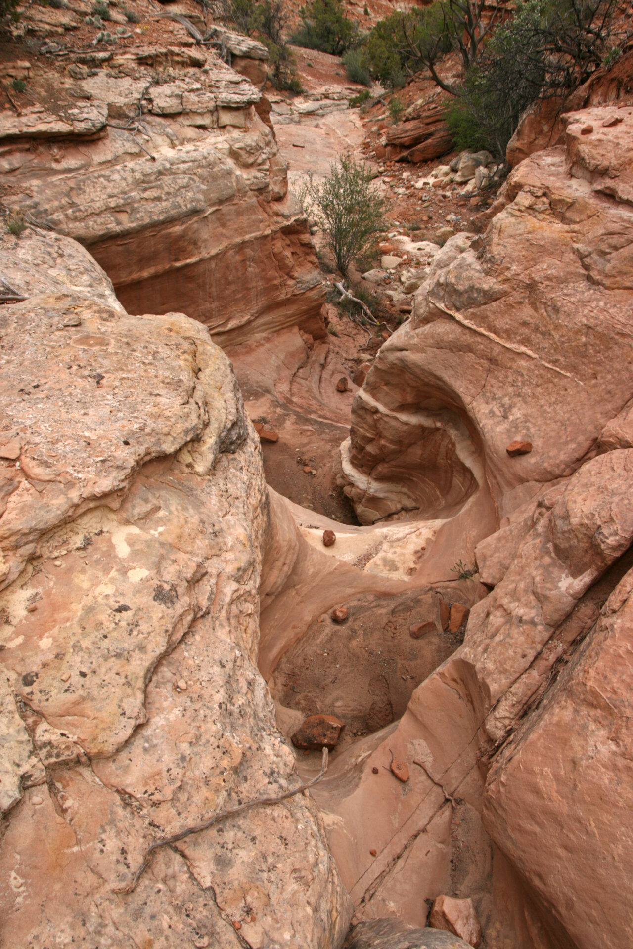 Arpil 29: I ran down the jeep road above Rough Canyon and then investigated two side canyons of Rough: One involving a nice climb up a wet move, and the other a nice short slot canyon, but I did not have the nerve to climb up the entrance. So I went around and investigated a bit from the top. It is a very short slot. Here is the view at the lower entrance.