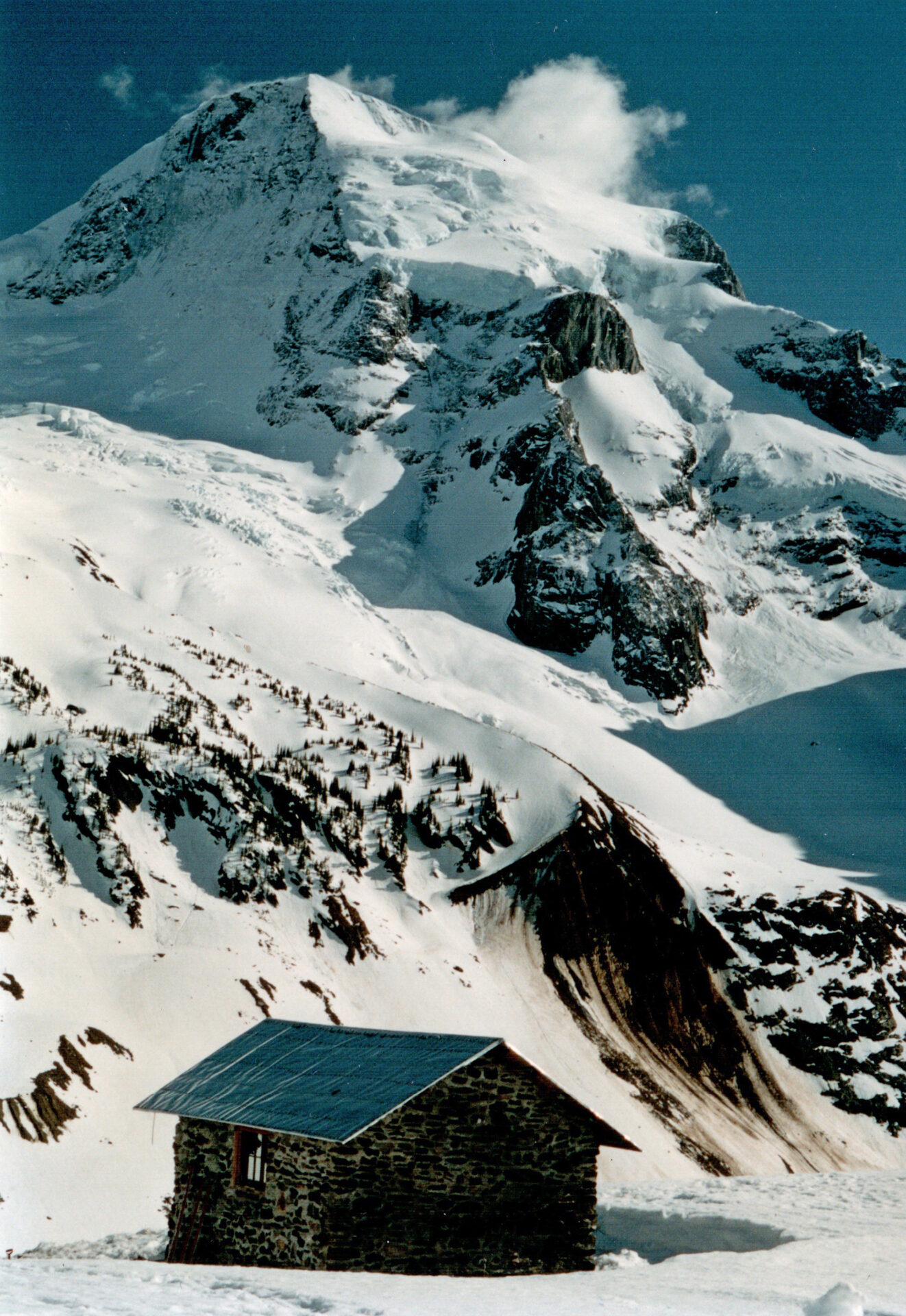 4/18/1994: Flew in by helicopter from Golden. Great weather. Another party of 6 was there, but they camped in tents and left the next morning. Two of them were on Mt. Sir Sandford and one made the summit; other waited 500 feet below.