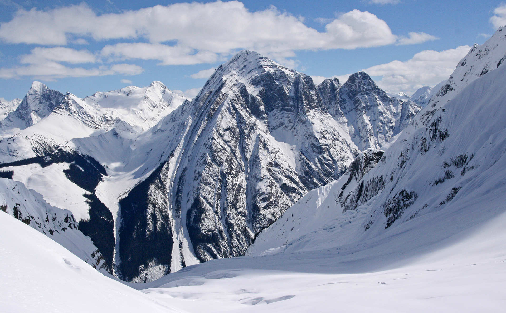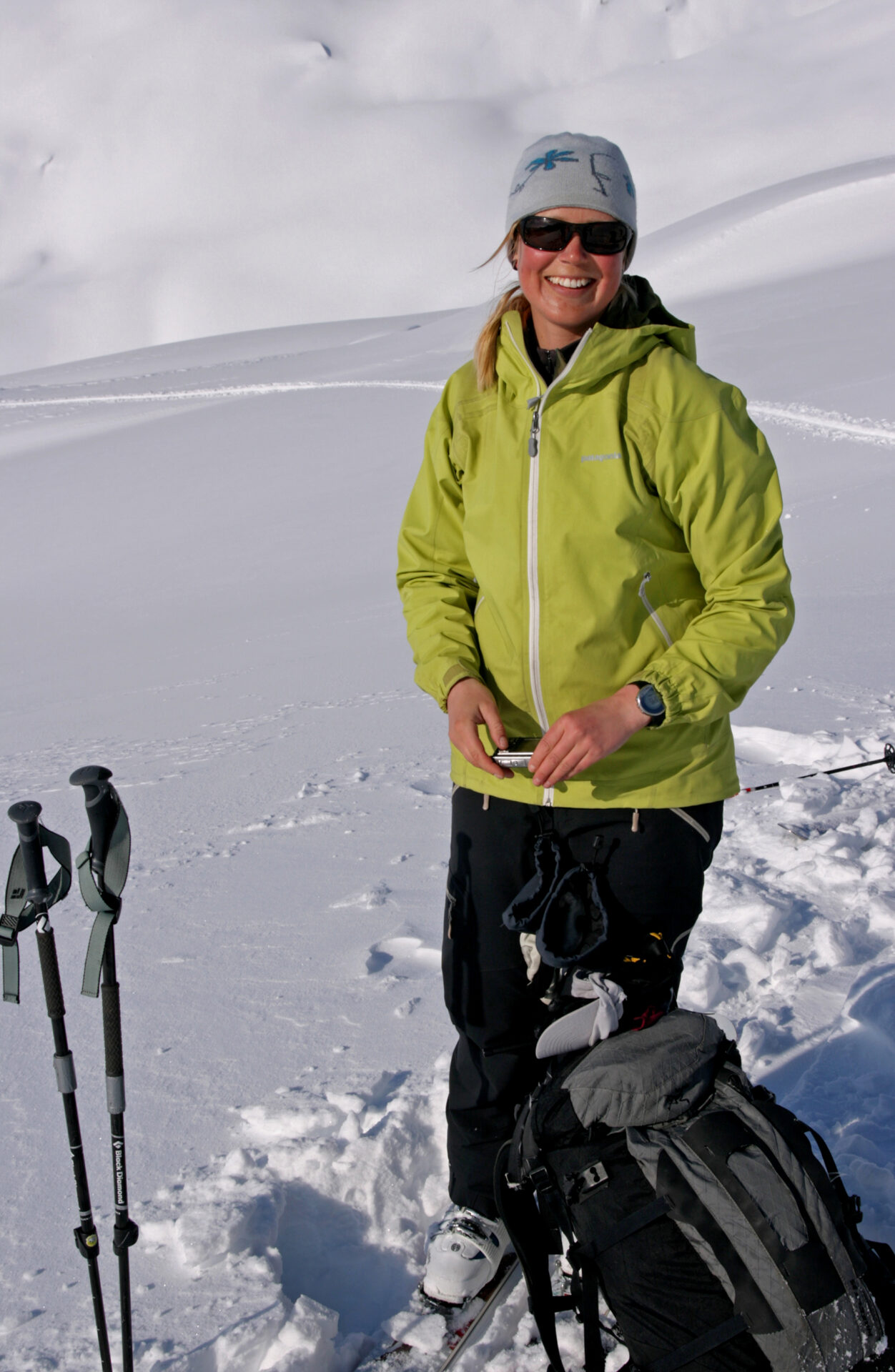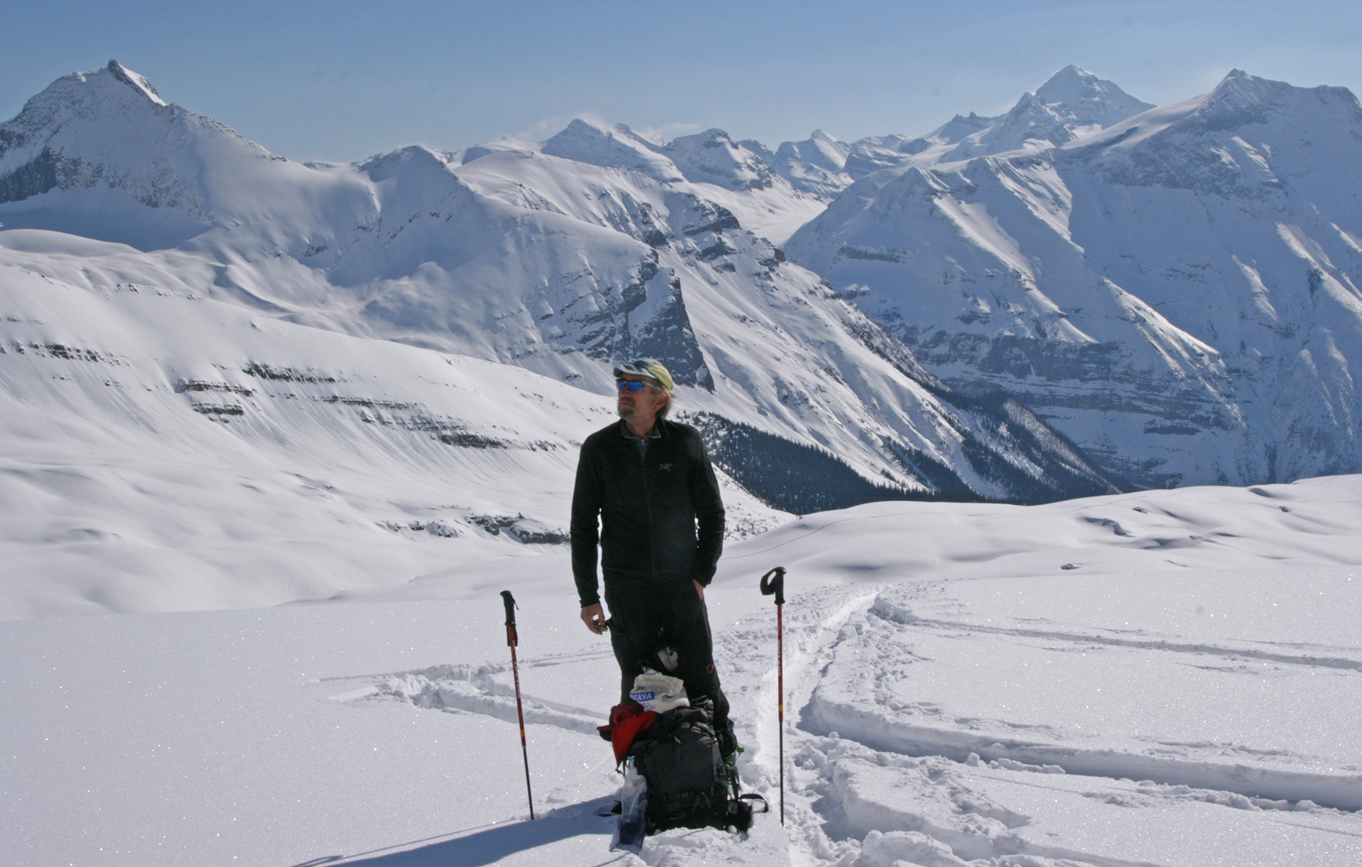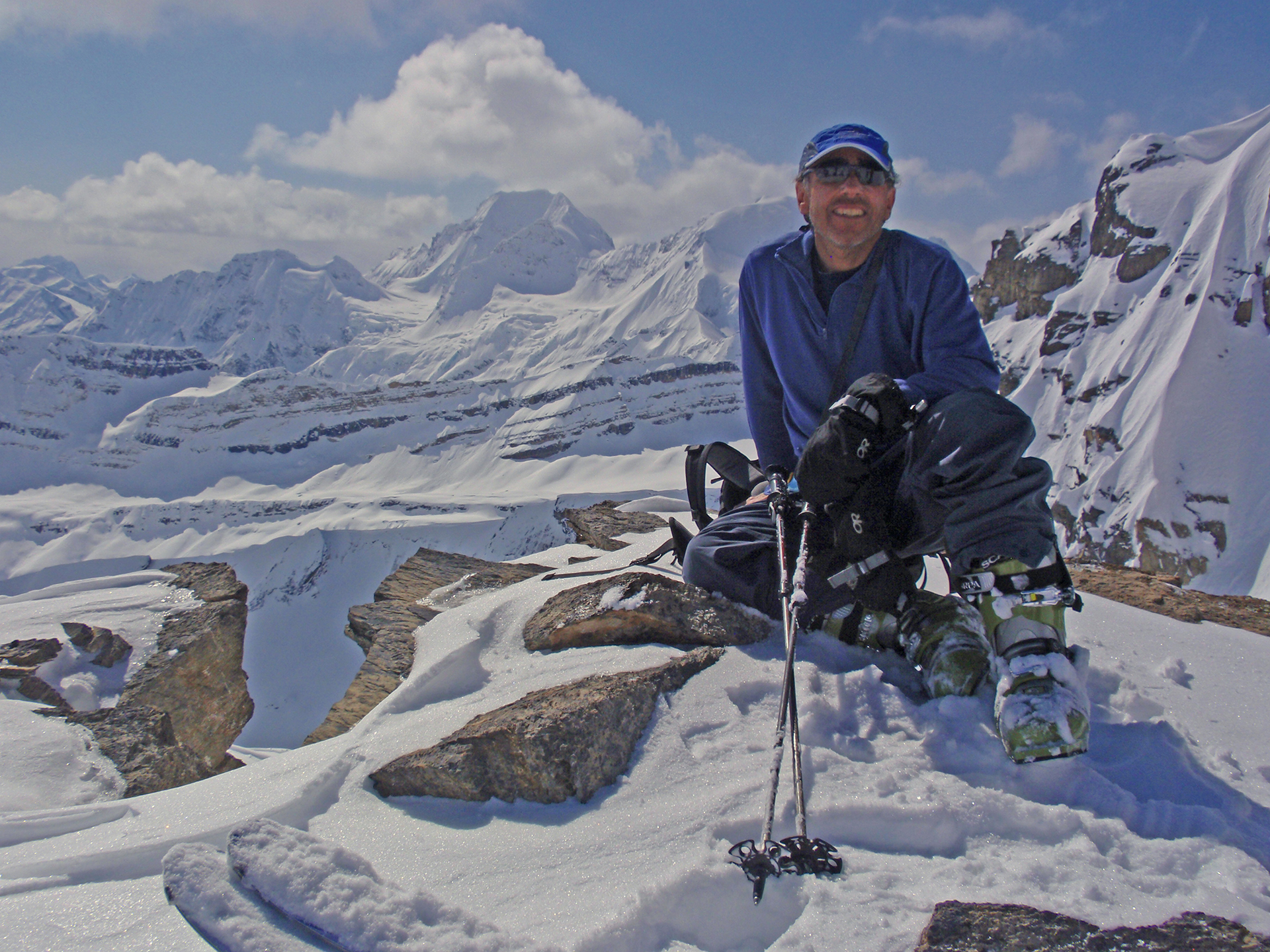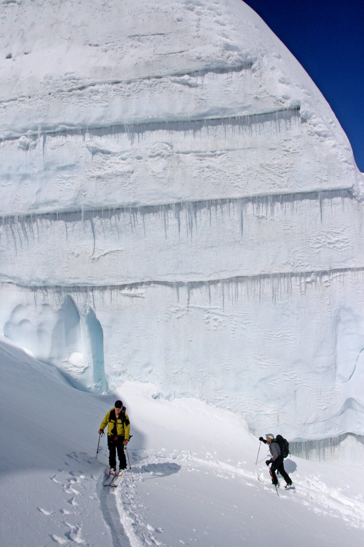 Thursday: Interesting. 5800 feet. We all packed the extra stuff needed to go over to the hut on the Lyell Icefield. That extra stuff was: one lunch, a headlamp, and a toothbrush. But we had an avalanche at Kefi Col that forced a change in plans. Eve, Larry, and Geoff climbed 40 feet to ski from the top. I followed and skied a line from a slightly less steep entrance to skier’s right. Andy, Michelle, Bob skied the slope skied yesterday, avoiding the climb. Peter and Chiu then skied from the top too, by which point all but Andy, Chiu, and Peter had skied the second followup pitch as well, and so were at the bottom. Emelie then followed from the top and after a few turns the slope released on her from above, completely burying her at the bottom of the pitch. We at the very bottom could not see, but heard the yell. Andy dug her out in about five minutes; she was a meter or just less below the surface, totally immobile. Peter reported that the digging out was as fast as possible. She was ok. One pole lost. Angle at top: 42˚. Size: Class 2. Crown: Varied from 6 inches to 18 inches. Total run. 300 feet. Type: Storm snow on sun crust (soft slab). So Andy and Emelie went back to Lodge. Because the back side of Crampon Col is same aspect, we abandoned our plan. We all went to the top of Groove Tube. Skied east from there twice. Then one more run from the ridge south of there. Beautiful skiing in heavy pow. Easy to tele! Then various slopes down to the avy path, like those we skied in 2007, and climb back up and over Kefi Col. On LaClytte the snow depth measured on one of our slopes by probe: 3 meters; almost 10 feet.