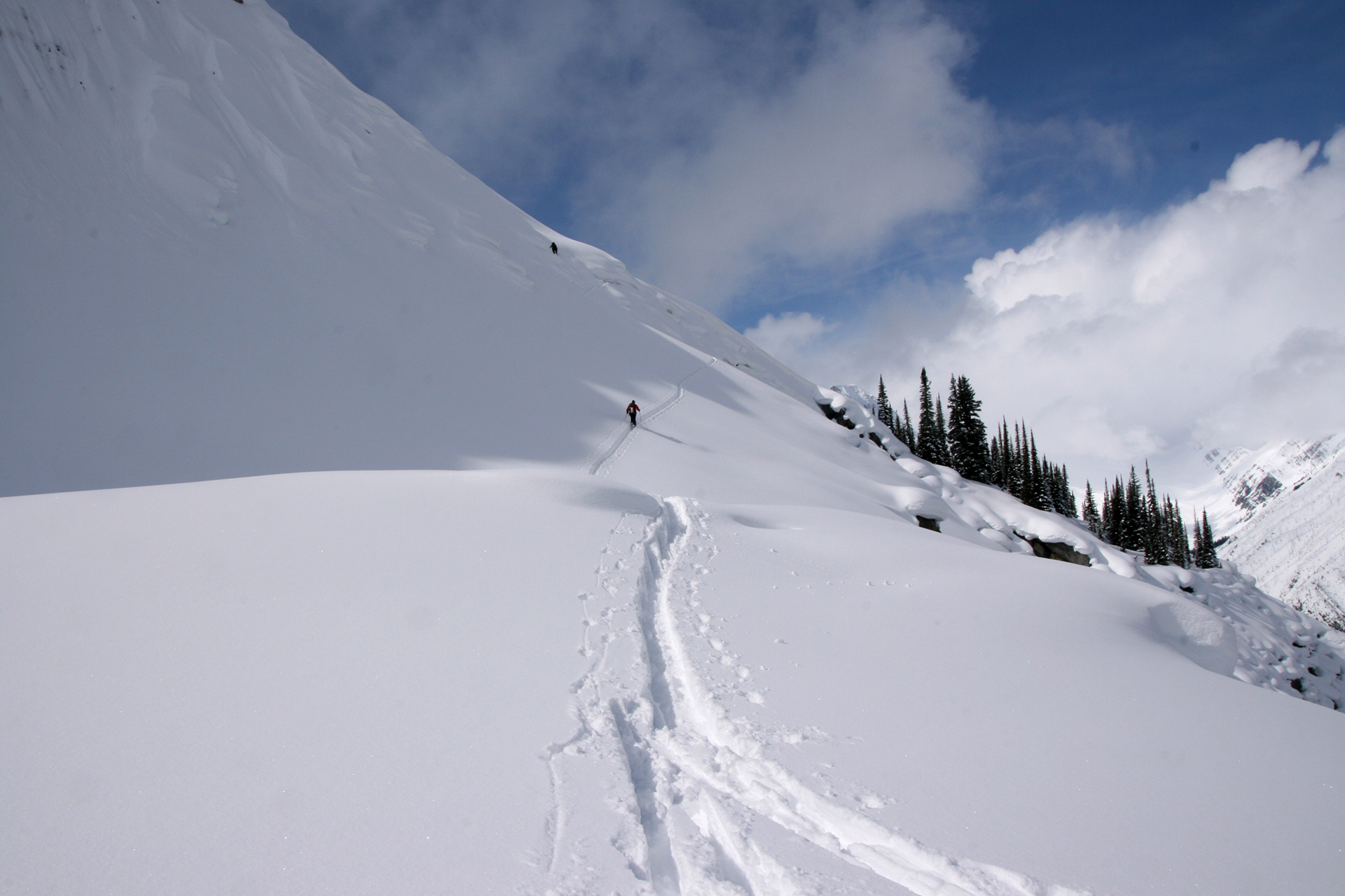 Tuesday April 5: 5400 feet. Snowing. So a day in the trees, but really big avy paths. But it was really phenomenal terrain and conditions. Much too steep and deep for me to even try telemarking so I gave in and just made parallel turns. With my new boots it was just effortless. A whole new world. Larry calls this “credit card skiing”: we started by climbing a bit west and then did successive descents down the valley, each time descending more than we climbed. We pay the bill at the end with a 1600 ft climb to the hut. Runs skied today: Alien Bowl, Lust, then three laps of Greed. Saw a ptarmigan. Saw a huge avy on the opposite side of the main valley, starting high on Mons. The final climb up to the hut was quite nice as we used a stream canyon at the start. Pressure up a bit so maybe we can go back to the alpine tomorrow.