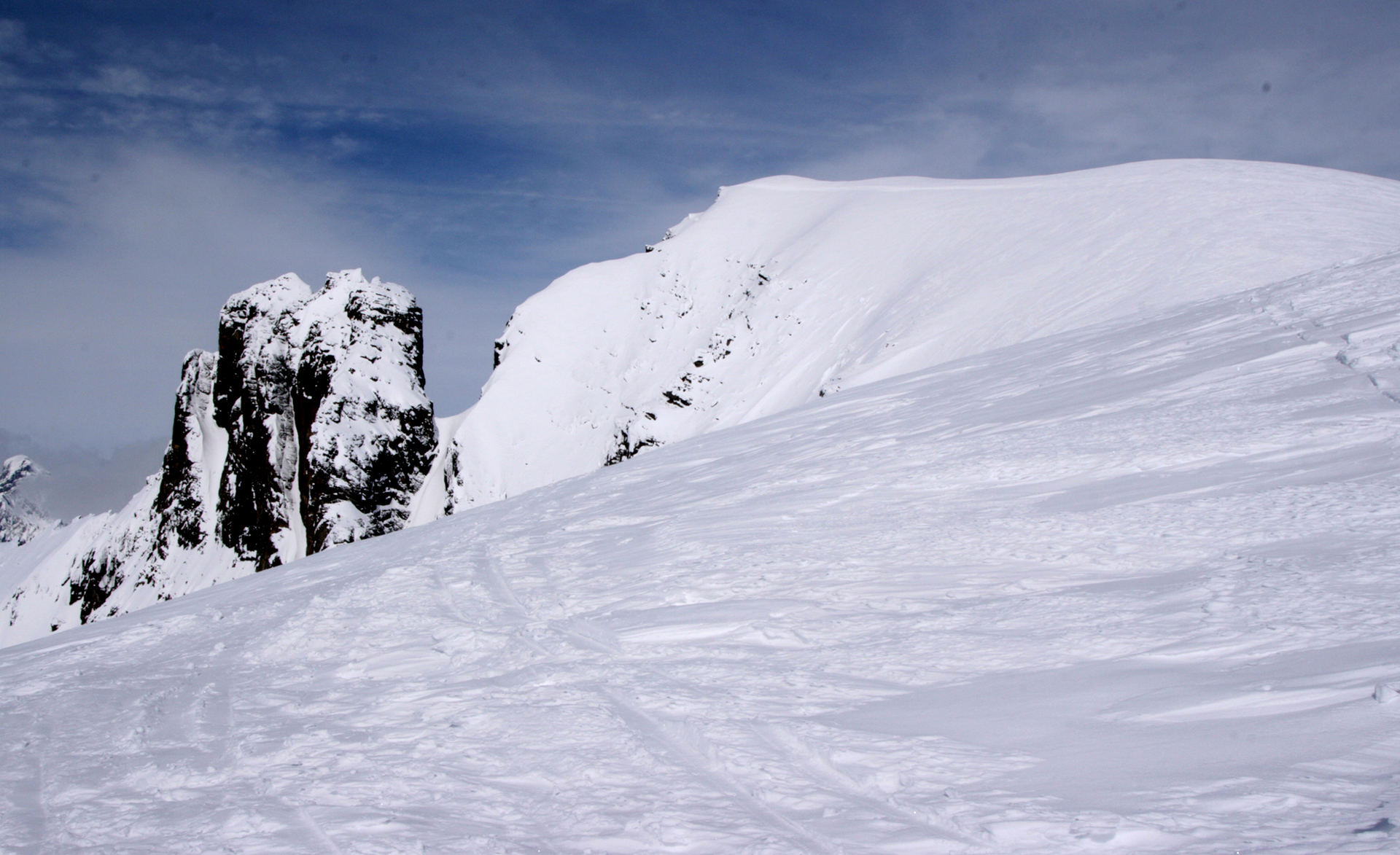 Friday: 7300 feet. Eleven people to Kemmel summit. Lovely, especially the last exposed traverse to the top between a huge dropoff on the left and very large cornices on the right. Near Ice Pass the probe never hit bottom. So at least 3.2 meters of snow, probably more. Then all guests except Bob were led by Emelie and Andrew down Vitamin P. Emelie and Andrew both took the very steep entrance, while we amateurs went in by an easier route very slightly to the left. Snow was choppy (previously skied this week twice) and dense, settled powder. But still perfectly skiable. Steep. 45˚ for about 200 feet, then down to 35. Great couloir feeling. We skied it 1600 feet down, then did a descending traverse to hit the up track back to the Portal. Very cool day, especially as the first descenders were from our group in 2007. And I had not skied this much vertical in one day in many years.