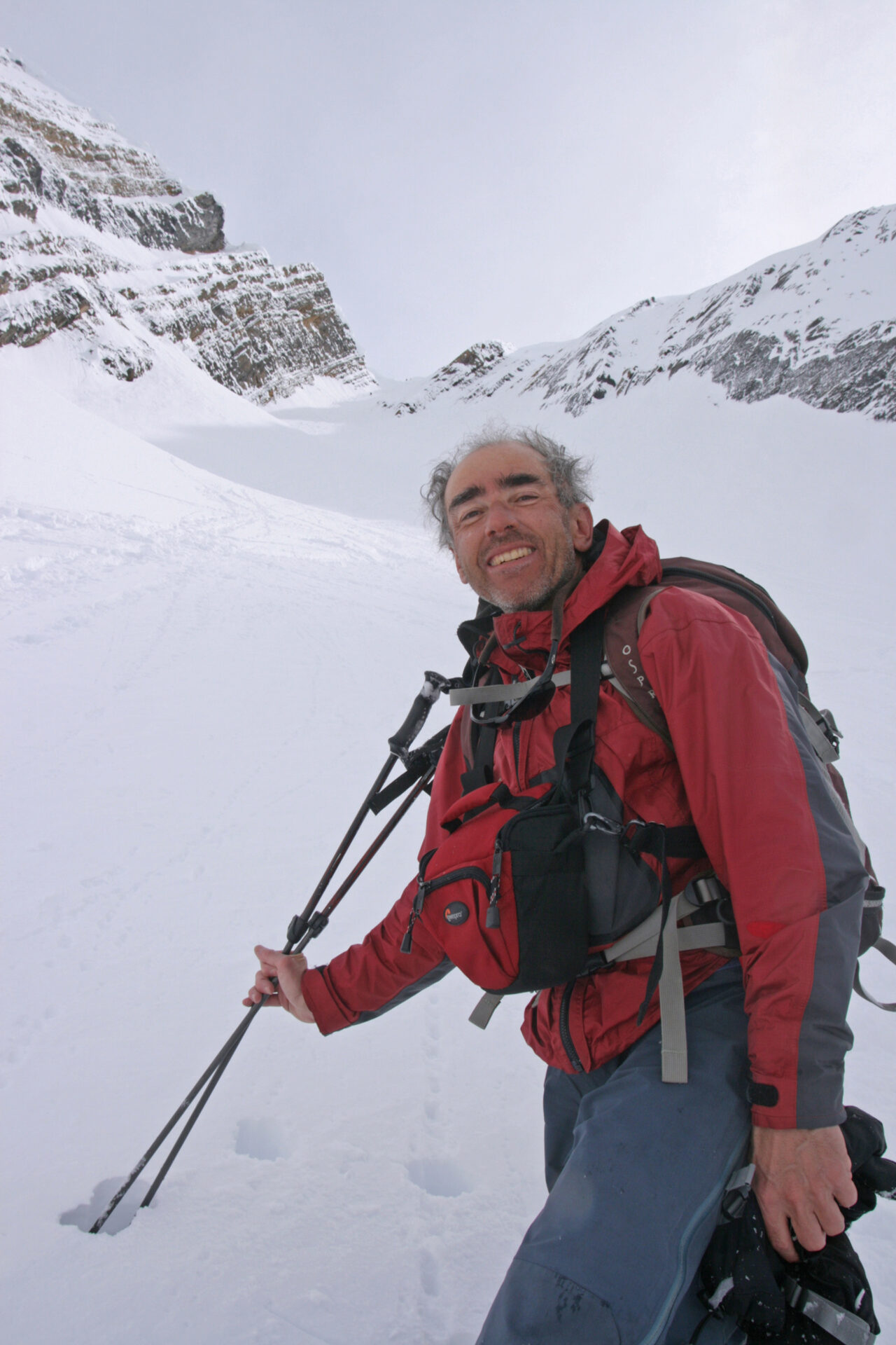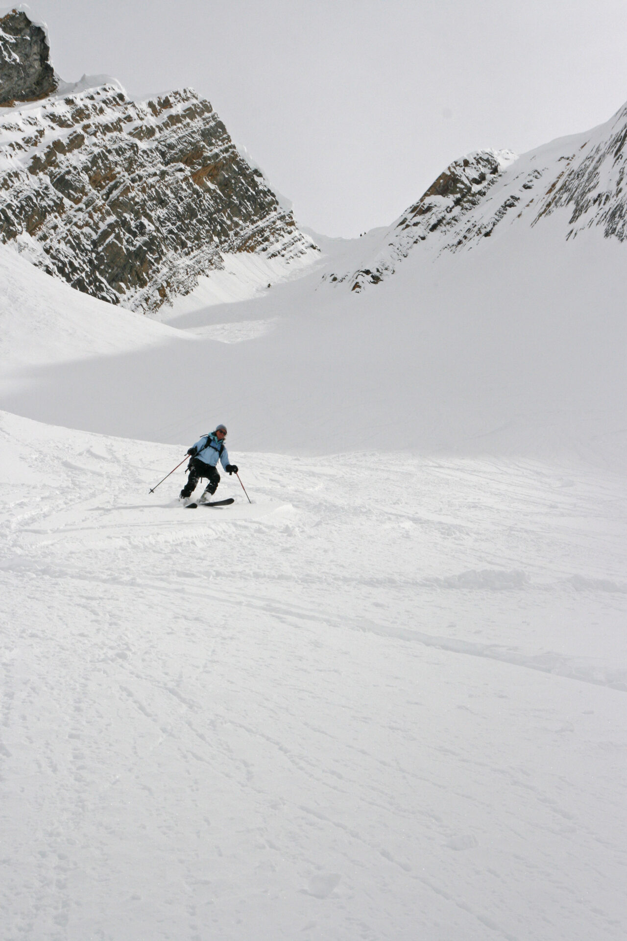 Wednesday April 6: Superb day. 6800 feet. Through Shark’s Gate (the pass E of La Clytte), down 2500 feet in perfect cold powder, complicated up-and-down traverse W back to the Kemmel-LaClytte valley, and the long climb up through the Portal and home. Cloudy start, but good light started at the Shark and continued the rest of the day. Had to walk down about 80 feet to get through the shark rocks. Larry deliberately started a Size 1.5 avy before Kefi Col. And some excitement on the descent after that as Chiu smashed into Larry at the stopping point. “Coming in too hot”. Also very exciting: ZERO falls for me, doing mostly alpine turns. [Doing alpine turns on this trip was so much fun that I never telemarked again!]