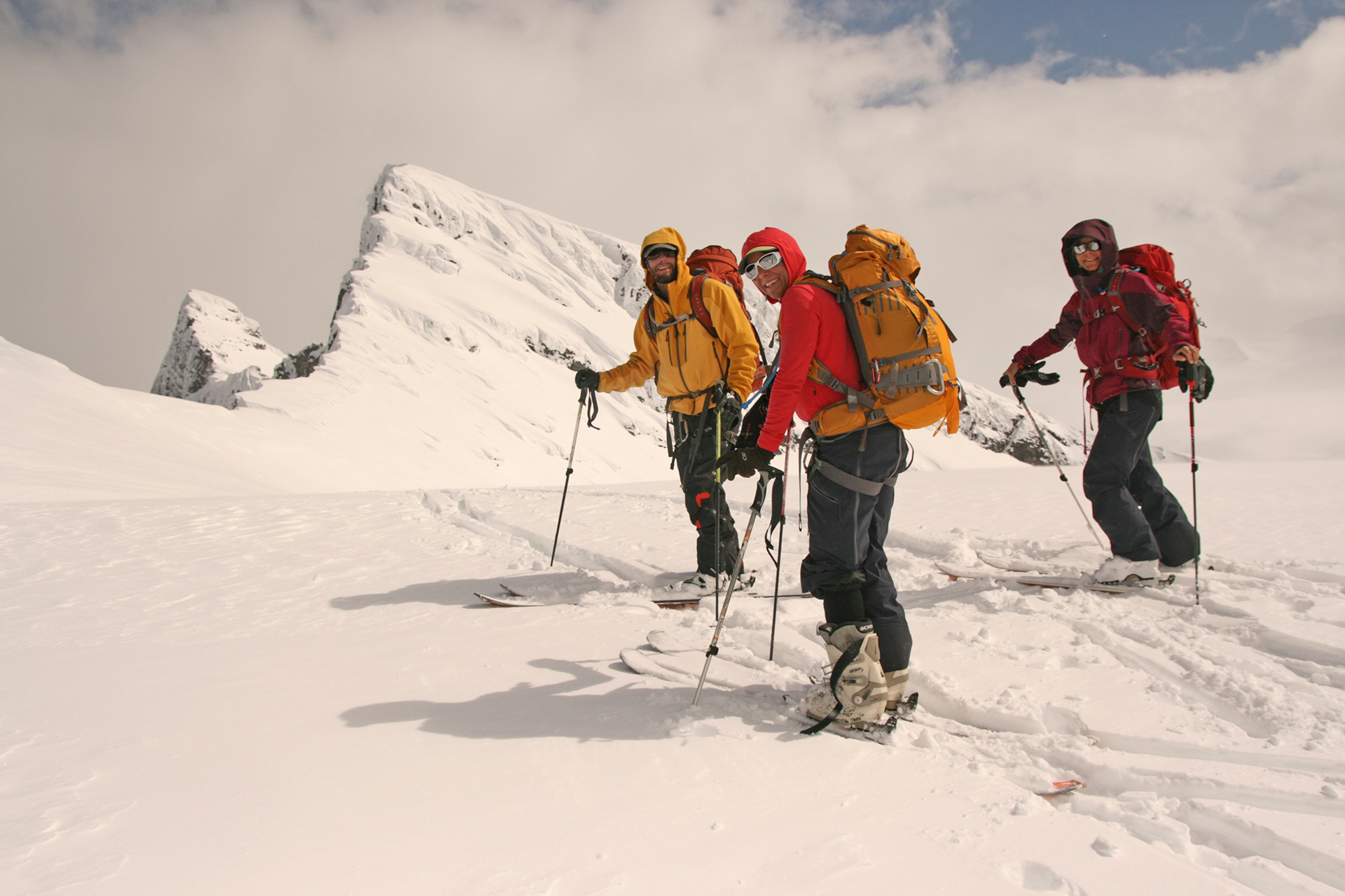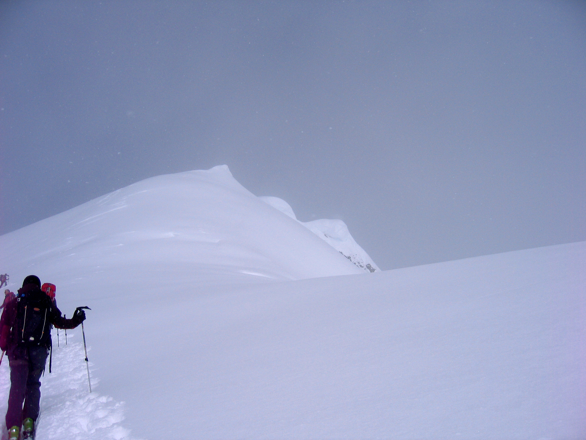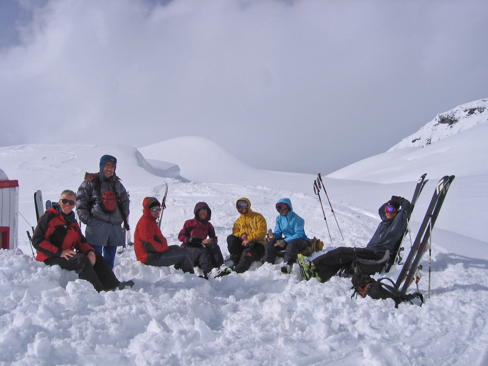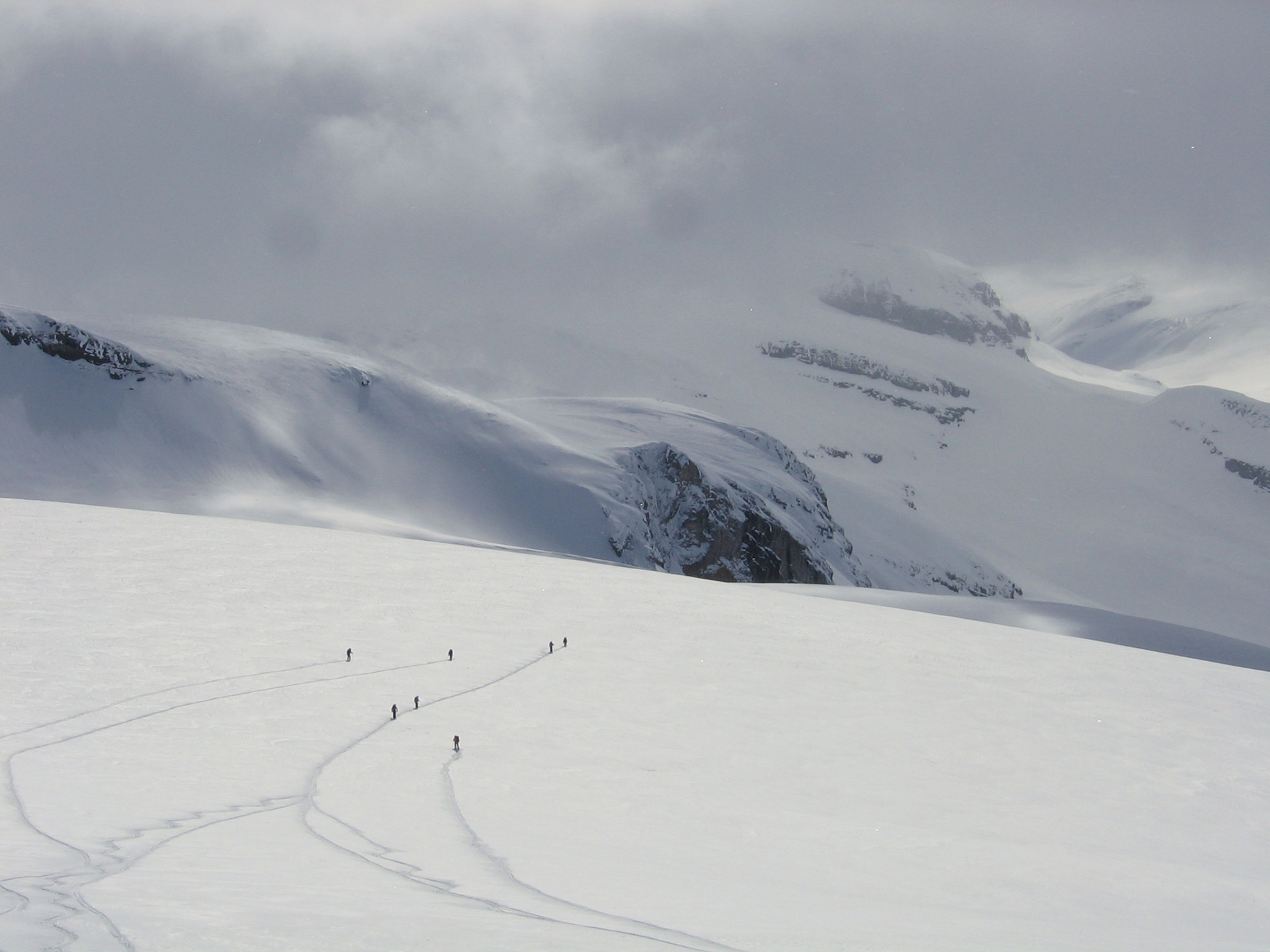Wednesday: Woke up to the familiar murk, but we headed out enthusiastically to the Lyell Icefield and got as far as the 2–3 col. There we were surprised by a whoop and a party of three skiing down to us. They were Steve Senecal and friends coming through on their traverse from the Alexandra Glacier to Peyto Hut. They had just spent two days fermenting (their word) in the tent, so were happy to be moving. They got to the Mons Hut that night. The sight of the heavy packs did lead many in our group to wonder about the virtues of true ski traversing, with tents and all the gear. It did indeed seem like a lot of work.