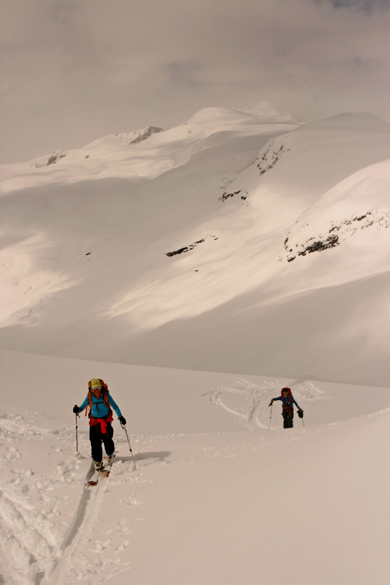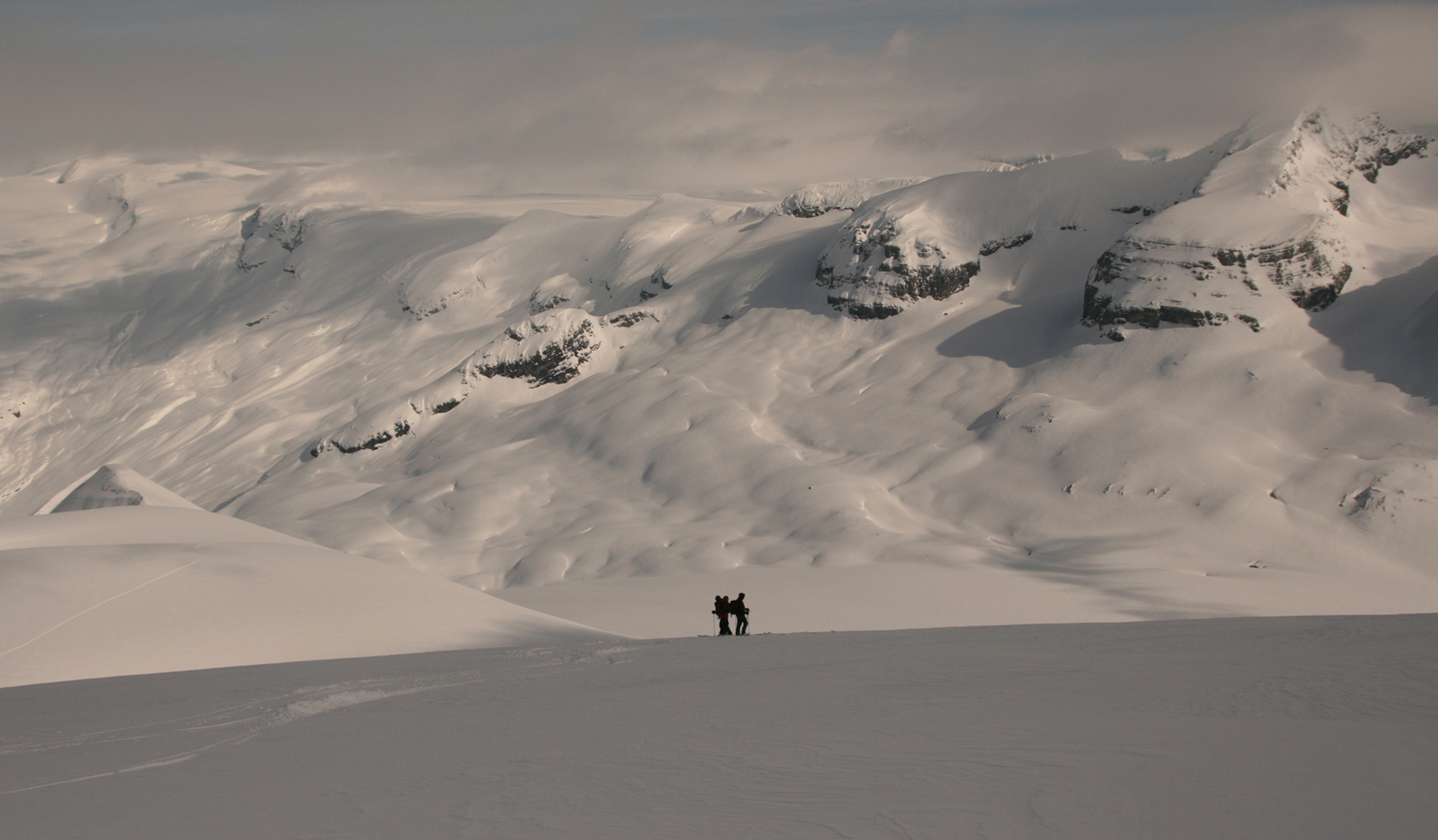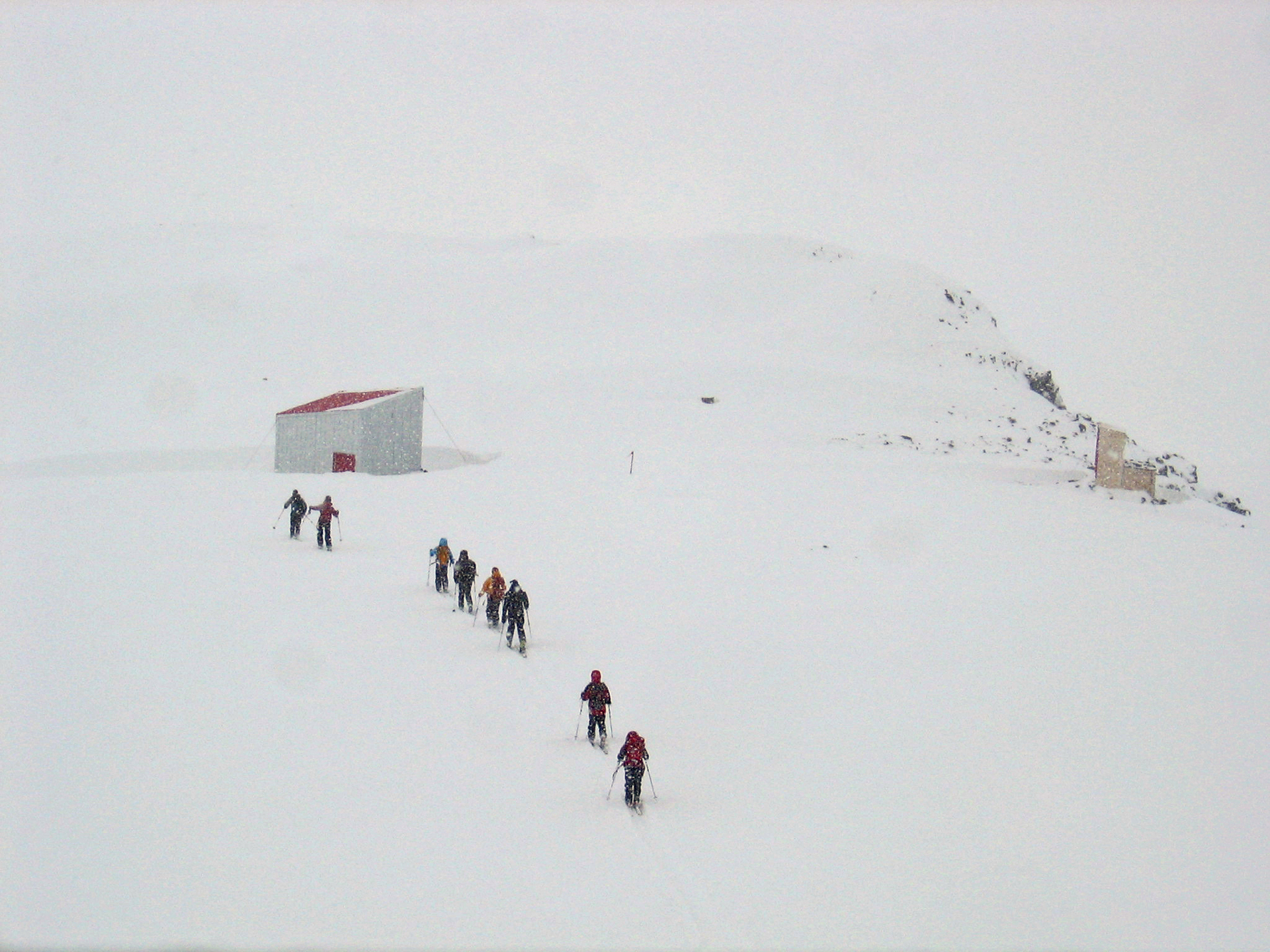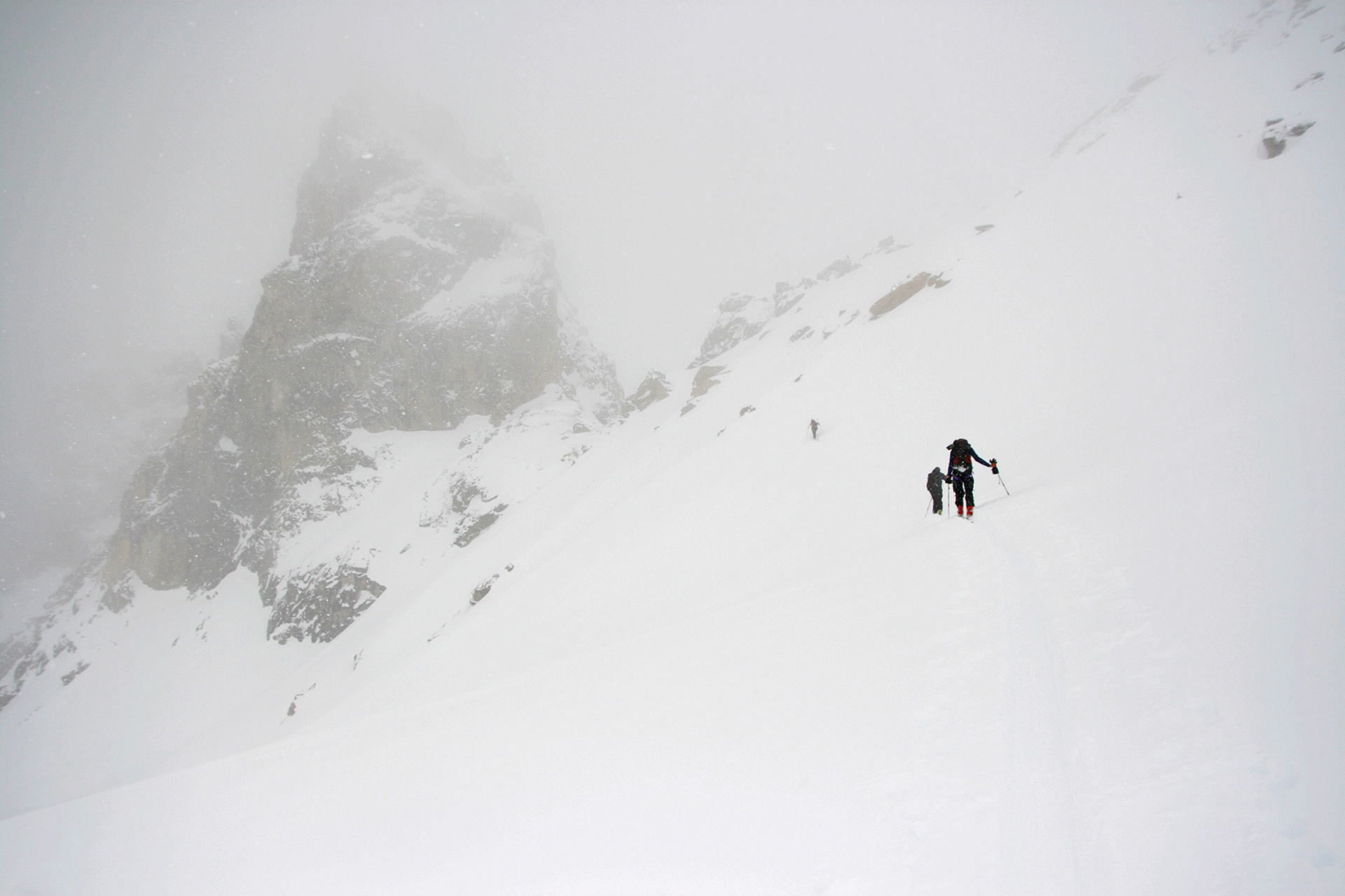 Wednesday: Woke up to the familiar murk, but we headed out enthusiastically to the Lyell Icefield and got as far as the 2–3 col. There we were surprised by a whoop and a party of three skiing down to us. They were Steve Senecal and friends coming through on their traverse from the Alexandra Glacier to Peyto Hut. They had just spent two days fermenting (their word) in the tent, so were happy to be moving. They got to the Mons Hut that night. The sight of the heavy packs did lead many in our group to wonder about the virtues of true ski traversing, with tents and all the gear. It did indeed seem like a lot of work.