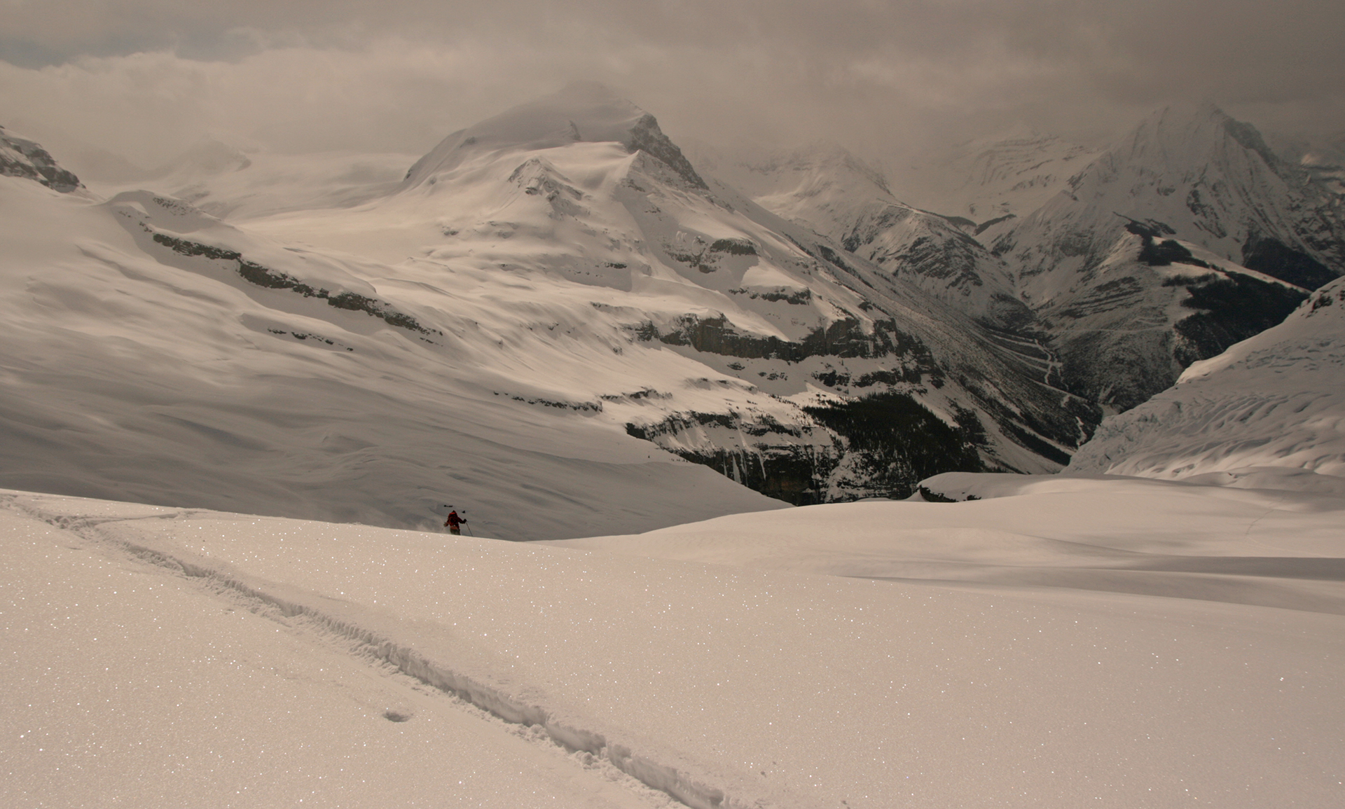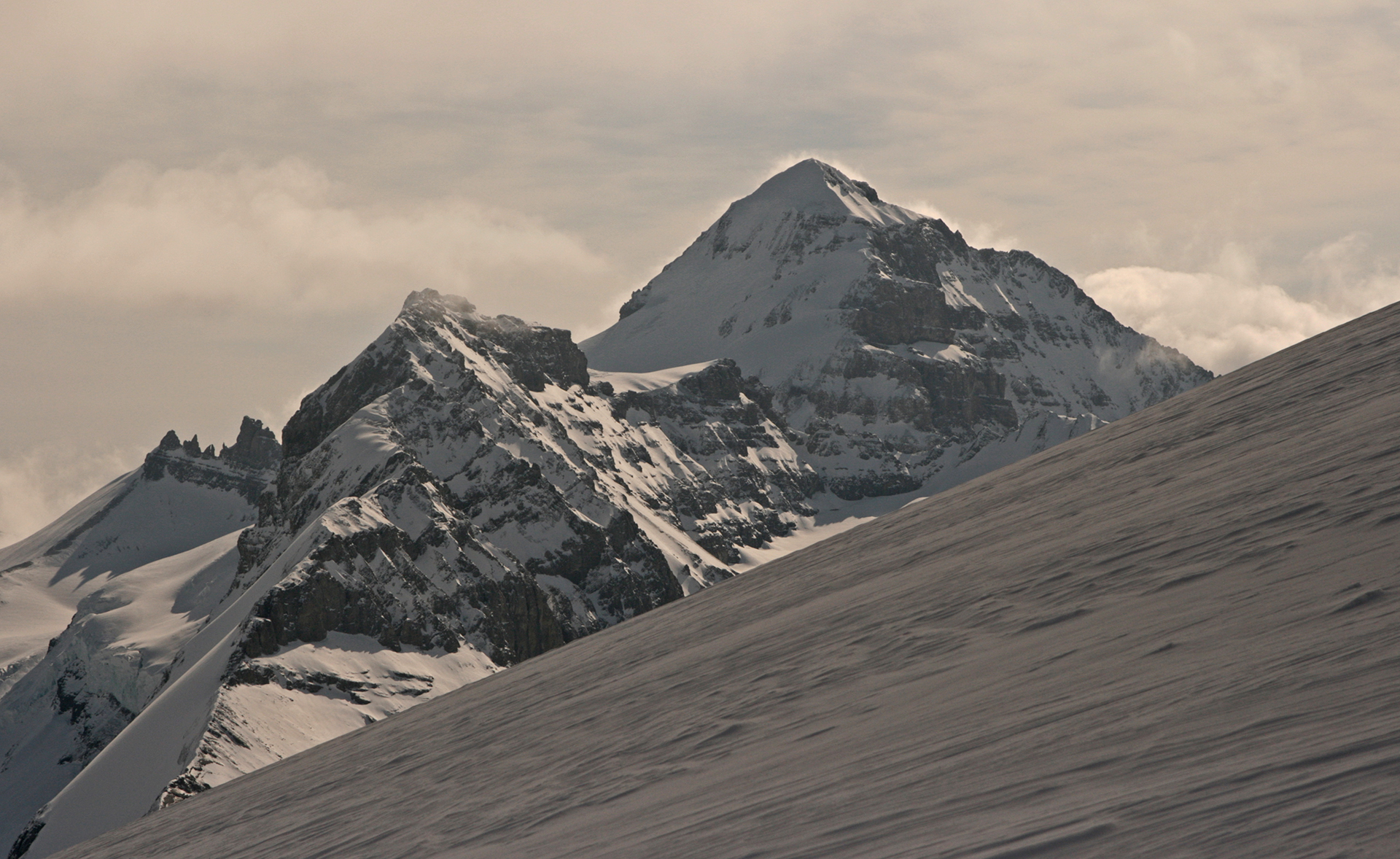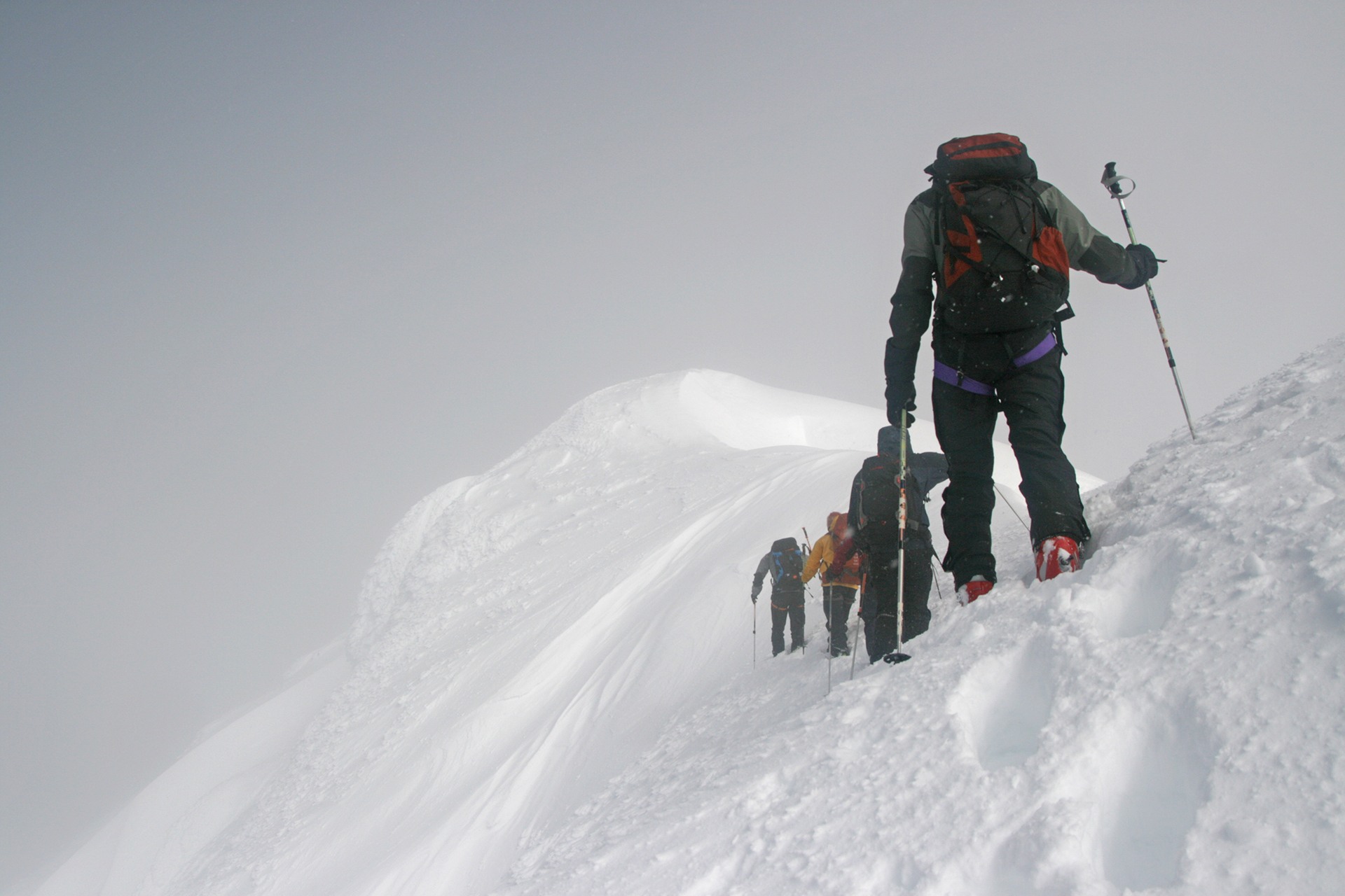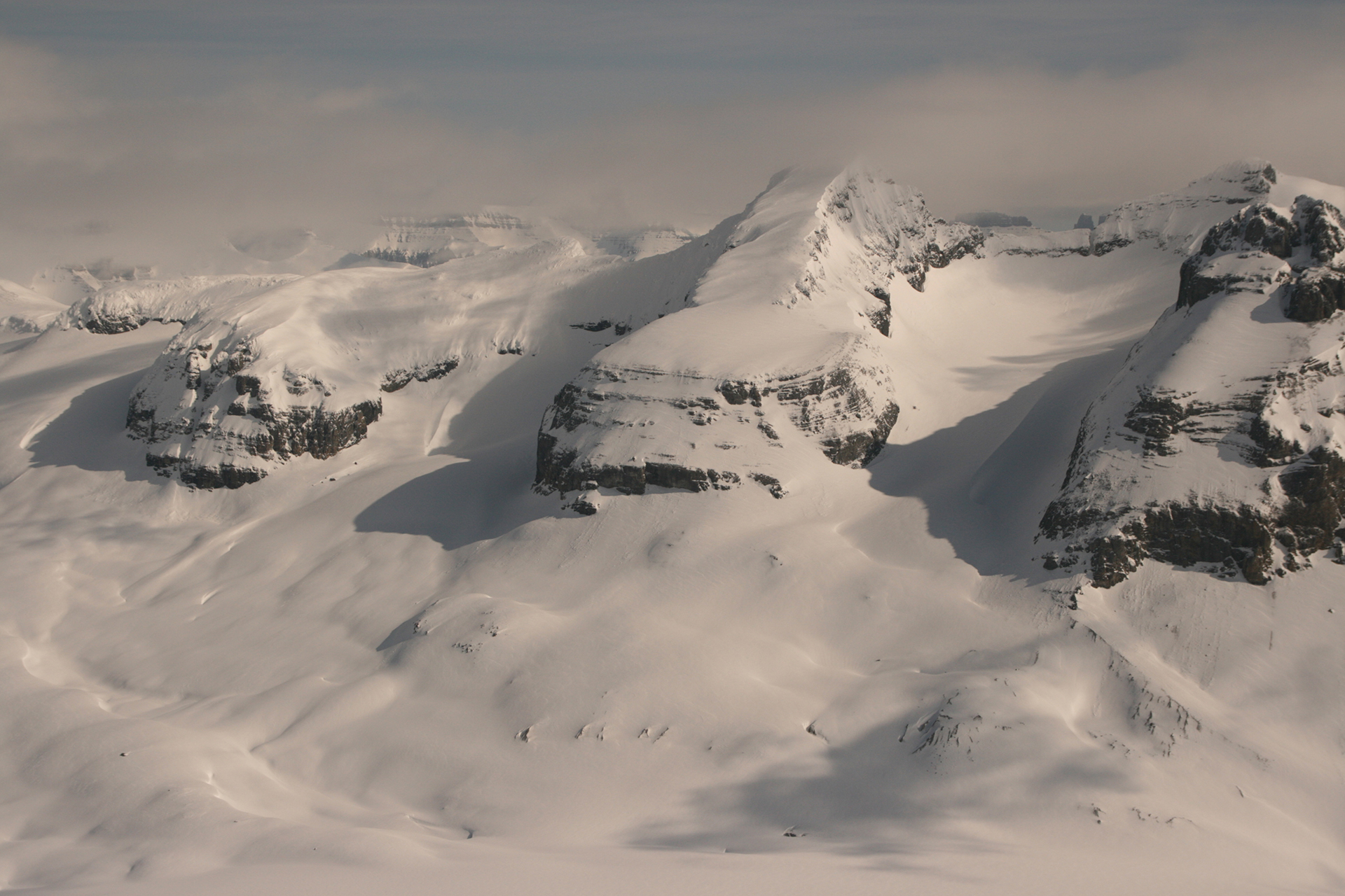 Wednesday: Woke up to the familiar murk, but we headed out enthusiastically to the Lyell Icefield and got as far as the 2–3 col. There we were surprised by a whoop and a party of three skiing down to us. They were Steve Senecal and friends coming through on their traverse from the Alexandra Glacier to Peyto Hut. They had just spent two days fermenting (their word) in the tent, so were happy to be moving. They got to the Mons Hut that night. The sight of the heavy packs did lead many in our group to wonder about the virtues of true ski traversing, with tents and all the gear. It did indeed seem like a lot of work.