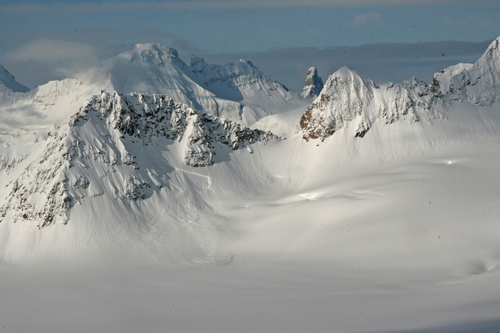 Saturday April 21: The forecast was good so we rose early and left the hut at 7:30 in an attempt to climb Mons. The ascent was fast—and much nicer than when we did it in 2003 in low visibility. We headed toward the east ridge and got very high on it, but the snow was a little slabby on the slopes above so we stopped there and skied a magnificent run back down the steep parts of the east face. At times the views on the climb were phenomenal: Forbes north face and looking north at the terrain between Icefall Peak and the Lyell Hut. We were back at the Mons hut just after 10:30 and the heli came in with no problems to pick us up. We zipped over to the Lodge to get one more person, and then the fine trip down to the cars.