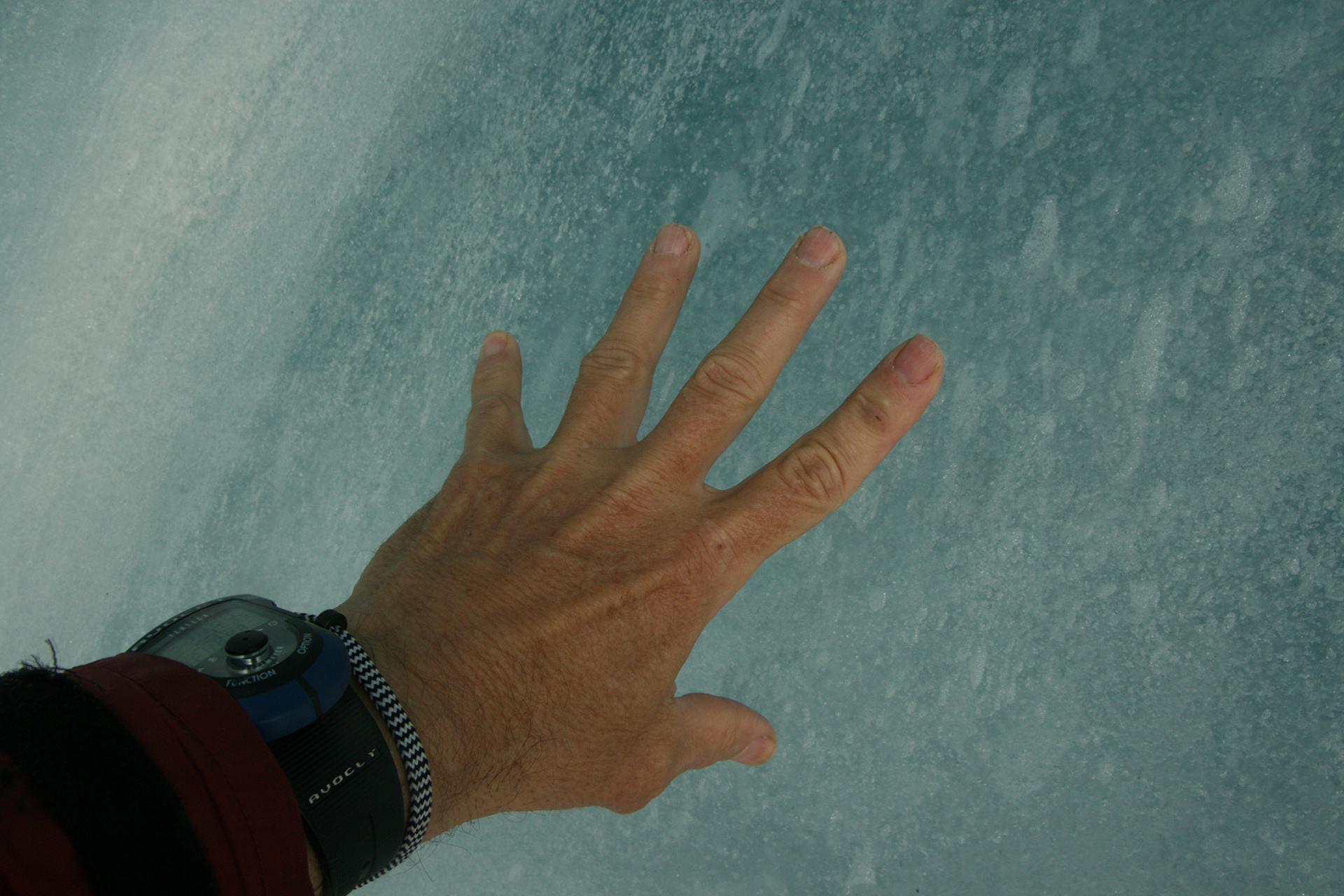 Friday: Bad weather and some stove-starting problems delayed our departure. We went first to the ice cave (GR: East 97915, North 47872) and spent some time there examining the remarkable ice. We had found this in 2003, at which time it was a tunnel (see my report on the 2003 traverse), with a hole at the far end. It seemed a little smaller this time, with no hole. Some of the ice is extremely dense (formed under great pressure) and smooth to the touch. Remarkably it feels warm and it is hard to believe that it is 32˚ or less, though it must be. This is probably related to the fact that ice has low heat conductivity. After some time there we wandered up the Spider Glacier for a pitch but did not go very far. Around 4:40 pm we headed out again (some stayed behind missing a great run) and went all the way up the Spider Glacier almost to the same snow bump of Division that we visited on Thursday. There was a very steep section through the cliffs that skied very, very well.