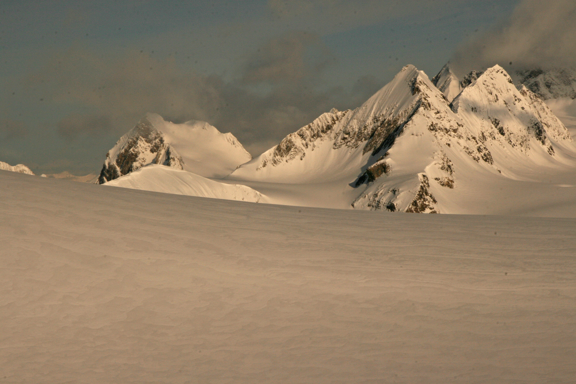 Tuesday: Weather was snowy but it seemed like we could get through Crampon Col so off we went. The ski down Keffi Col was in very low vis and we just took a low angle down. One the next climb I had gloppage and fell back a bit. But vis was improving so Pierre moved along as far as he could. When I caught up we were looking at a straightforward ski traverse into the col, something that Pierre said he had never done before (it usually requires booting the last part). The ski down the other side was a fine run in steep powder, and the trip from their to the Lyell Hut was straightforward. Finally, after many trips here, winter and summer, I was on the other side of Crampon Col. I was quite tired by day’s end and needed some recovery time in the hut. Getting the stove started was tricky, but Pierre got it and after dinner we did a twilight ski up the slopes of Twilight Peak. The powder was fine and cold. At nighe Ben cleverly fixed my gloves with dental floss and a bit of wire. Impressive effort.