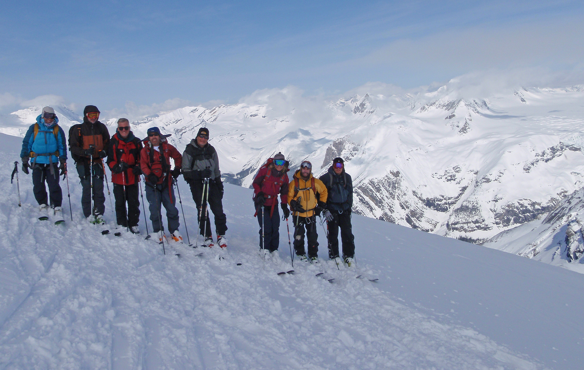 Thursday: One of the greatest ski days ever! We woke to a clear sky and took our time getting going as we enjoyed the views from our high home. As soon as Pierre left the hut, we sensed that he was going for Christian Peak, but we did not ask. Ben’s beacon failed so he was beaconless this day (Pierre fixed it at the next hut; a bad lead of some sort). We headed right for Christian and skinned up the high steep switchbacks with no problem. Then we left our skis and Pierre led out on the short traverse to the summit, making good steps in a very exposed location. The drop down to the left was gigantic so we all focused intently on each step. A steep little climb at the end put us on the summit; sadly some clouds blew in so we saw little from this 11120-foot peak. But Harvey and all of us were very happy. On descent we backed down the steep part and were very careful on the traverse. One step collapsed a little, but the snow was really very good here. A short rope was pulled out for one member and we all breathed a little easier when we were back at our skis.