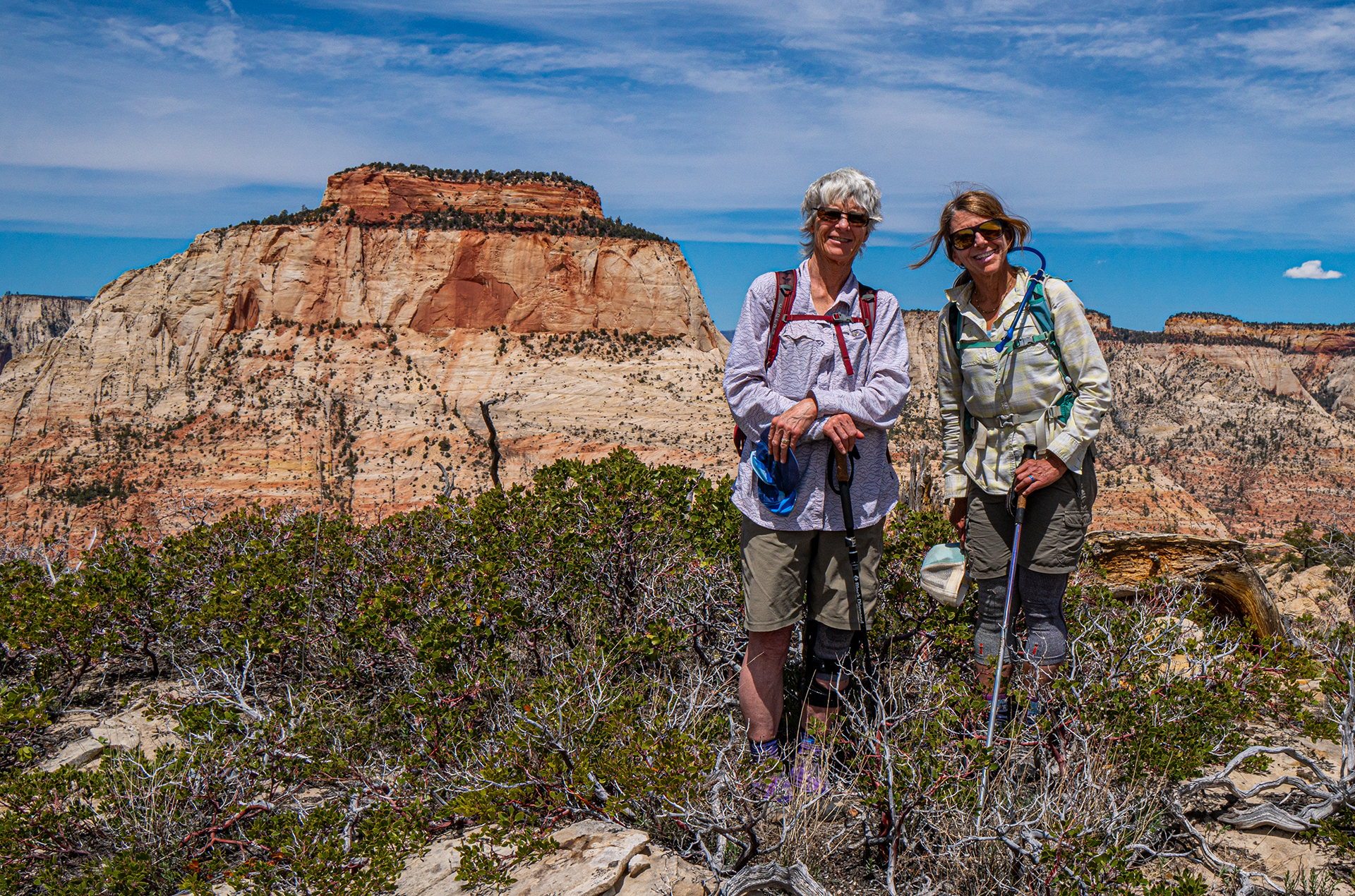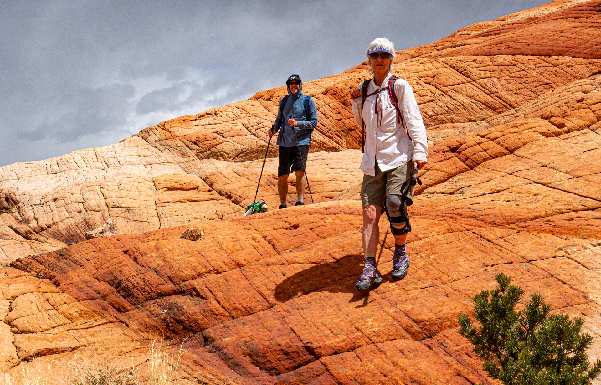 Monday April 15. East Temple Loop by Stan, Katie, Elke, Bob, Jeanmarie, Janet. It was cold and damp so we did it in reverse. The weather improved, but a squall came in as we reached the final saddle, our high point. Thus we had annoyingky wet sandstone on descent. It was manageable and the weather improved a bit. About four miles and 1000 ft climb. 4.5 hours. We went too far in Pine Creek from the track I had seen and exited the canyon by a slightly off-route class 4 slope. Beautiful sandstone throughout.