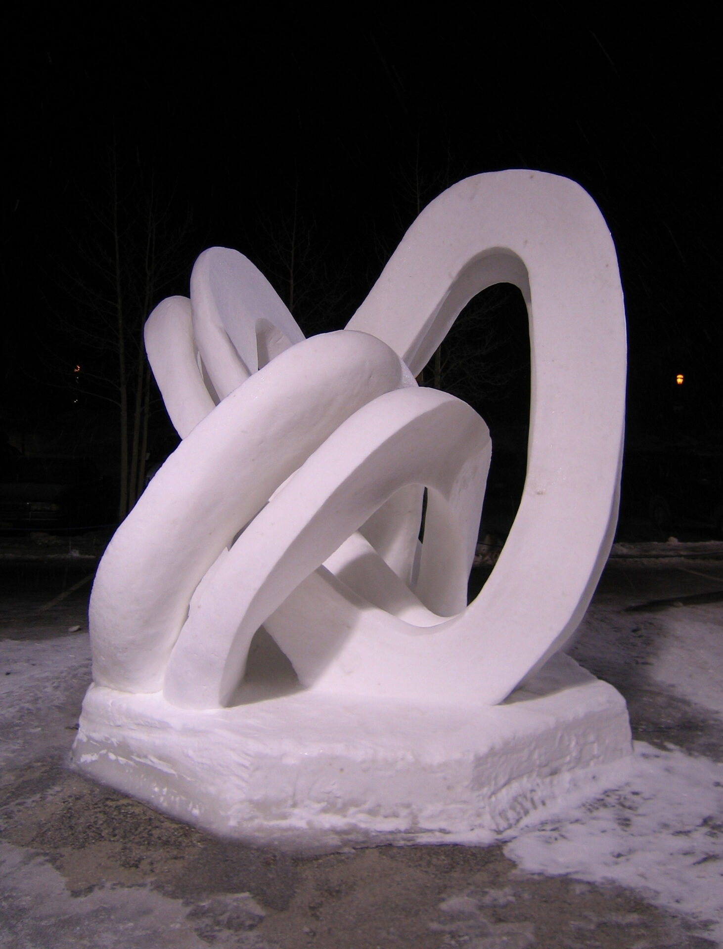 FOR MATHEMATICIANS ONLY: There is a self-referential beauty in our sculpture: If one forms a Möbius band by twisting a belt through three half-turns (instead of just one), then the band’s edge forms a trefoil knot. Mathematicians classify the complexity of knots by the minimum number of line crossings that one must have when trying to draw that knot on a piece of paper.