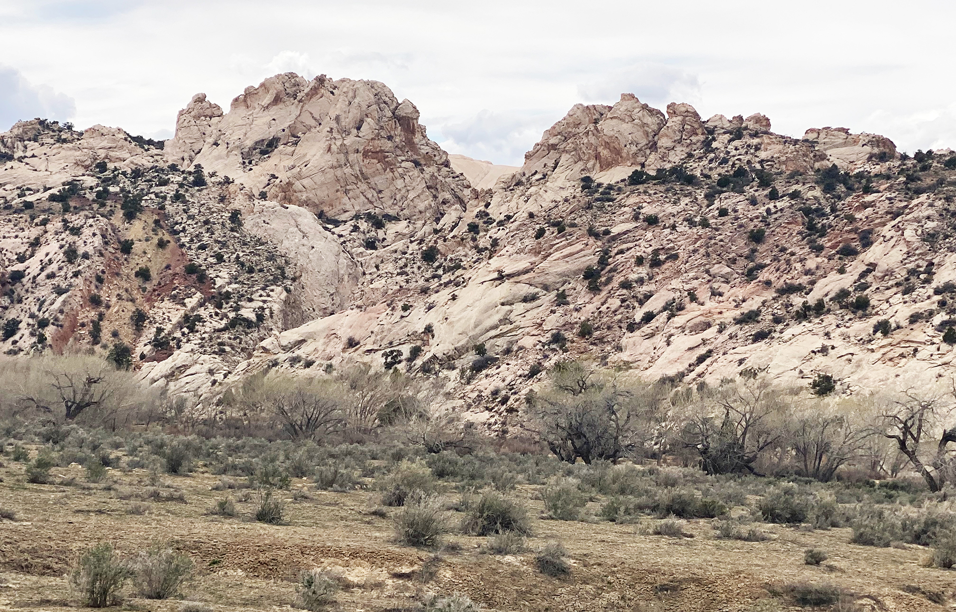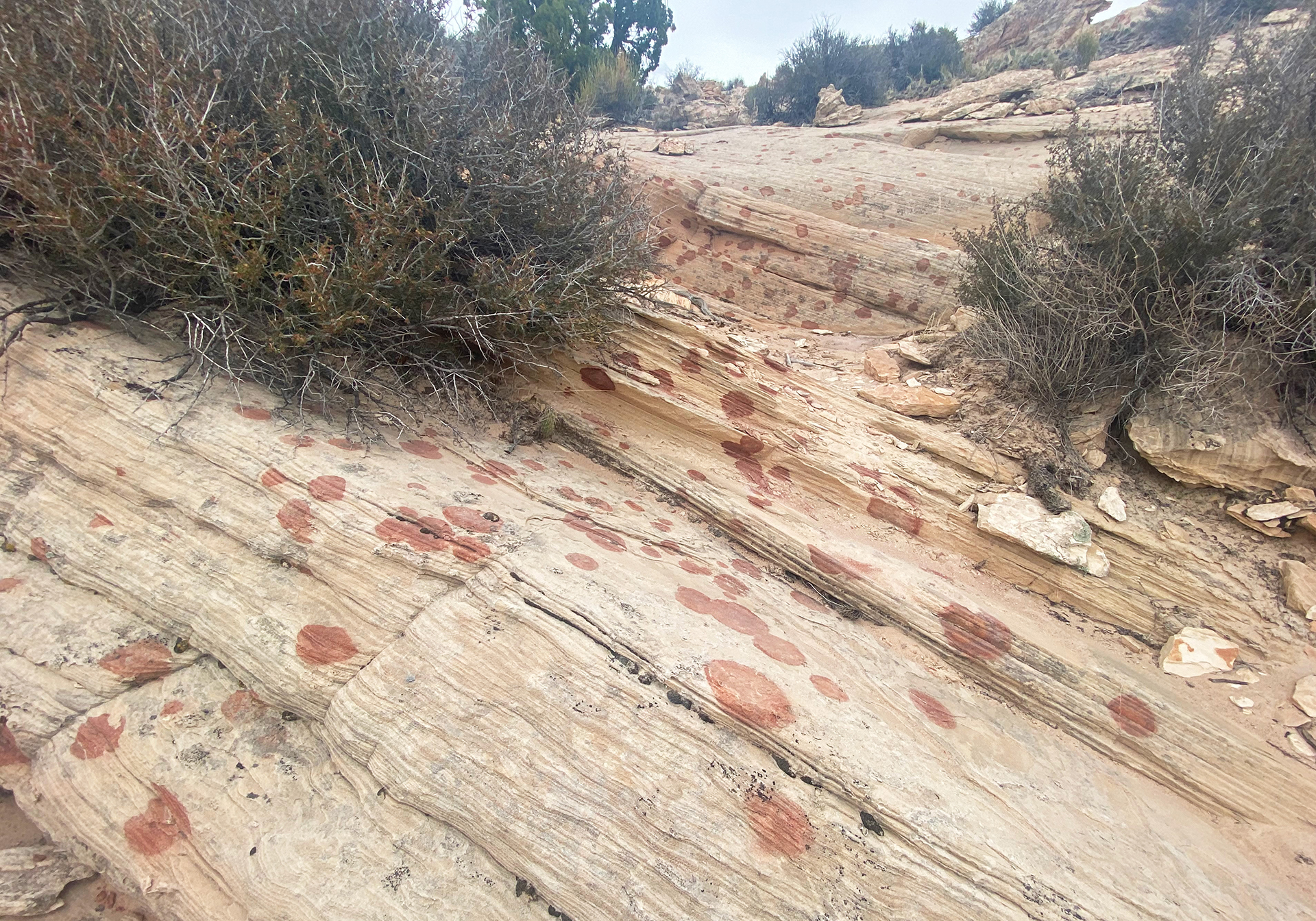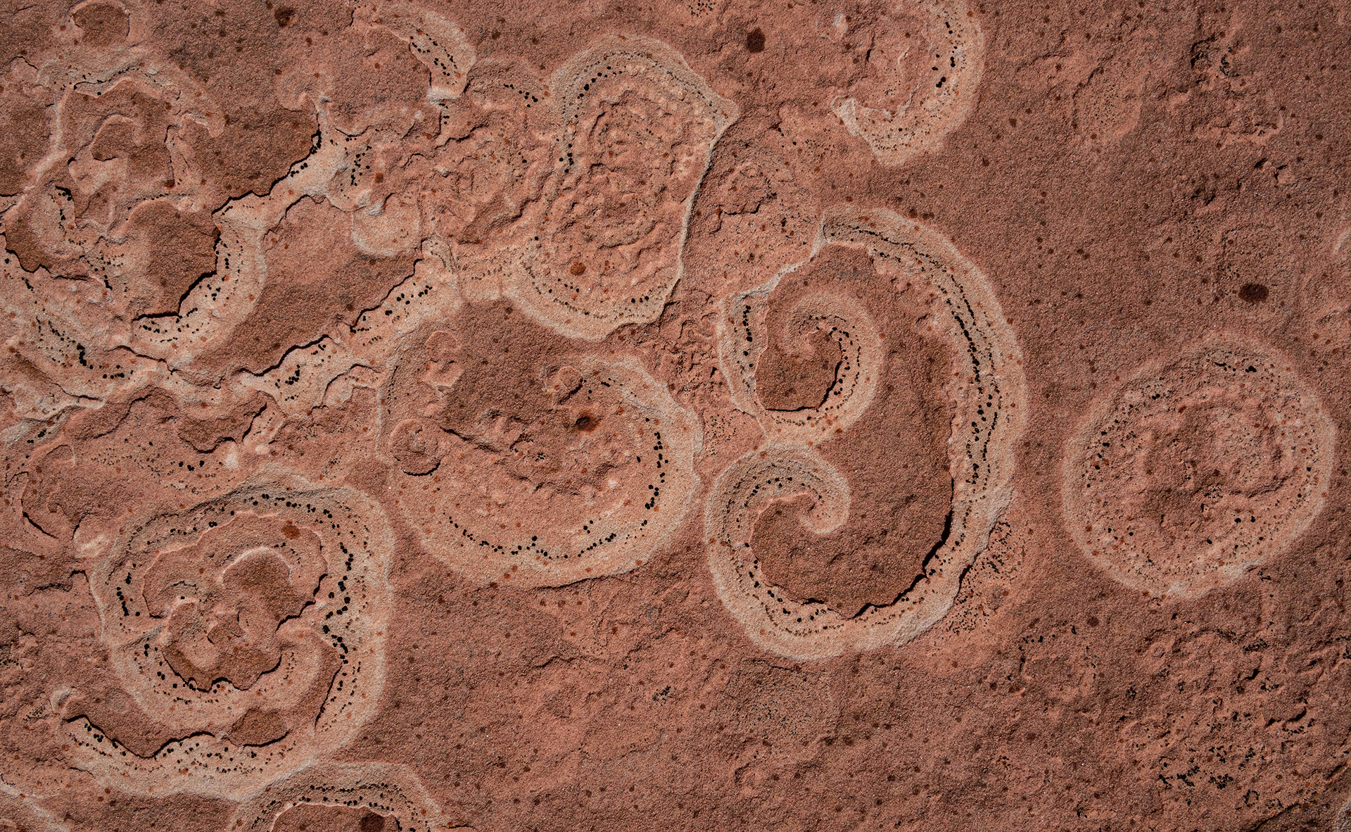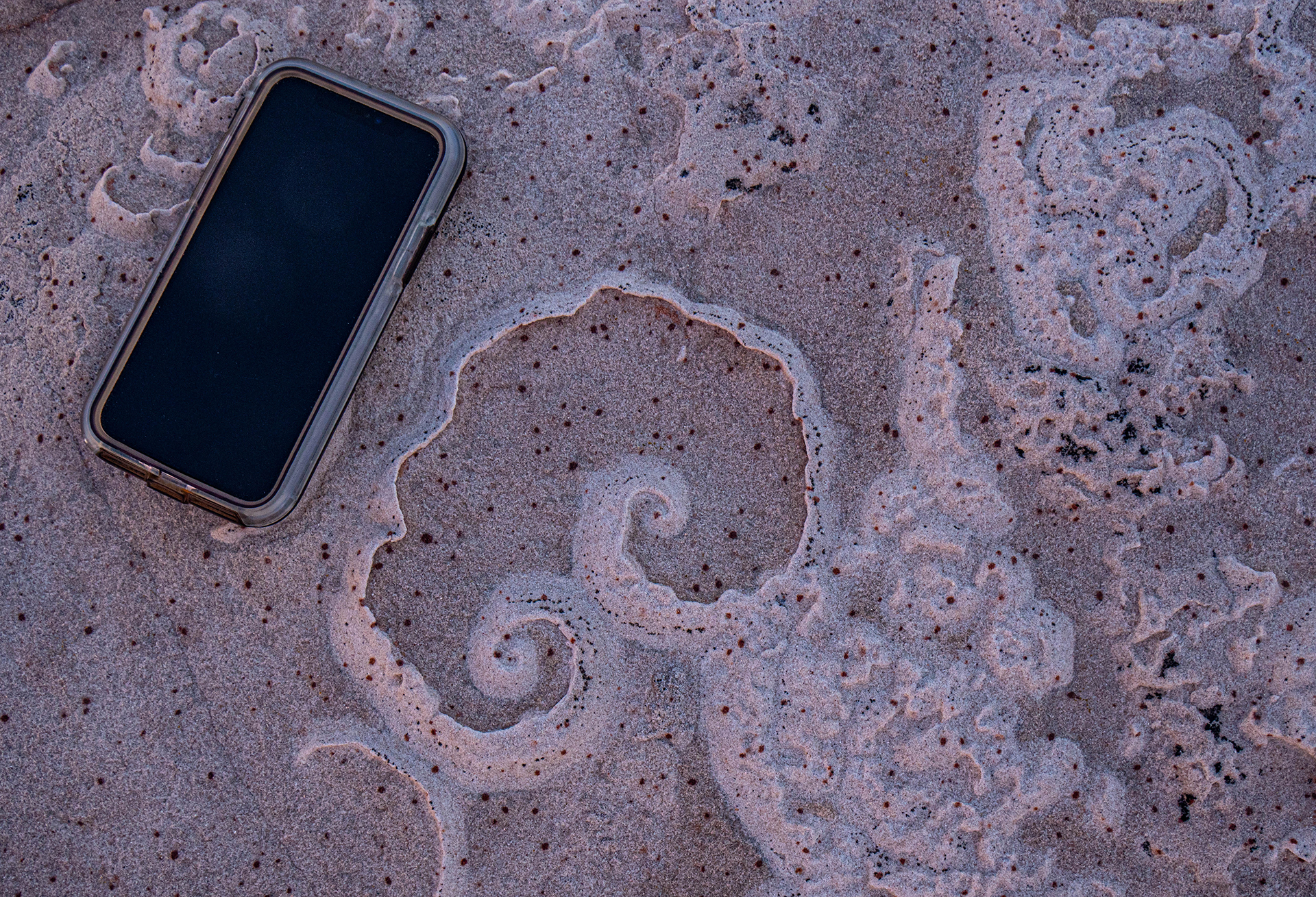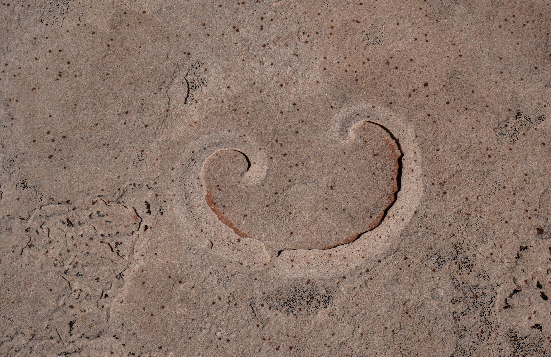April 15. We drove a few miles from the camping spot and hiked to the east side of a butte with the Domes of the Gnomes on the E side. We explored that side extensively. There is a small white pocket area, and then a very complex section of steep domes. We finished by climbing the mesa, but then getting stopped by a deep cleft, and we returned to the car on our approach trail. There was some beautiful spiral lichen in the area of the white pockets. We returned to Page via the northern route. 6.7 miles, 1200 feet climb. The lichen are perhaps in the Sarcogyne genus, I am told by an expert at Brigham Young University. A good article about sandstone lichen is at https://www.colorado.edu/asmagazine-archive/node/933. This photo shows similar lichen 15 miles away: https://fineartamerica.com/featured/lichen-incising-sandstone-coyote-butte-nhpa.html. But I have found no explanation of the spiral patterns.