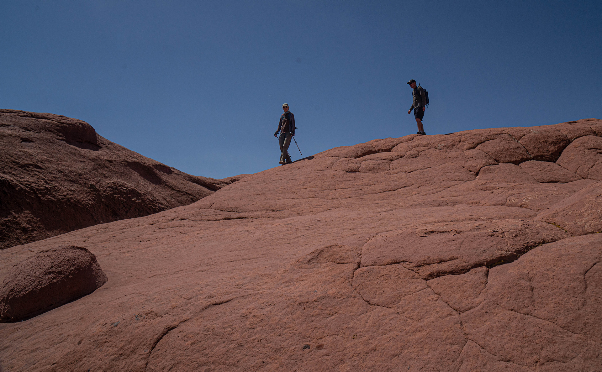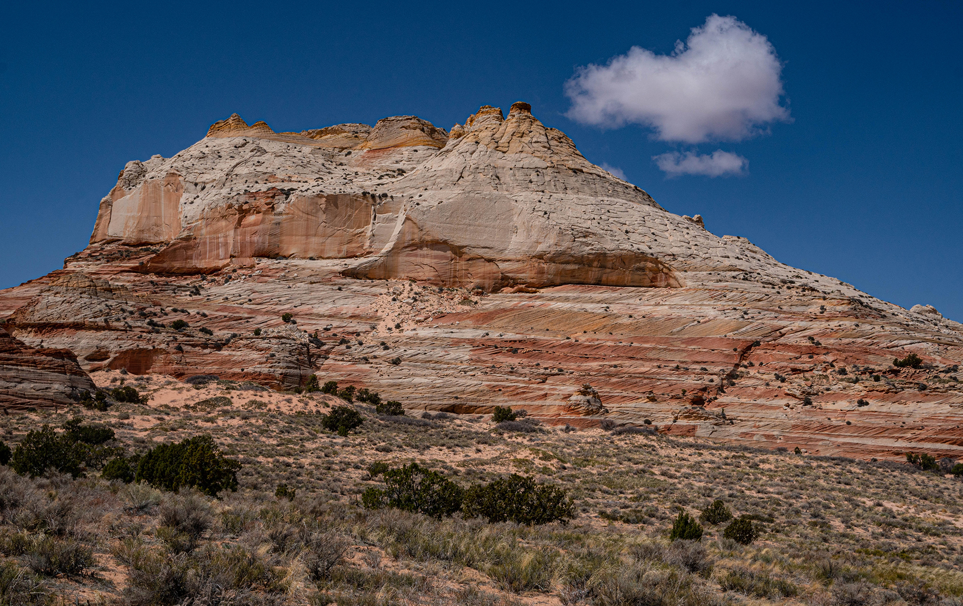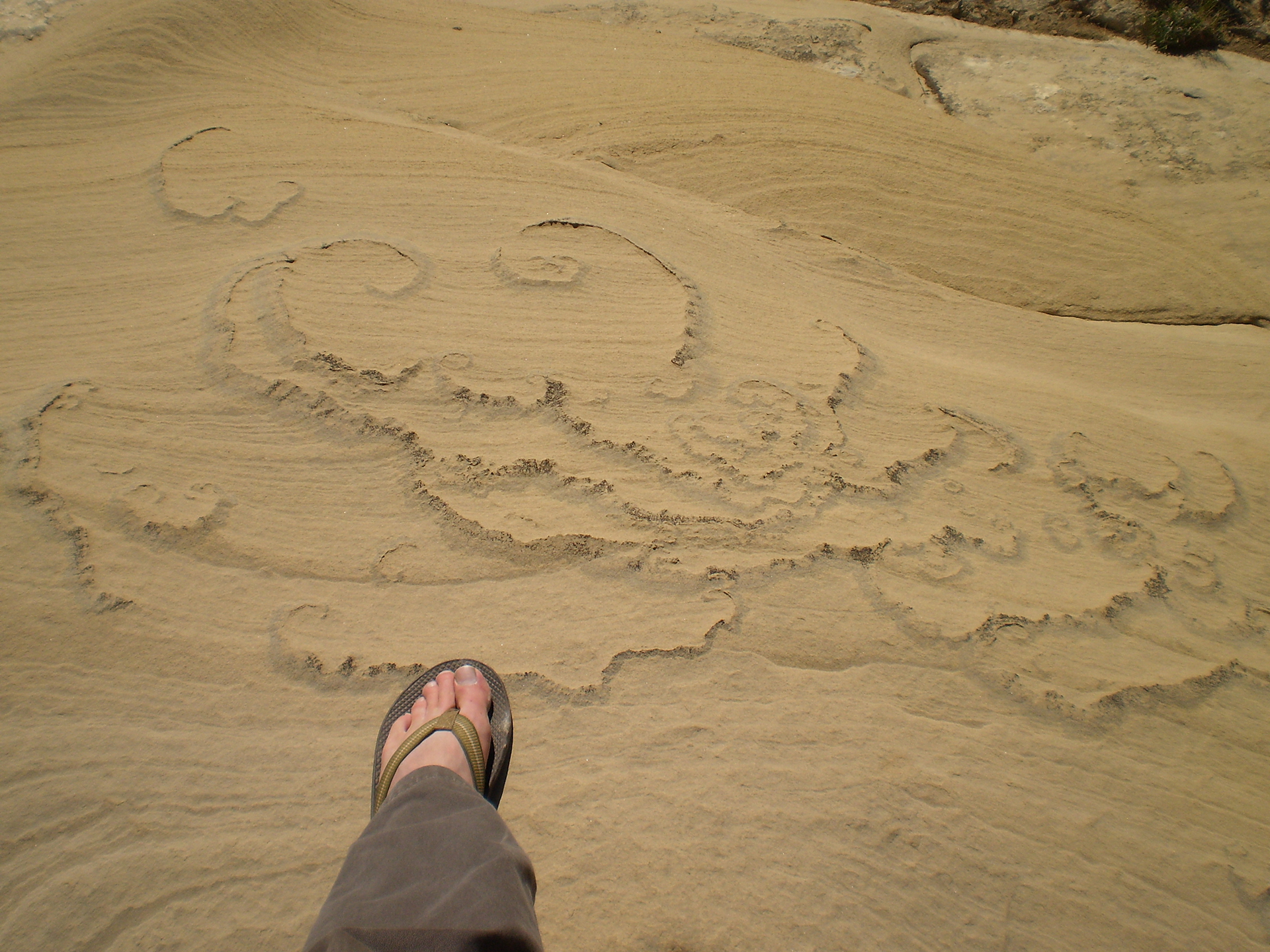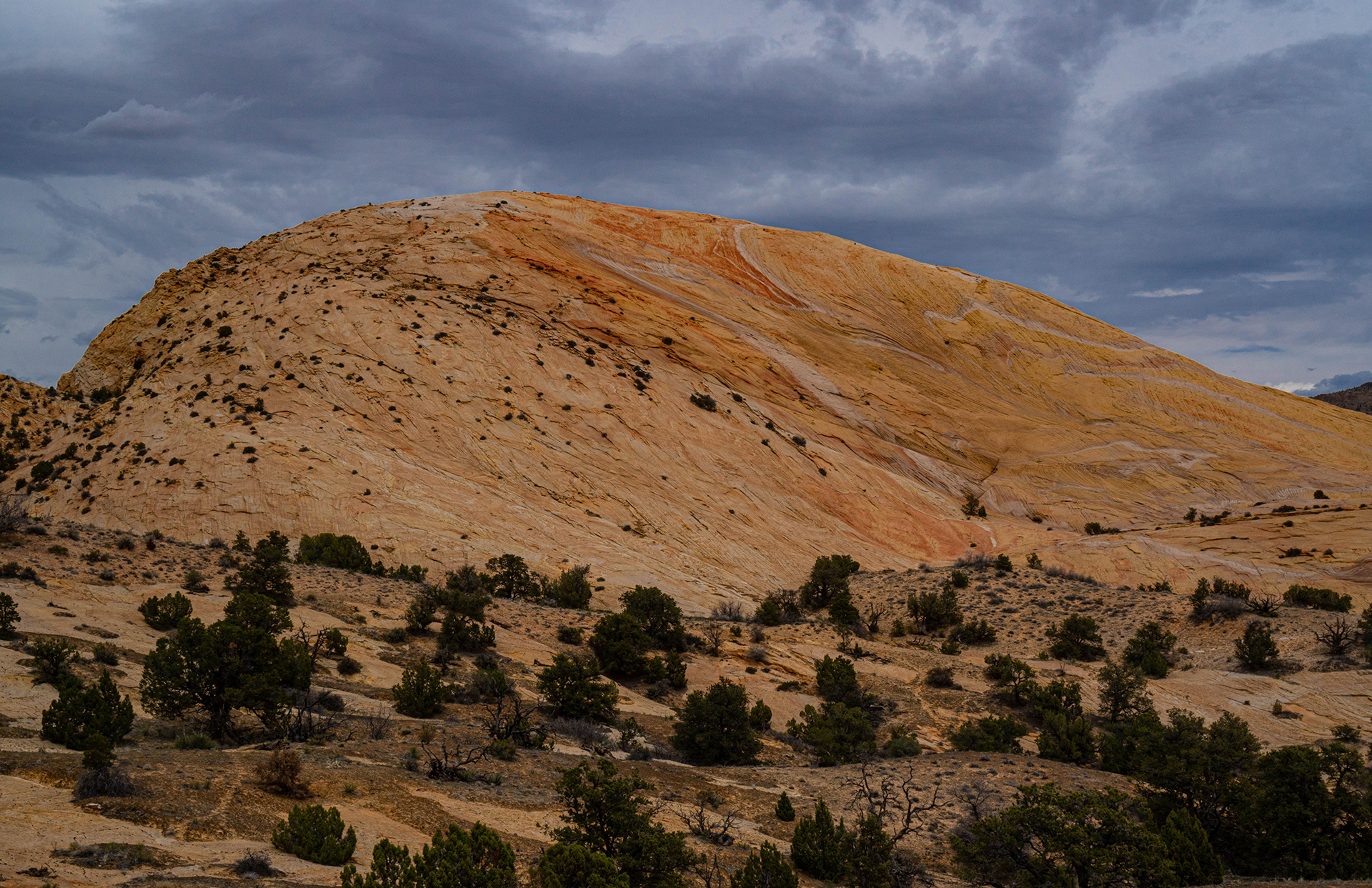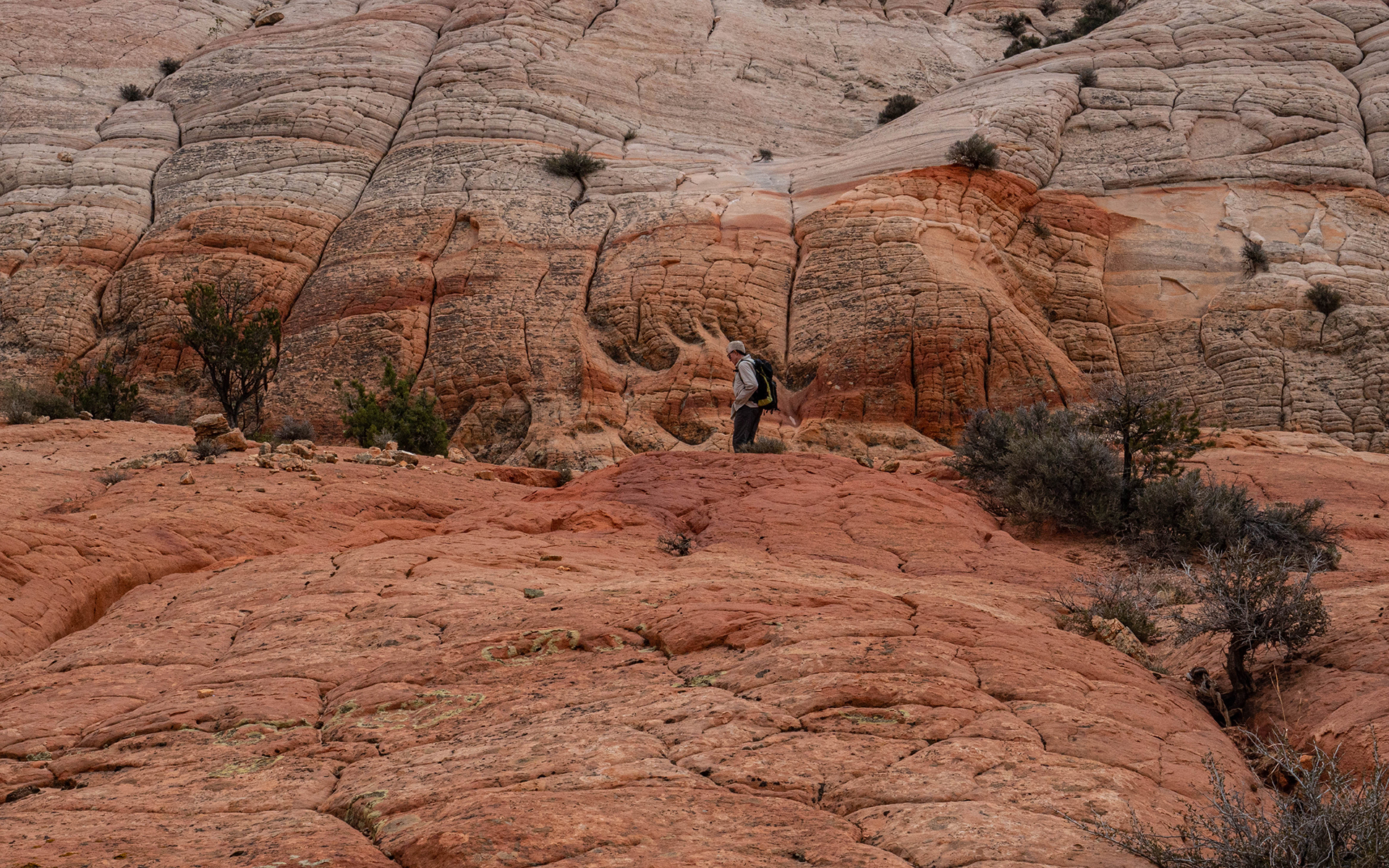 April 15. We drove a few miles from the camping spot and hiked to the east side of a butte with the Domes of the Gnomes on the E side. We explored that side extensively. There is a small white pocket area, and then a very complex section of steep domes. We finished by climbing the mesa, but then getting stopped by a deep cleft, and we returned to the car on our approach trail. There was some beautiful spiral lichen in the area of the white pockets. We returned to Page via the northern route. 6.7 miles, 1200 feet climb. The lichen are perhaps in the Sarcogyne genus, I am told by an expert at Brigham Young University. A good article about sandstone lichen is at https://www.colorado.edu/asmagazine-archive/node/933. This photo shows similar lichen 15 miles away: https://fineartamerica.com/featured/lichen-incising-sandstone-coyote-butte-nhpa.html. But I have found no explanation of the spiral patterns.