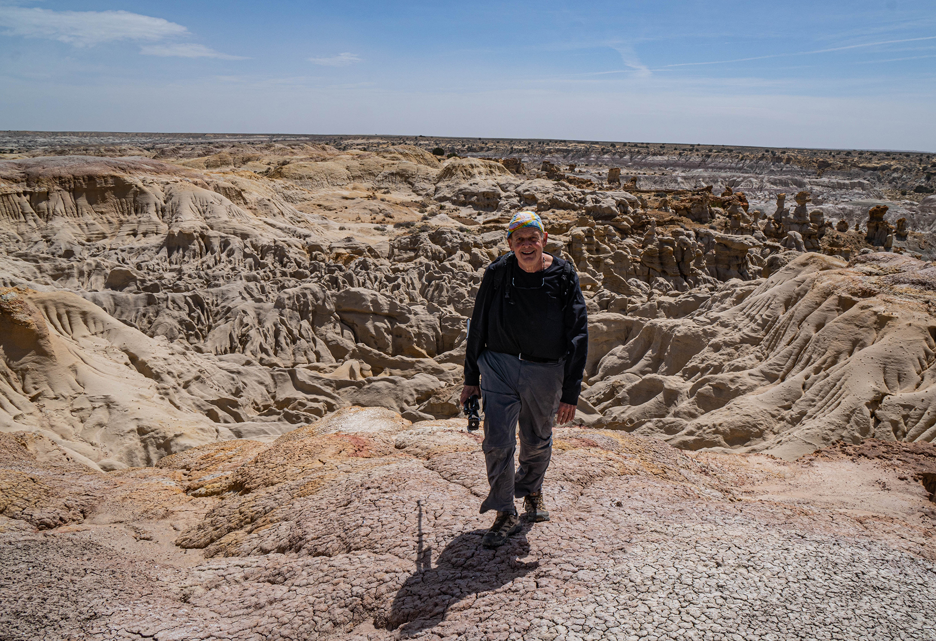 April 18: Explored the De-Na-Zin Wilderness area south of Farmington, New Mexico, with Bill and Elaine. Great hoodoos and arches and some complex impassable terrain. We saw a great Double Hoodoo, then De-Na-Zin Arch (in San José formation, then we crossed the main wash and saw an undocumented arch in the distance. Then Right Angle Arch. I think these features are San Jose Formation (caprocks) above the Nacimiento formation. (Ojo Alamo is below.) See https://pubs.usgs.gov/pp/0552/report.pdf.