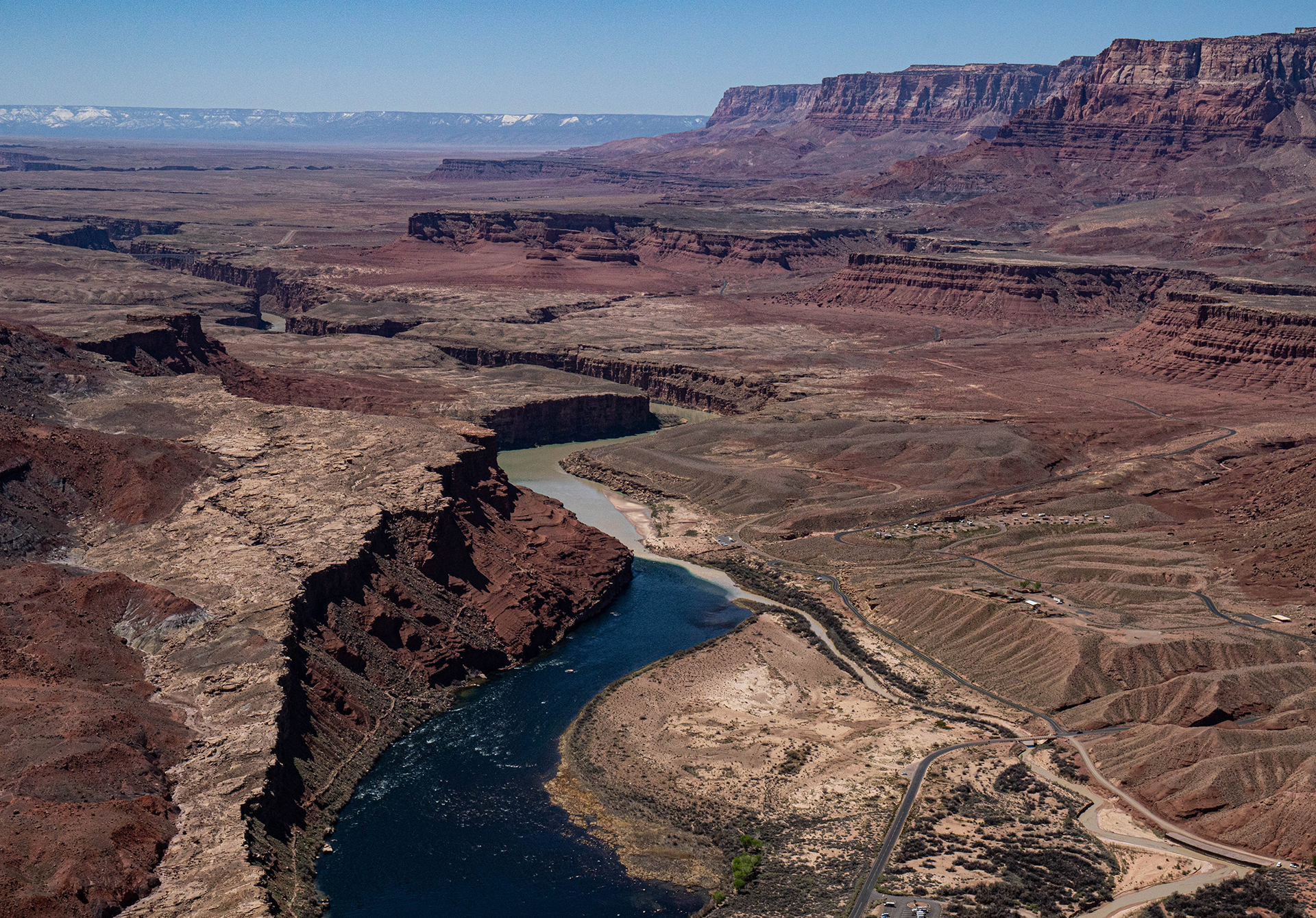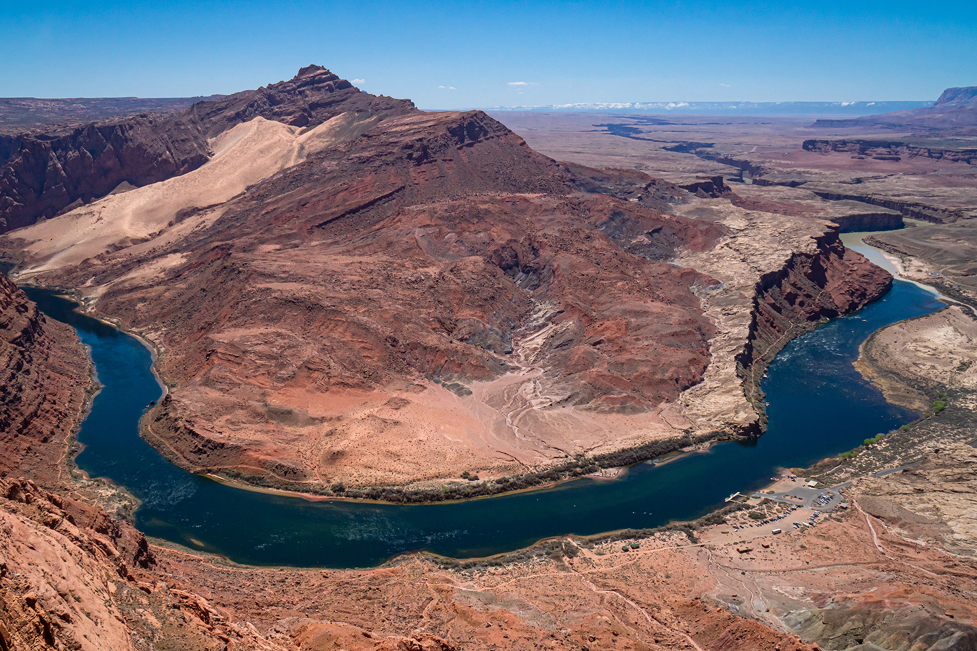 April 11. Spencer Trail at Lee’s Ferry, and a little exploring at the top. 2000 feet climb; 6 miles; Katie, Janet, Dave, me. Highlights: View of the silt-filled, greenish Paria River entering the Colorado River, which was clear. That clarity is due to the pure water coming past Glen Canyon Dam. There was a great view of a horseshoe in the Colorado River—the “Last Horseshoe”—with the long view of the river cutting the vast plain to create Marble Canyon. And the snow-covered Kaibab Plateau in the distance. From the top we saw a group of five bighorn sheep on a lower shelf.