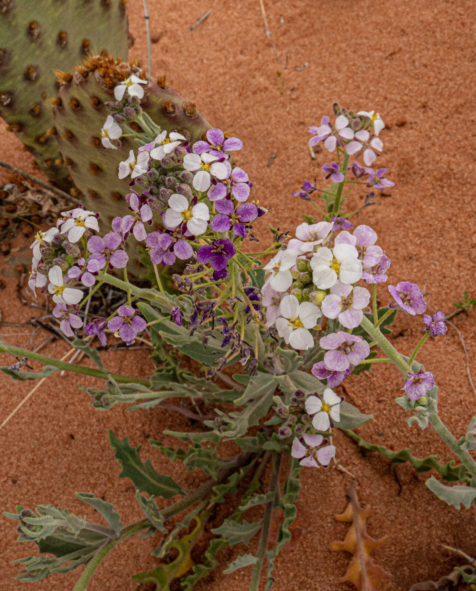 April 12. Katie is sick. Dave, Janet, Ian and I went to Thousand Pockets, using a rented Jeep. Highlights: 2-toned (white and purple) tourist plant (aka, spectacle pod flower). The pockets atop a high mesa were very nice. We then headed west to a different mesa, but there was nothing interesting there and we took an intricate route down steep terrain to get back to the car. 6 miles, 1300 feet climb.