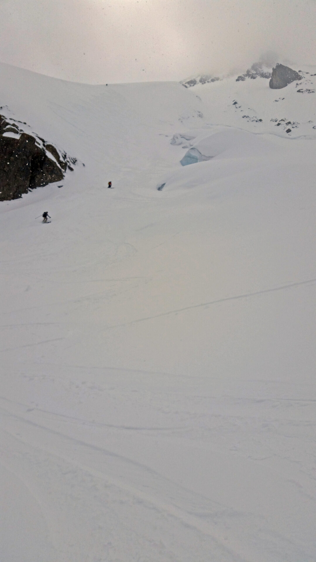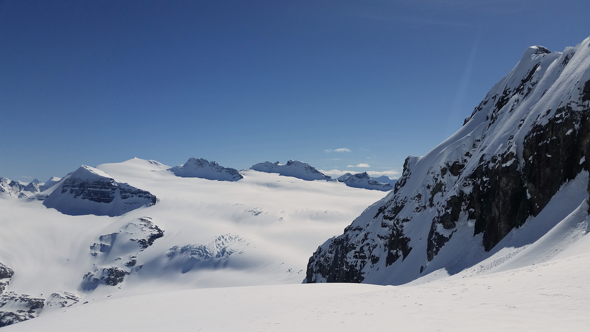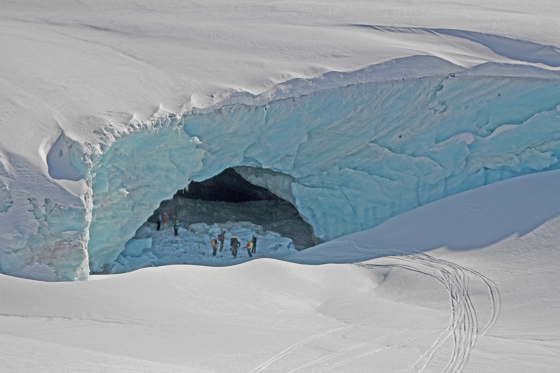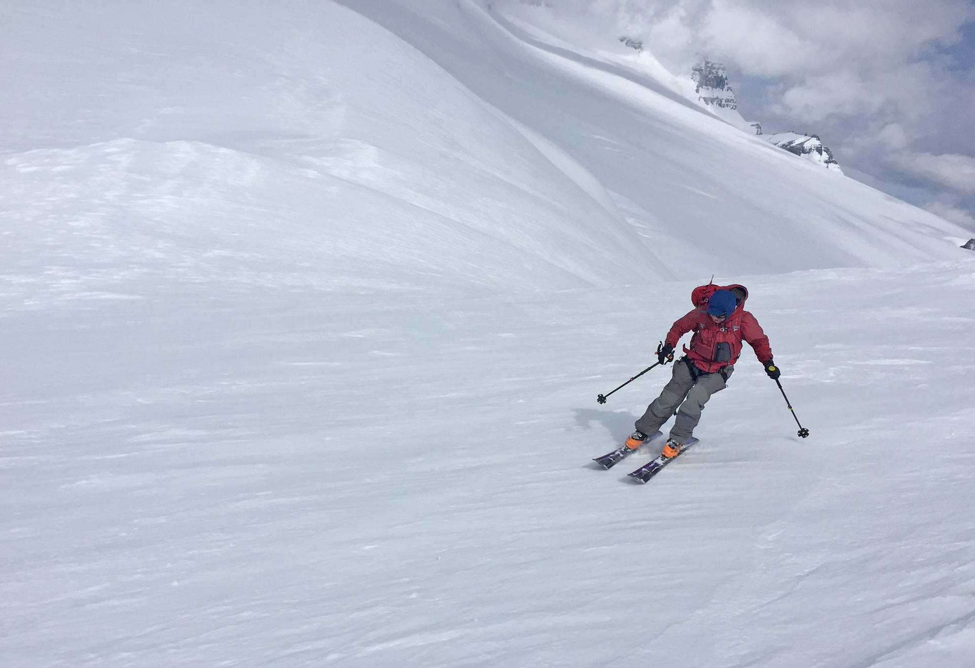 Sunday April 10, 2016. We flew in via Alpine Helicopters in the Bell 212, the large one (and same machine we used in 2013 at Oasis Lake). Perfect flying weather. We flew wonderfully close to the Arras banana couloirs. We skied up the southernmost Division basin where we had a superb view of Forbes, descended on perfect corn, and then climbed and skied half of the middle Division basin in excellent corn snow. Hot. We also visited the ice cave we had found in 2003. And also a new ice tunnel very close to the Mons Hut.