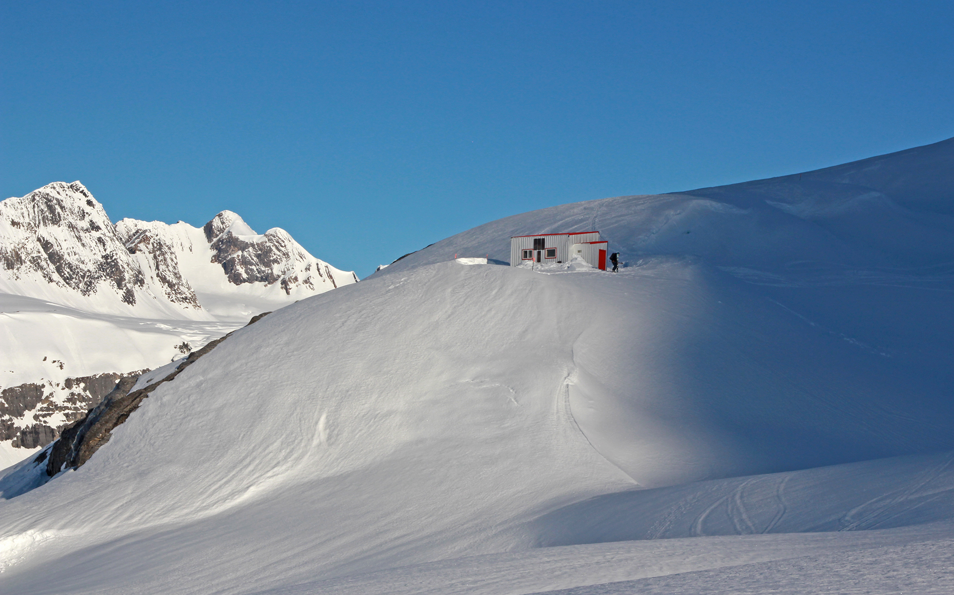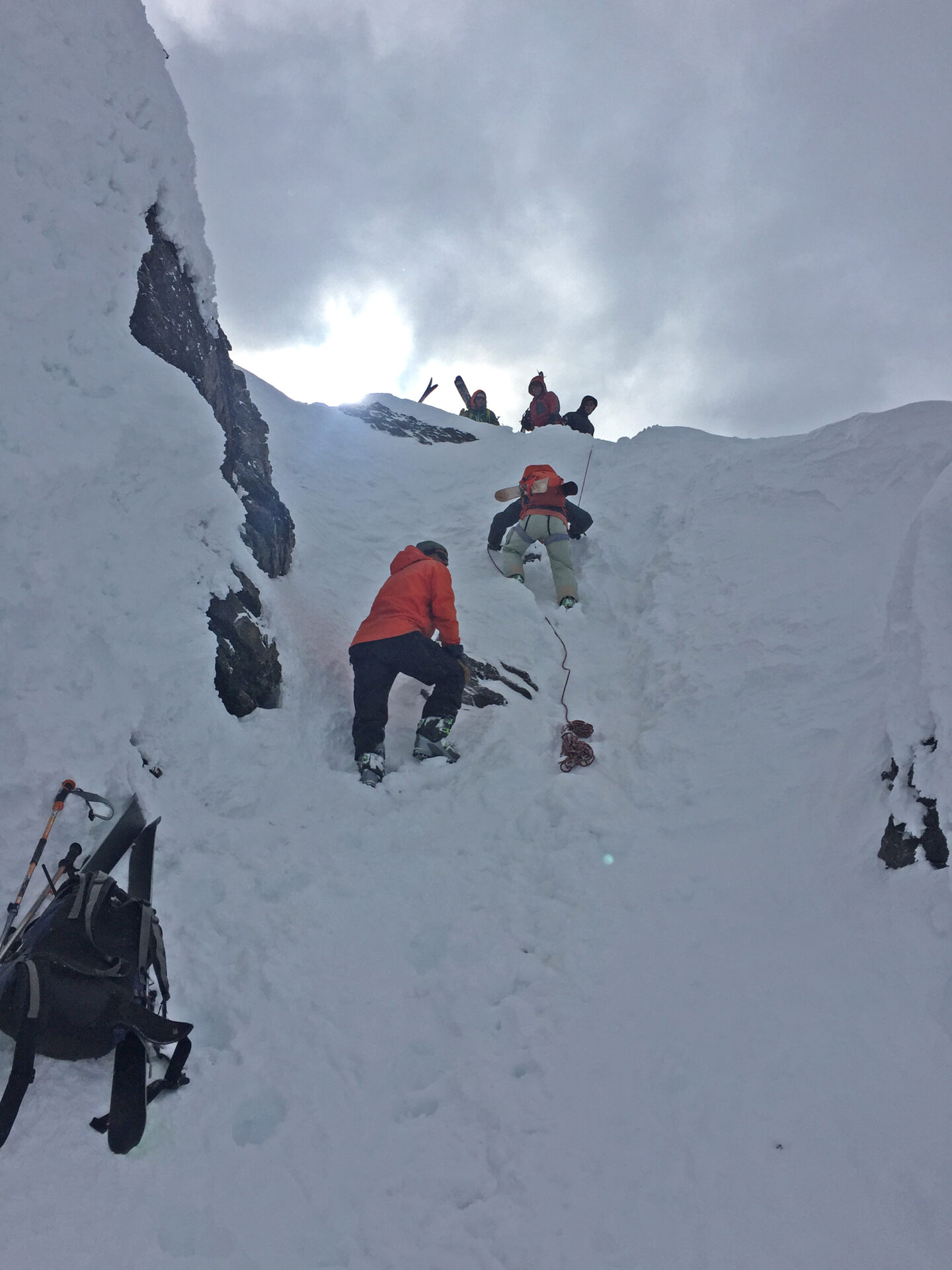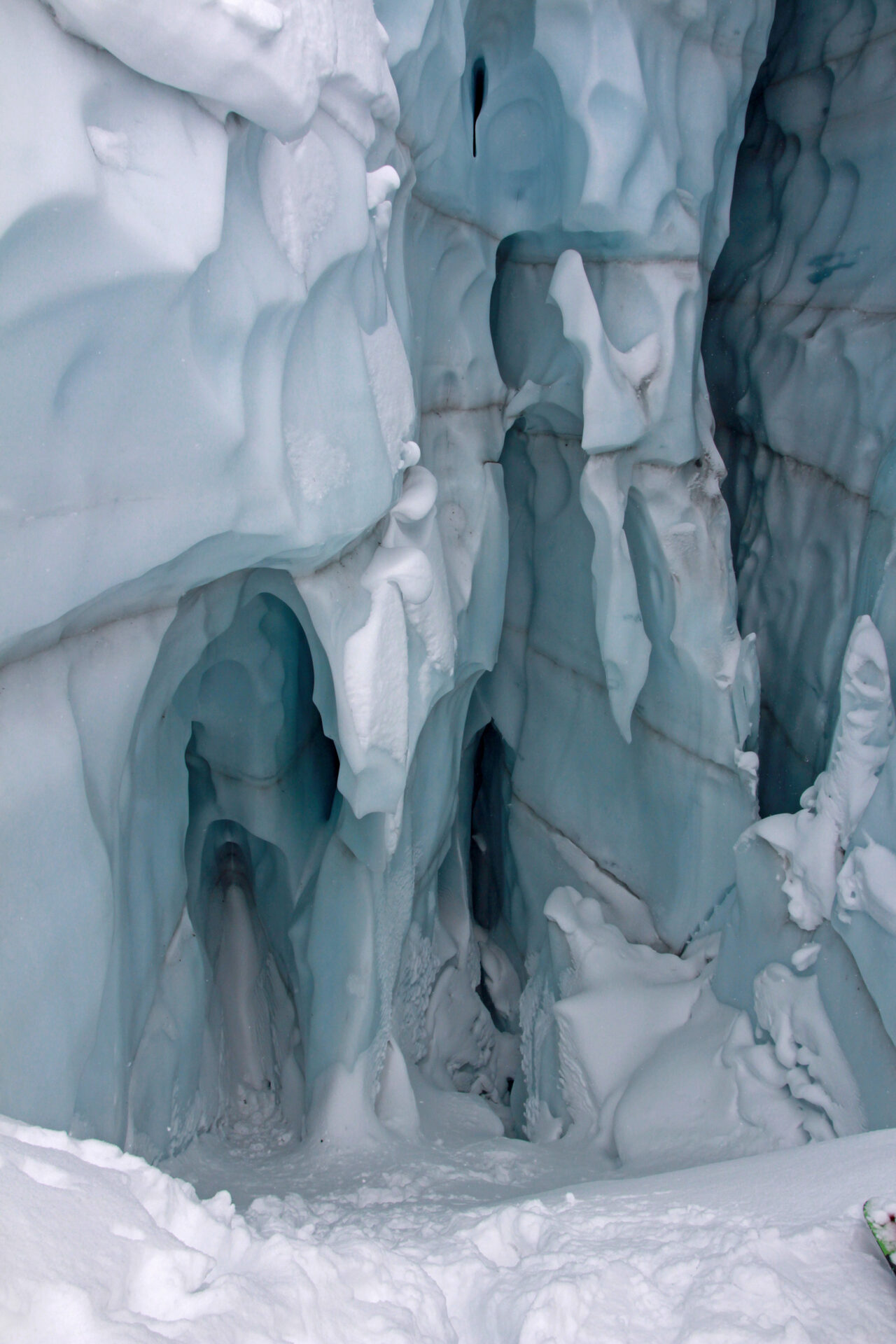 Sunday April 10, 2016. We flew in via Alpine Helicopters in the Bell 212, the large one (and same machine we used in 2013 at Oasis Lake). Perfect flying weather. We flew wonderfully close to the Arras banana couloirs. We skied up the southernmost Division basin where we had a superb view of Forbes, descended on perfect corn, and then climbed and skied half of the middle Division basin in excellent corn snow. Hot. We also visited the ice cave we had found in 2003. And also a new ice tunnel very close to the Mons Hut.