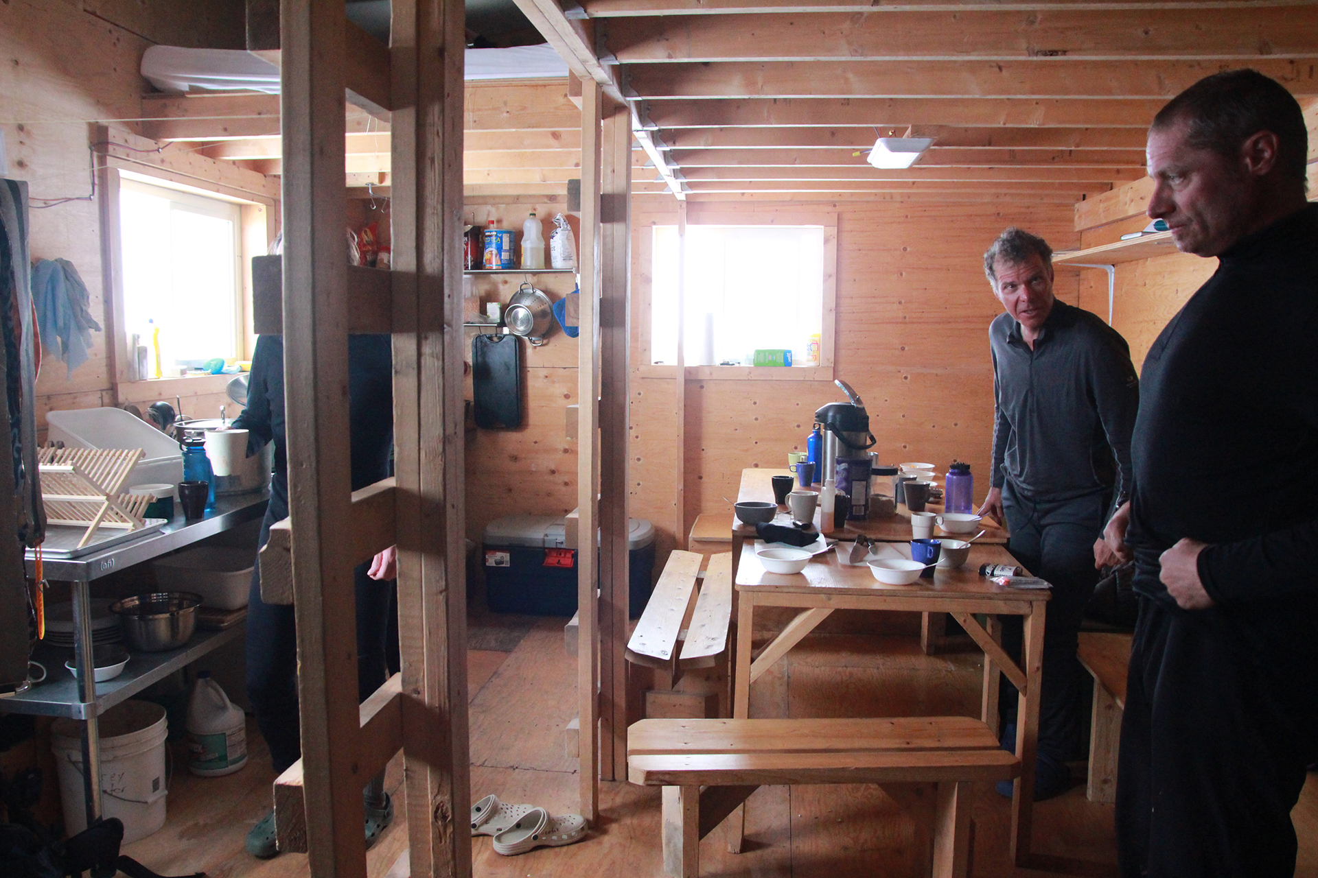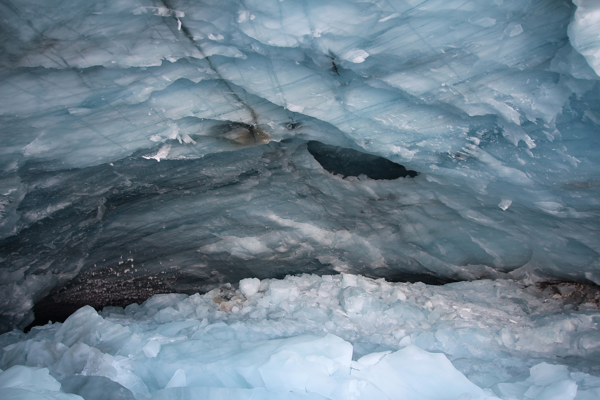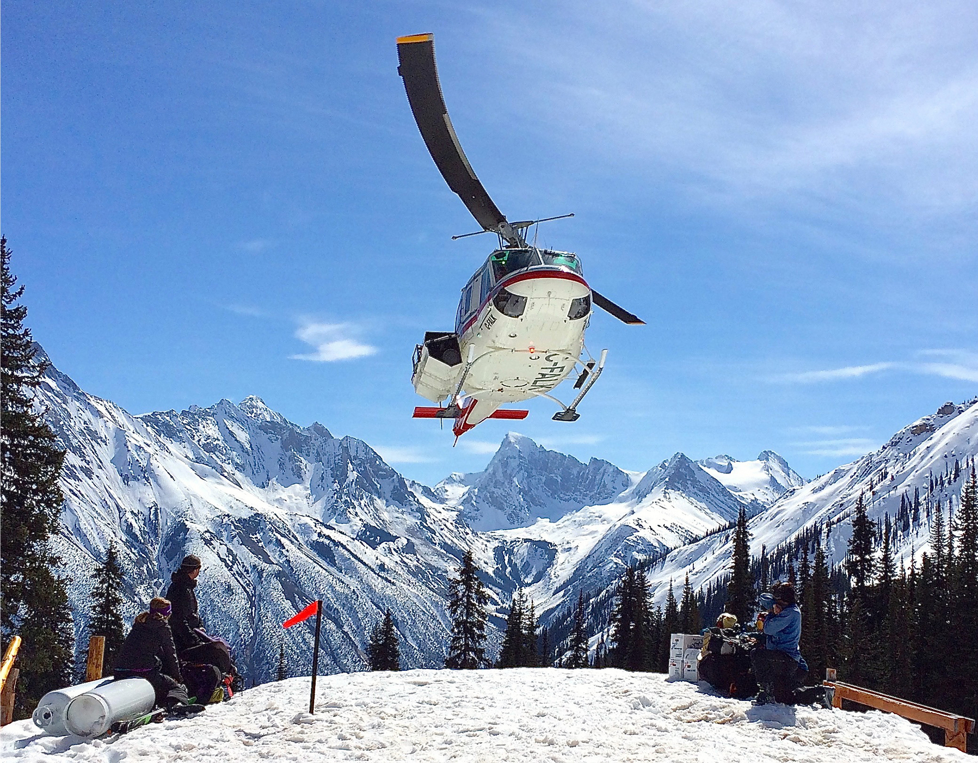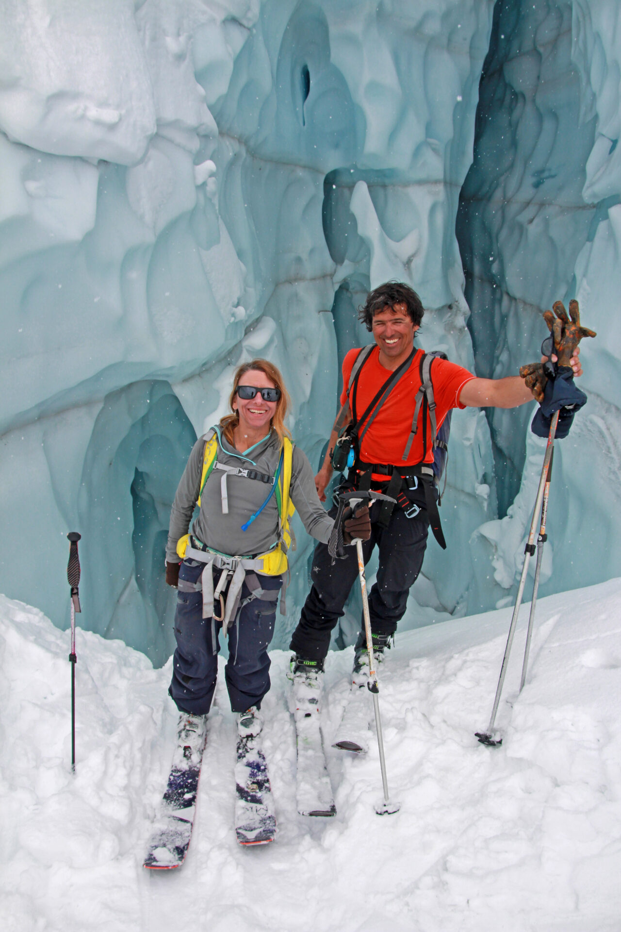 Sunday April 10, 2016. We flew in via Alpine Helicopters in the Bell 212, the large one (and same machine we used in 2013 at Oasis Lake). Perfect flying weather. We flew wonderfully close to the Arras banana couloirs. We skied up the southernmost Division basin where we had a superb view of Forbes, descended on perfect corn, and then climbed and skied half of the middle Division basin in excellent corn snow. Hot. We also visited the ice cave we had found in 2003. And also a new ice tunnel very close to the Mons Hut.