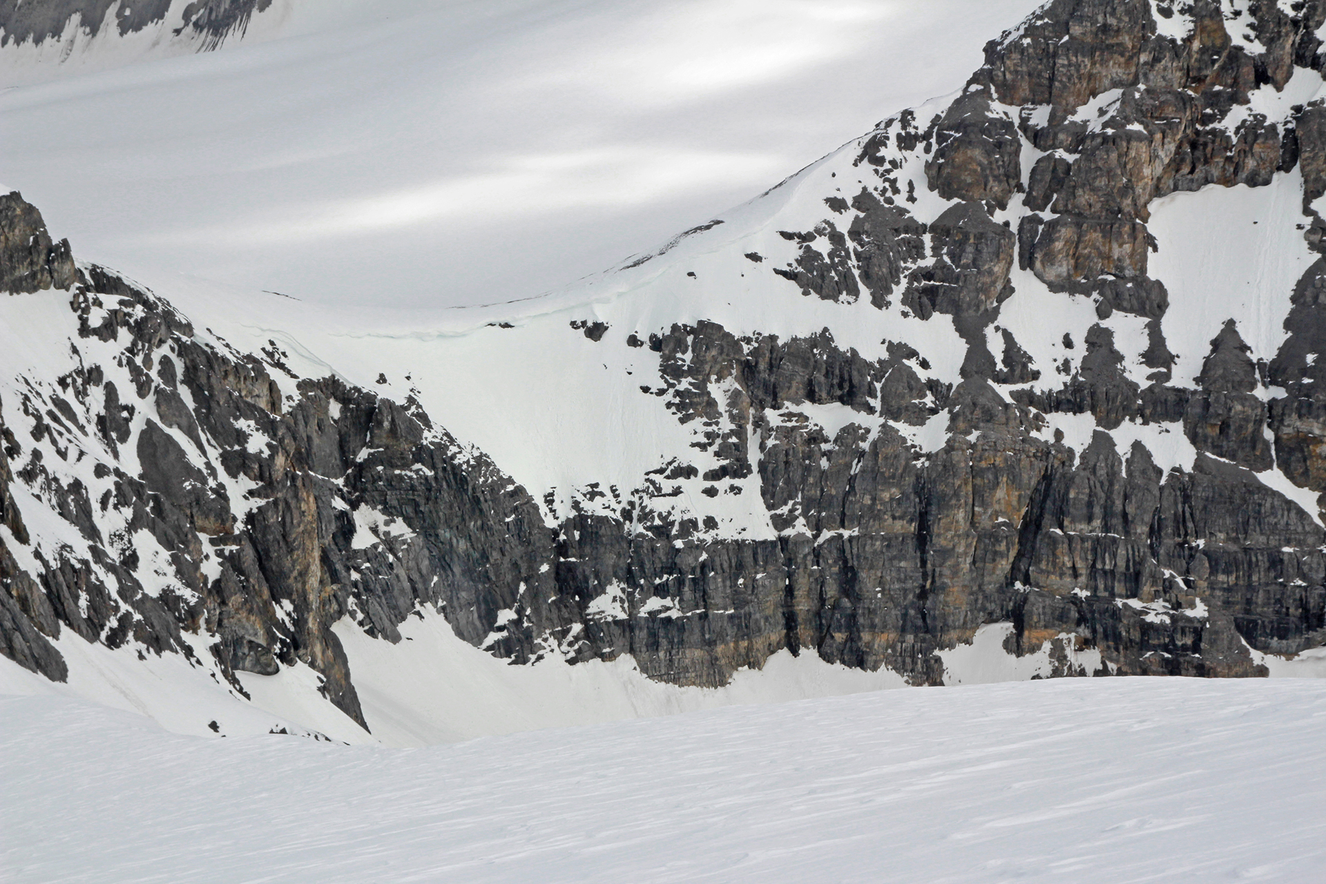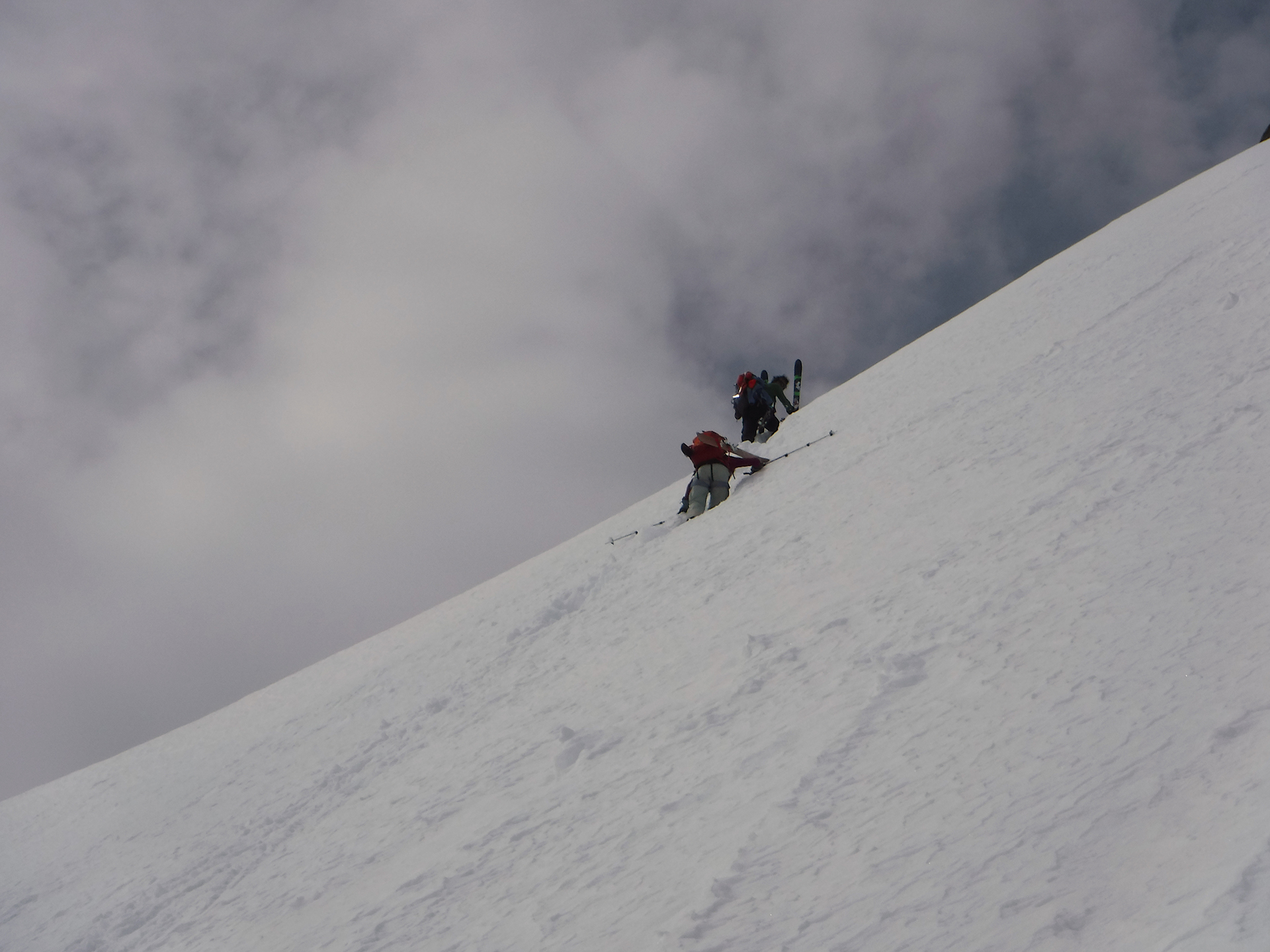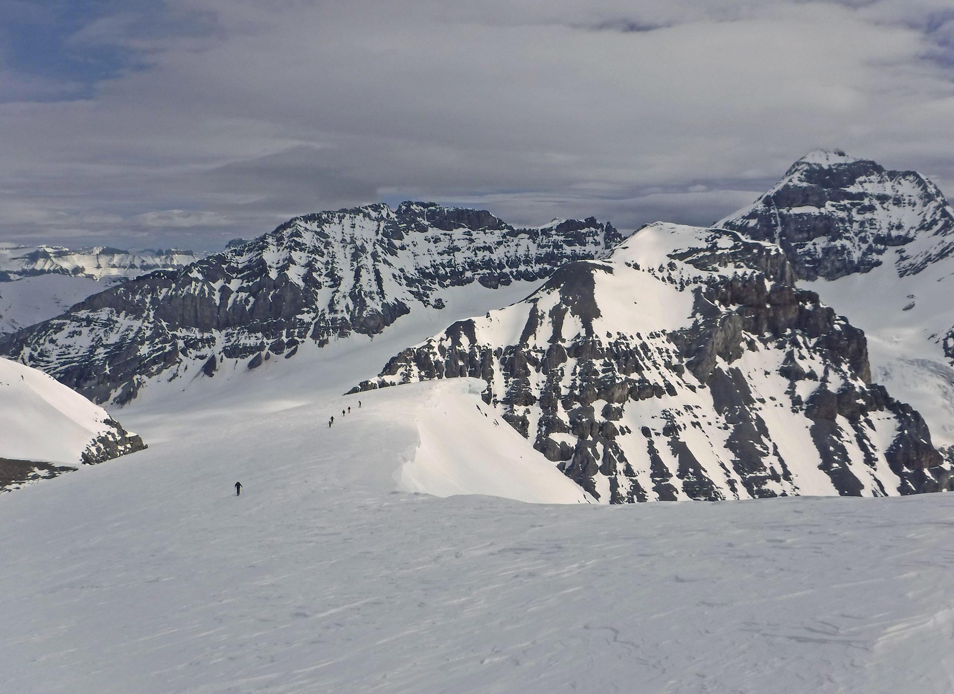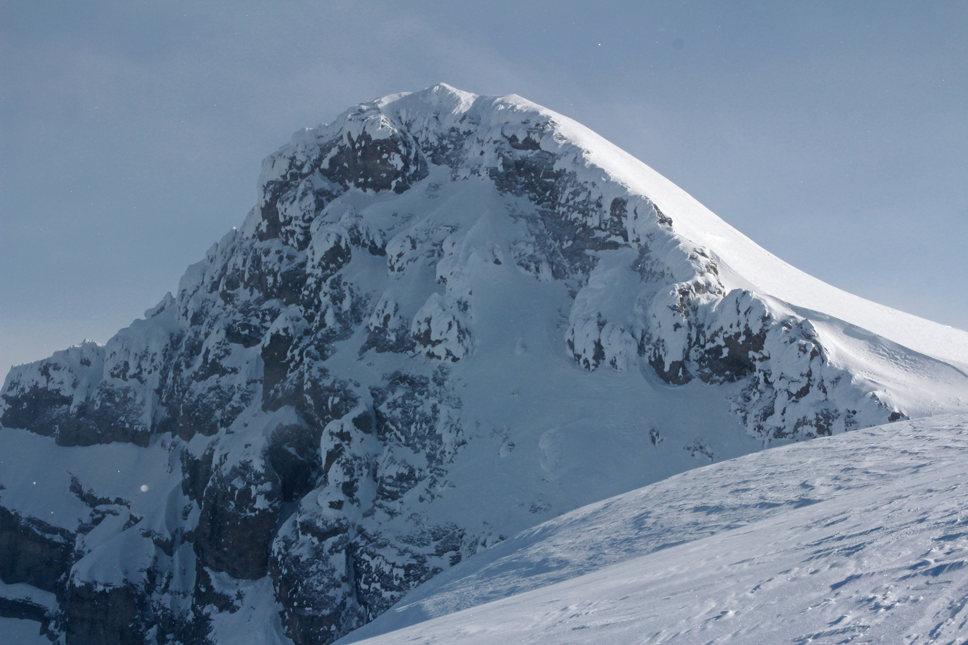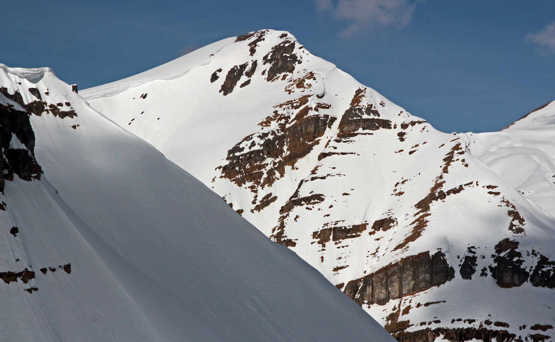 April 11. To Cambrai summit (10282 feet) on gentle snow slopes, then around Messines. Got a great view of the famous Mons rappel we did in 2003. Finished via the east shoulder of Mons, which was icy and difficult for me. My new knee does not like the stress of difficult conditions.