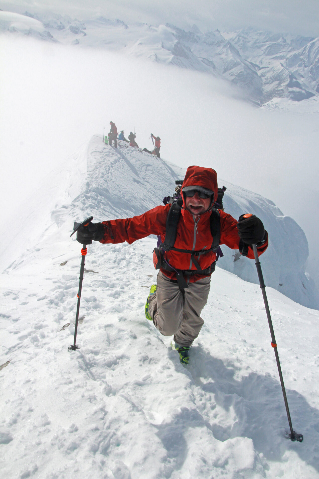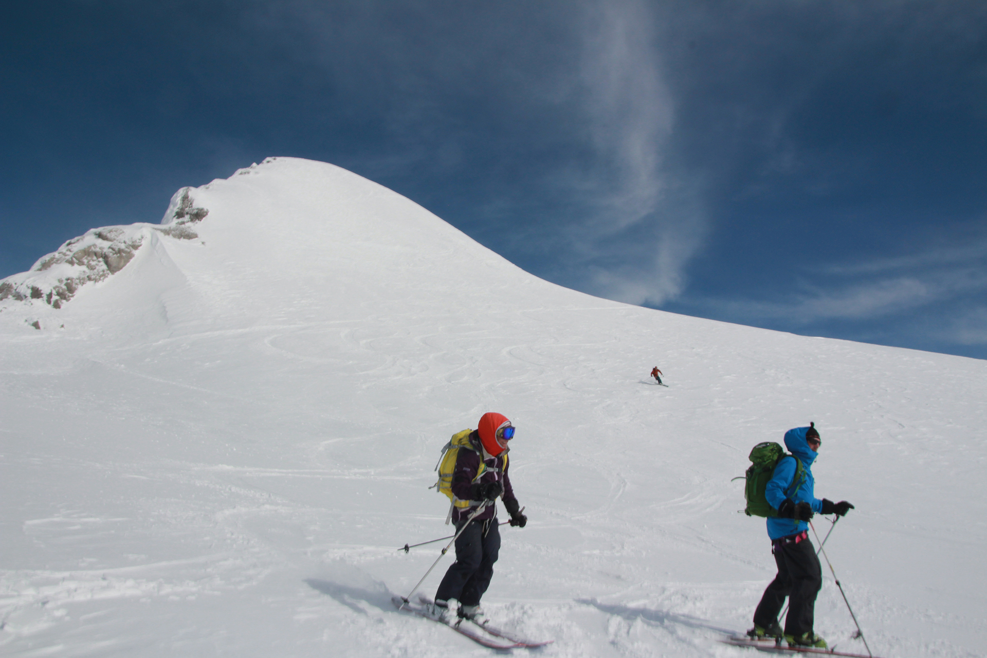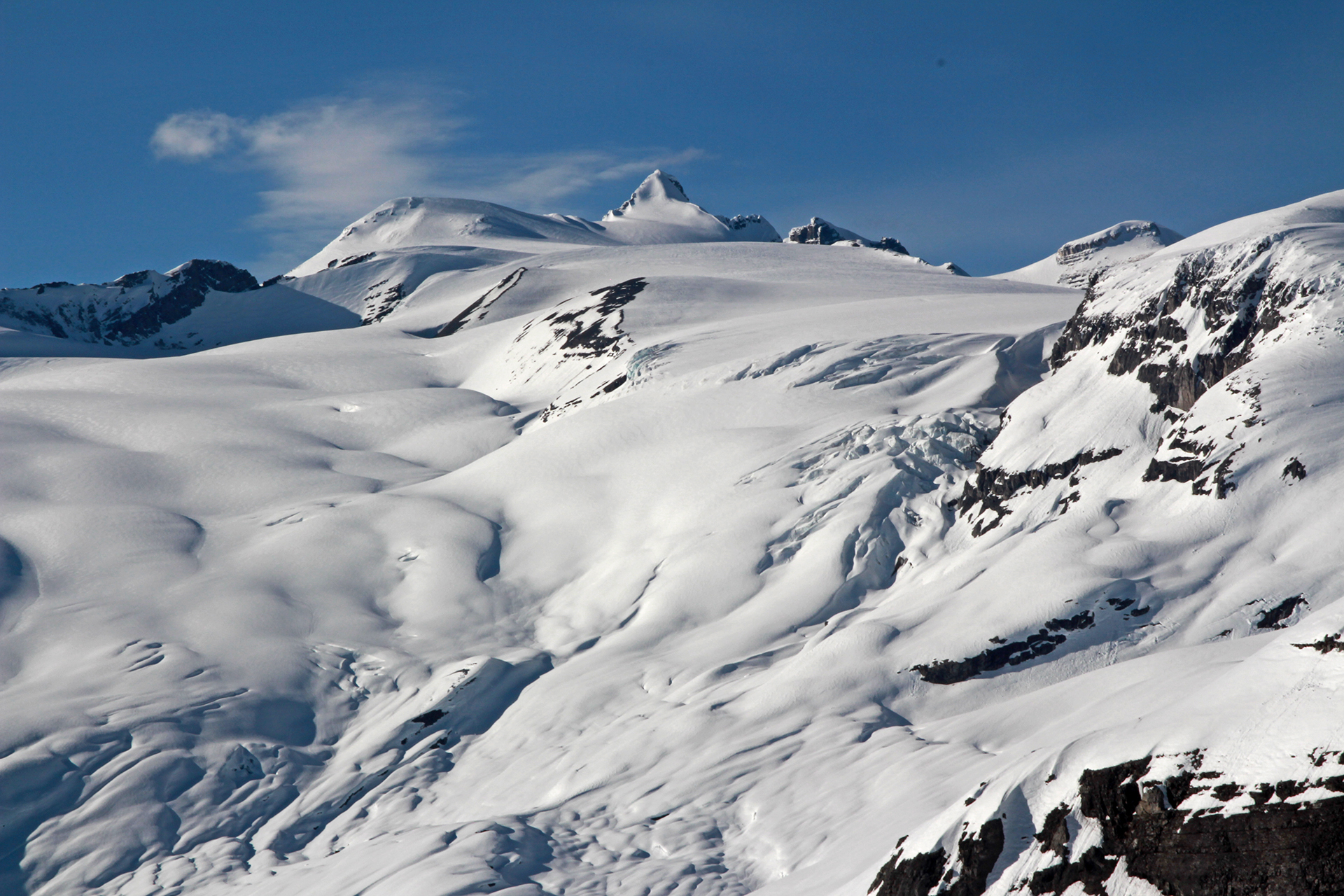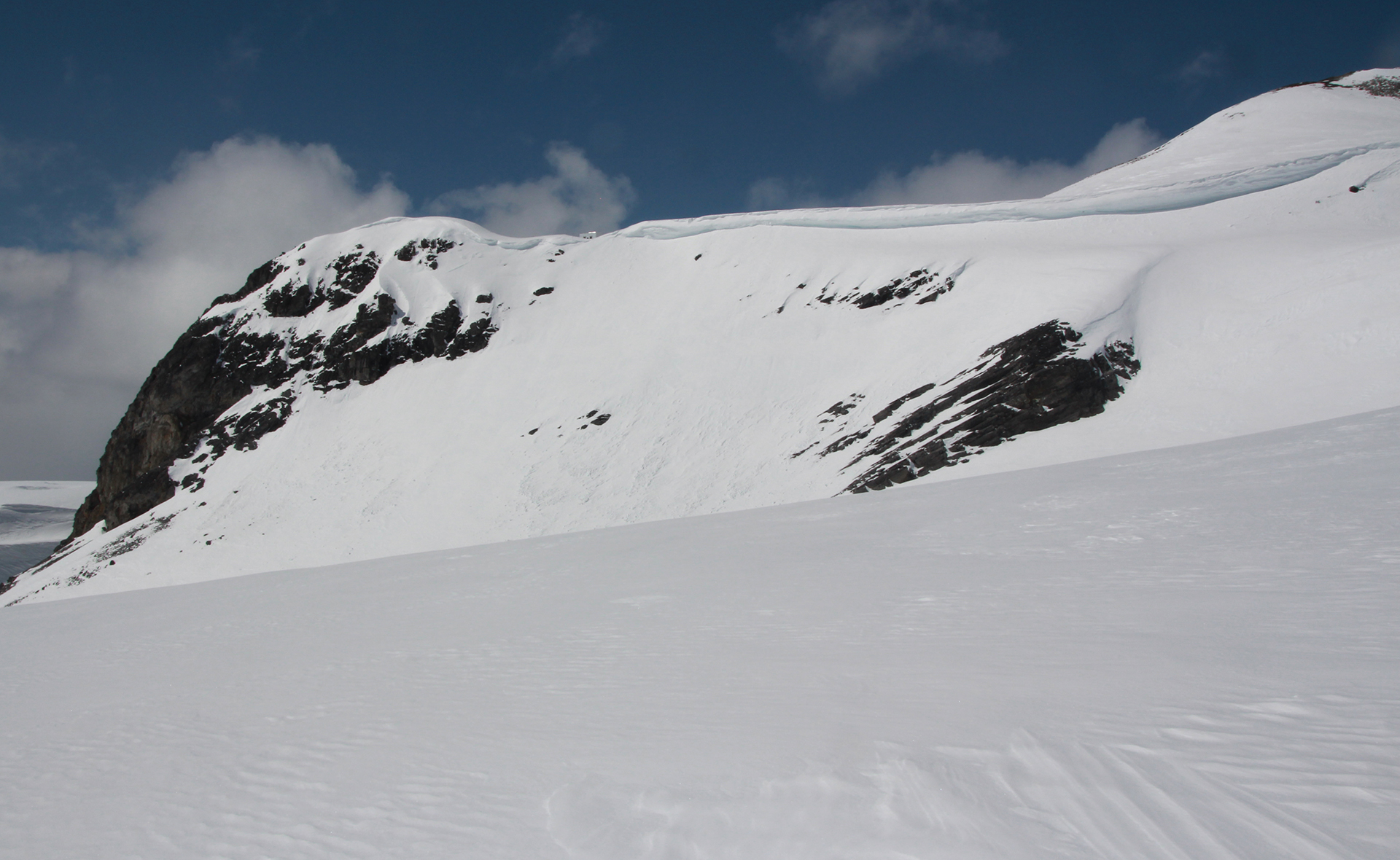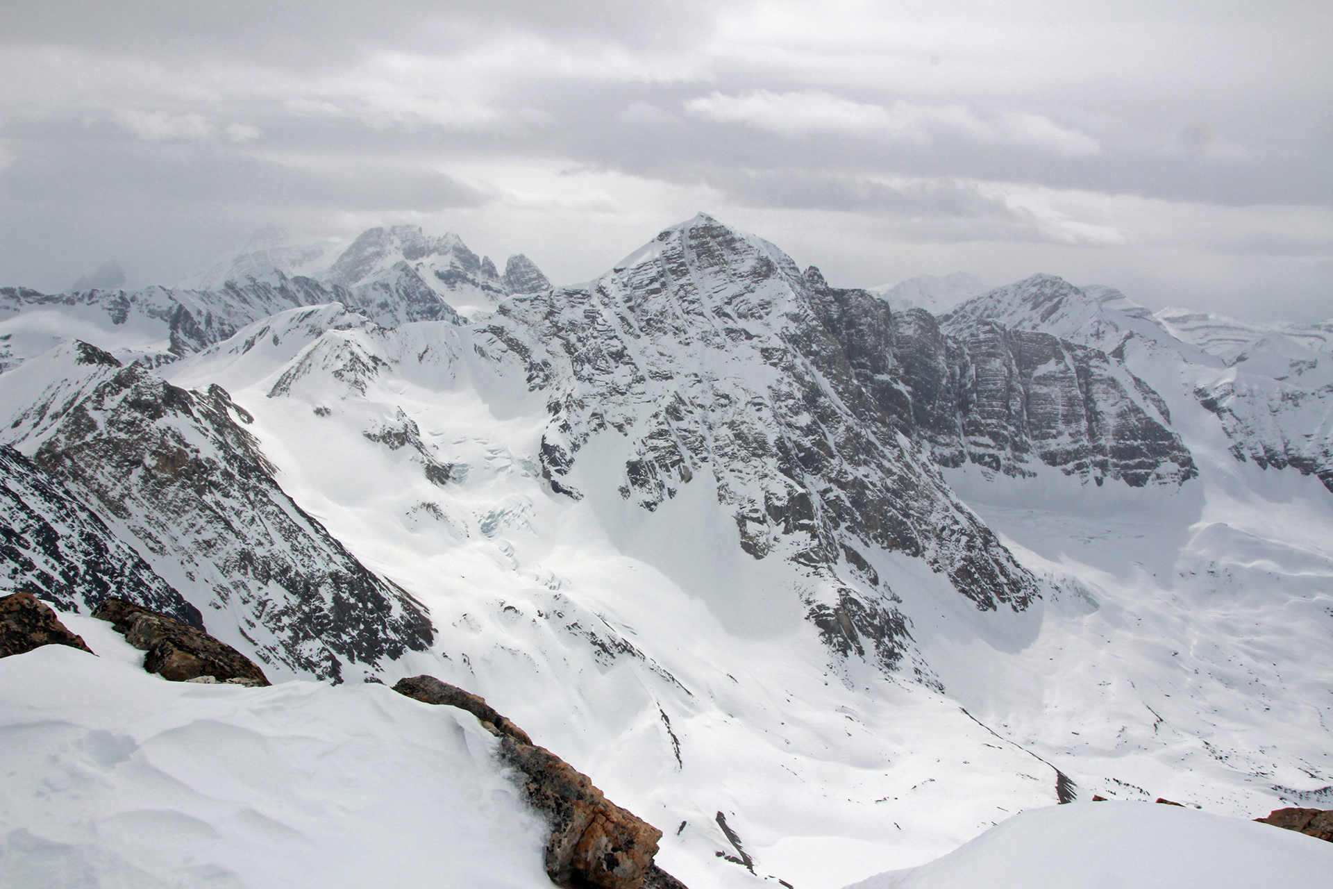 April 11. To Cambrai summit (10282 feet) on gentle snow slopes, then around Messines. Got a great view of the famous Mons rappel we did in 2003. Finished via the east shoulder of Mons, which was icy and difficult for me. My new knee does not like the stress of difficult conditions.