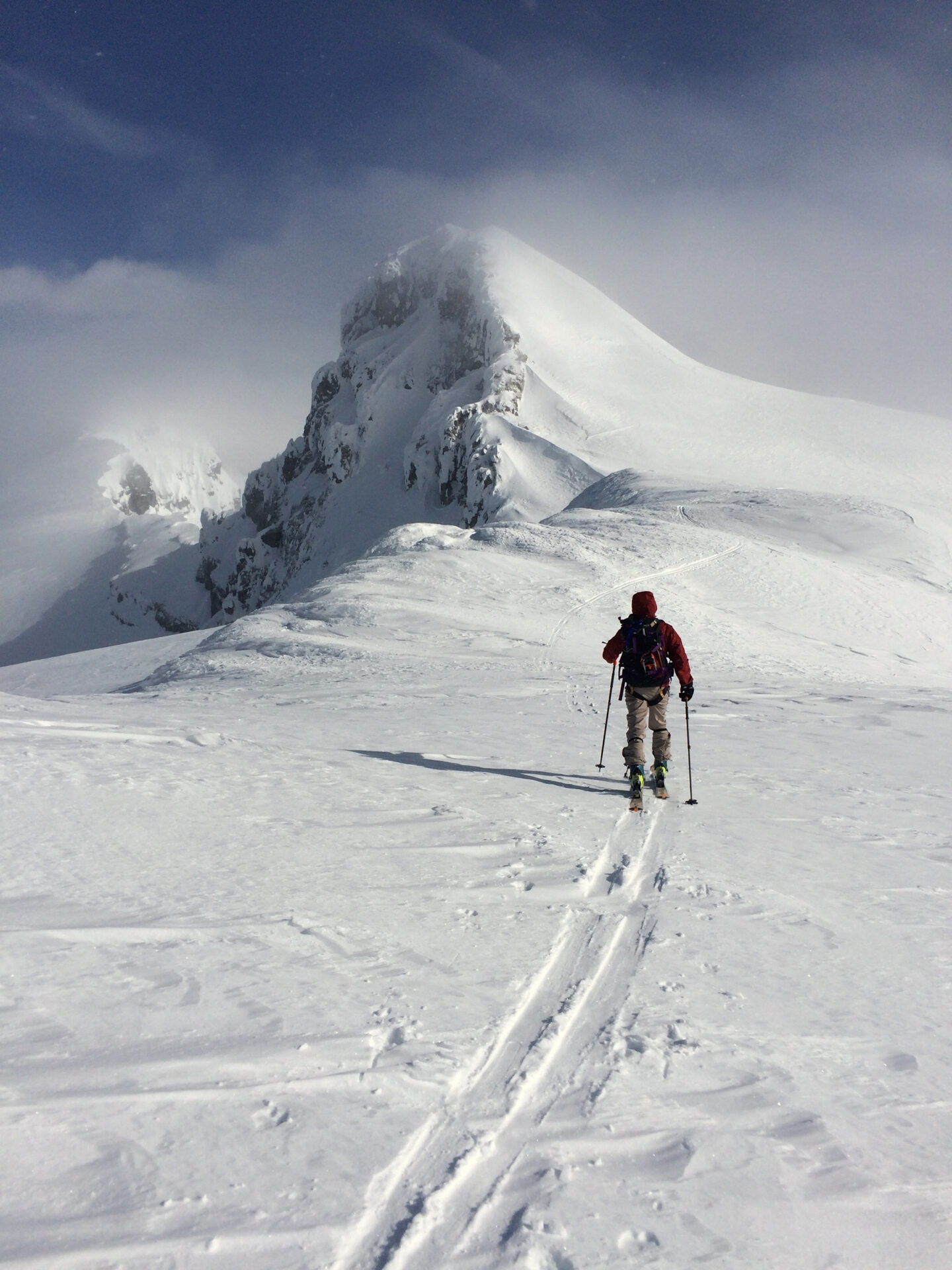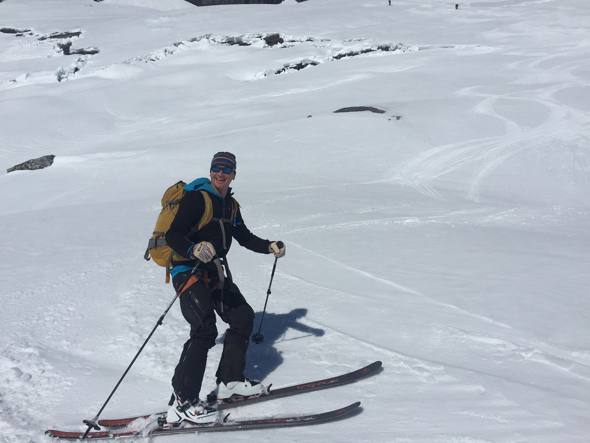 Thursday April 14. We started the day with the 2000-foot climb of Lyell 5 by an efficient route around the west side. This provided a great view of the peak’s rocky side. The summit area this year was very different than 2012 and we could easily walk the final ridge line to the top, though not everyone did so. The ski down the face was fine in old powder, as was the rest of the descent to the hut. Then we descended to the bottom of Tivoli and a bootpack got us to the very pretty upper basin and over to Tivoli Shoulder. But the descent of the shoulder was icy, and difficult for me. A long day. All were happy to spread out and enjoy the comforts of the Lodge: sauna, shower, beds. Larry has expanded the lodge, and the new kitchen is remarkable. Jonny Buckets had his guitar at the Lodge, and his playing was appreciated.